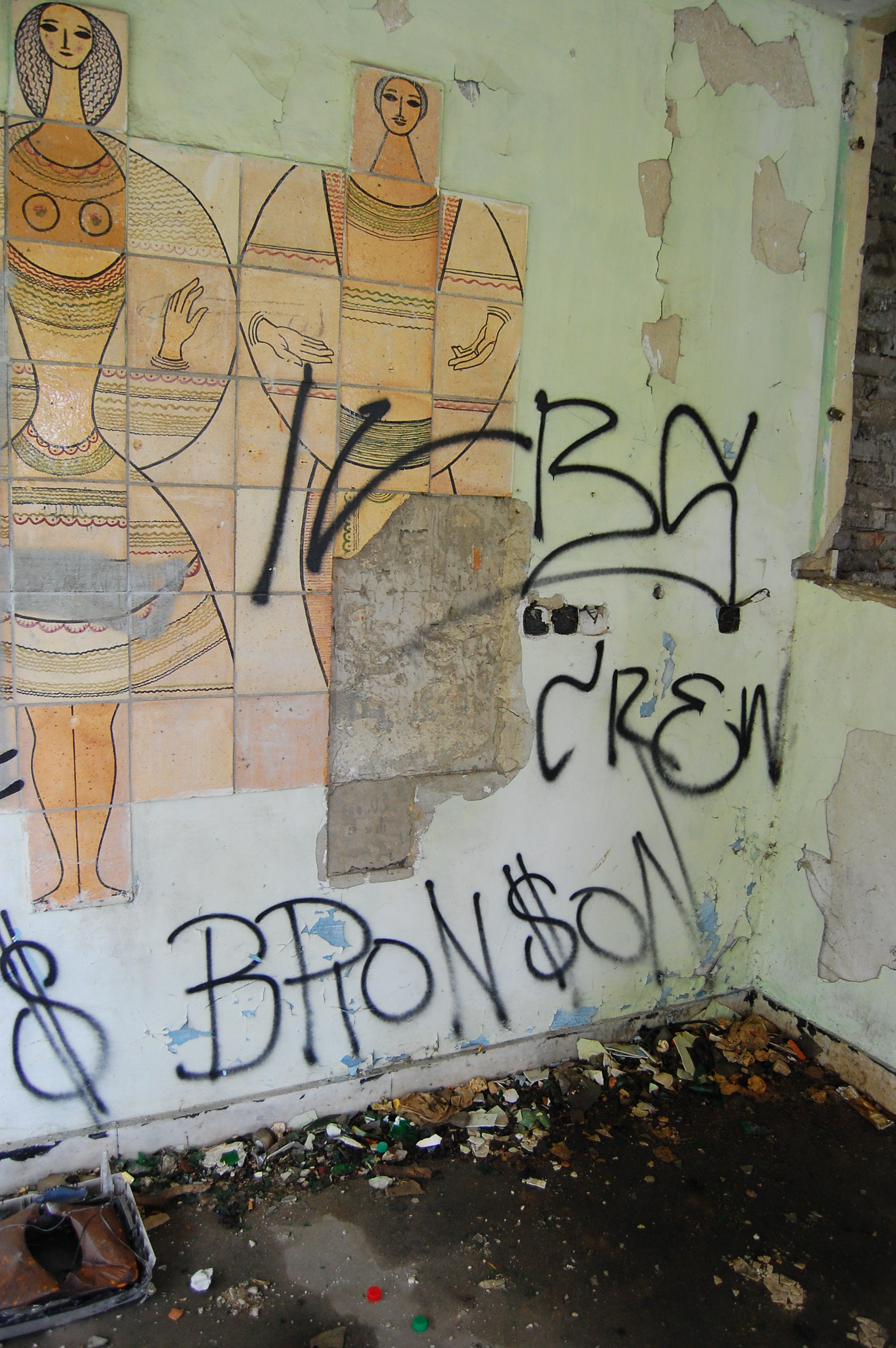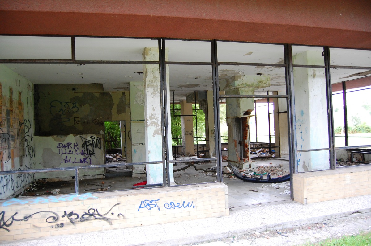 A főbejáratnál, az épület könnyen elérhető traktusában mindez, ha lehet, még tovább fokozódik. Kitört ablaküvegek, kosz, szemét, romok, falfirkák mindenütt.