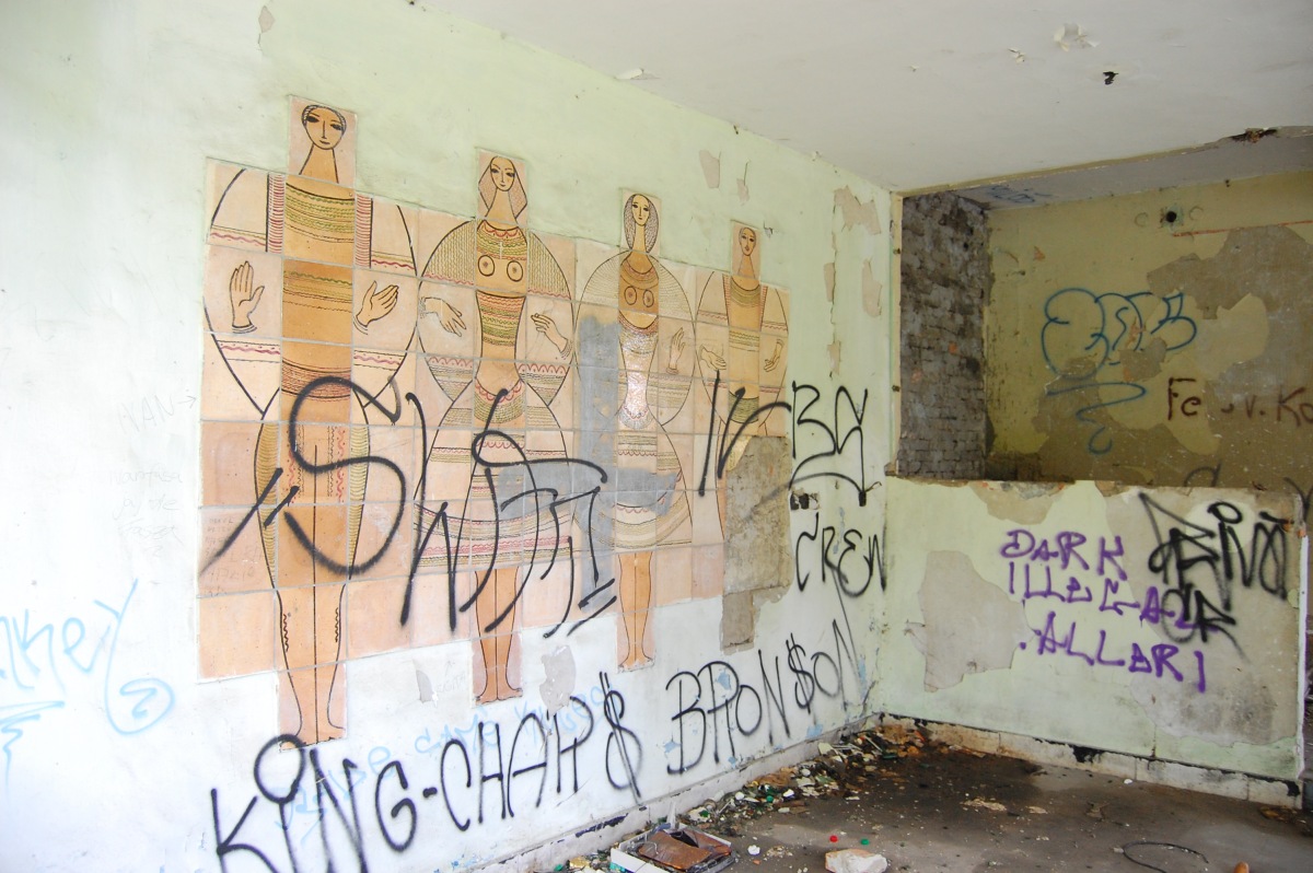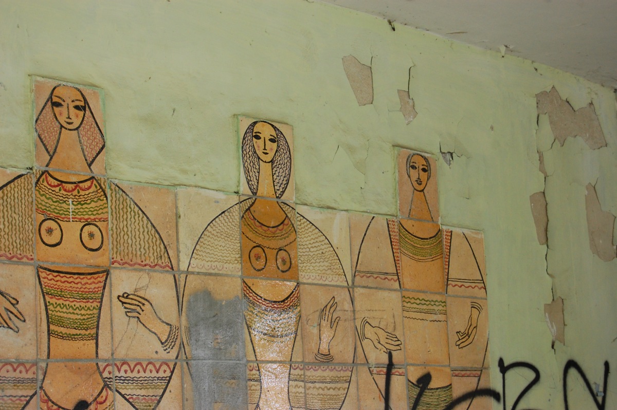 Sajnos, ezeket a képeket sem kímélte a vandalizmus, a jobb szélső figura néhány alsó csempéje teljesen hiányzik már, más részei erősen sérültek, és ahogy az összes fal, ezek is össze vannak firkálva.