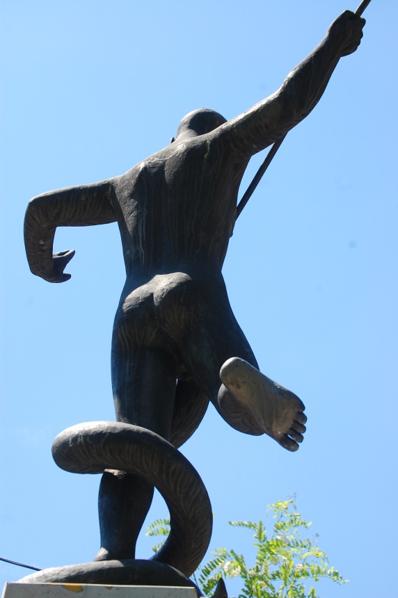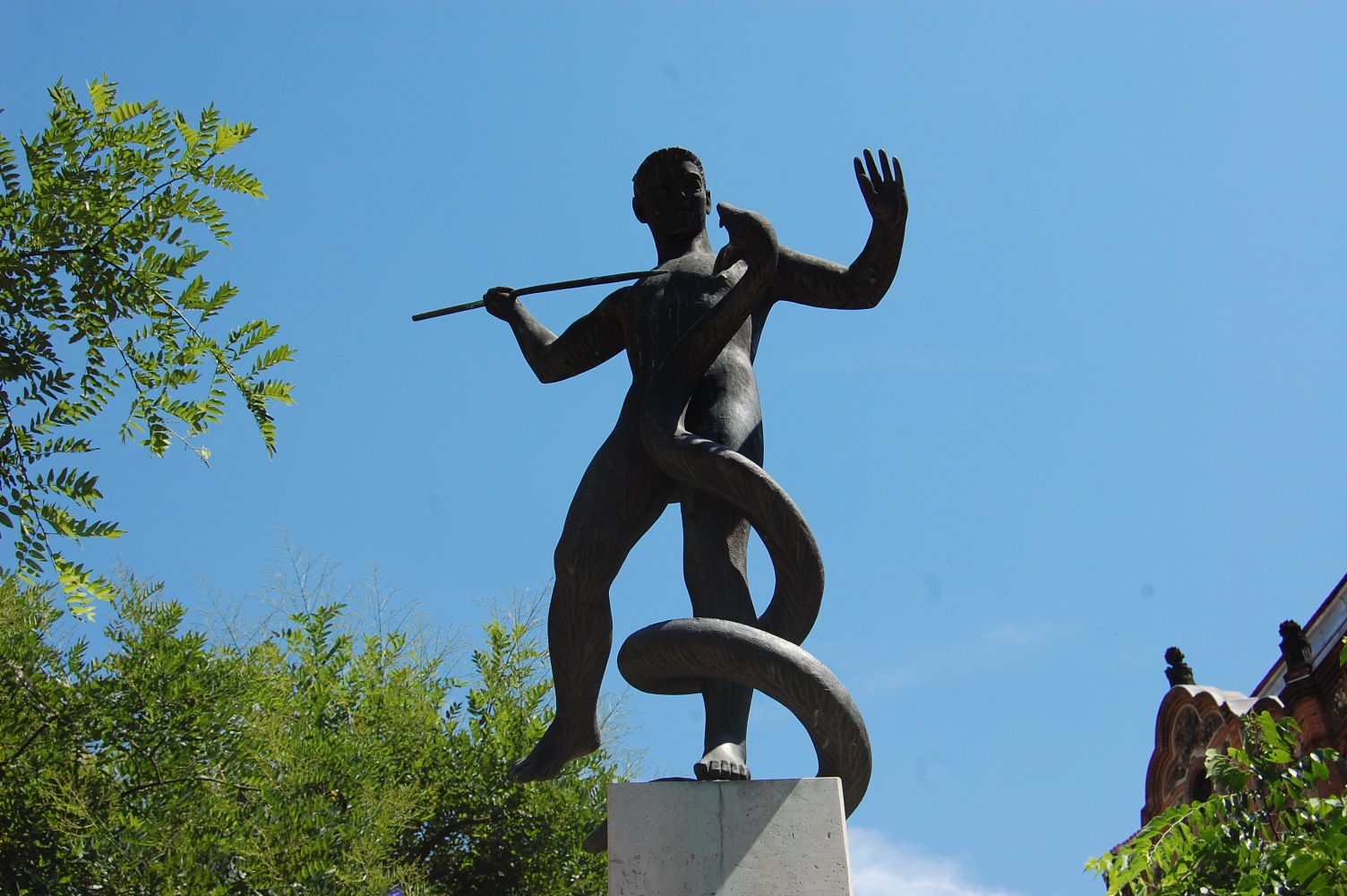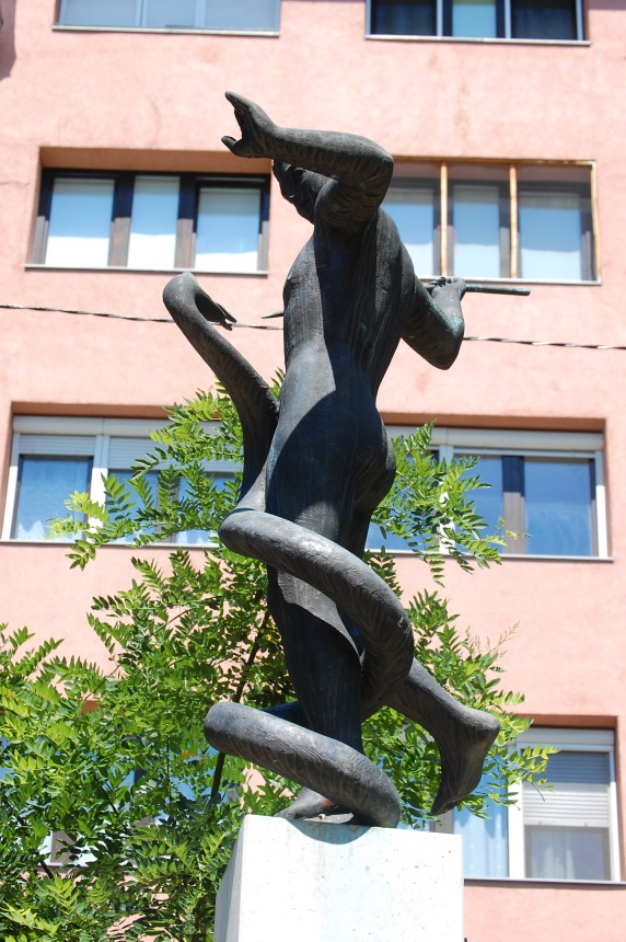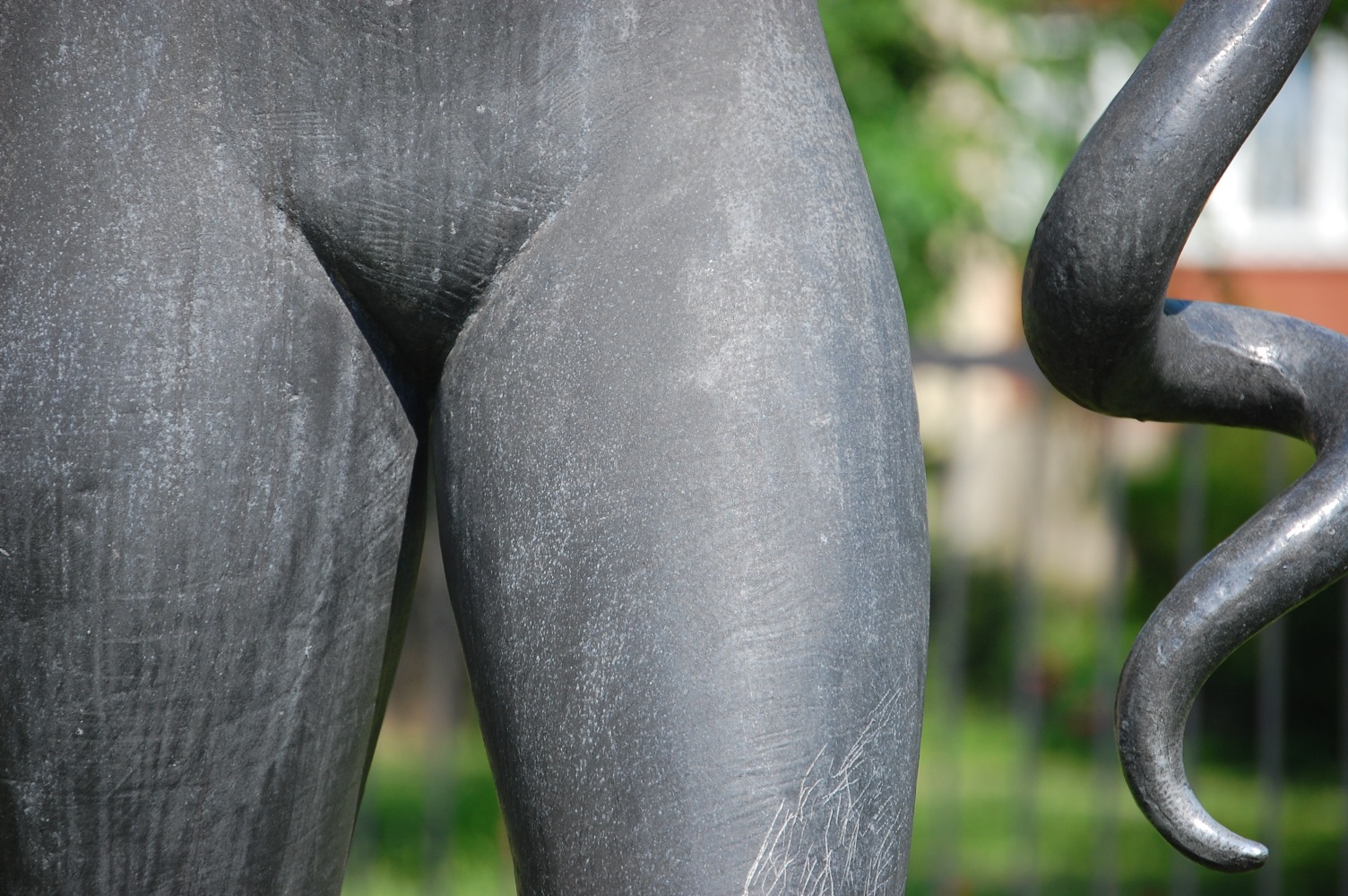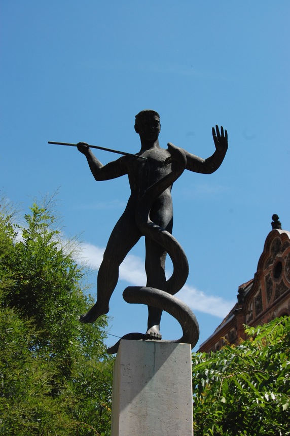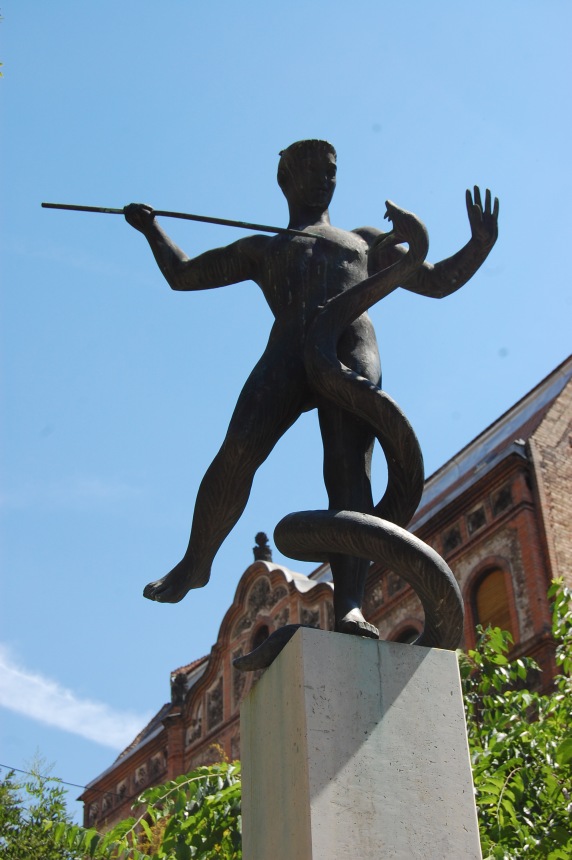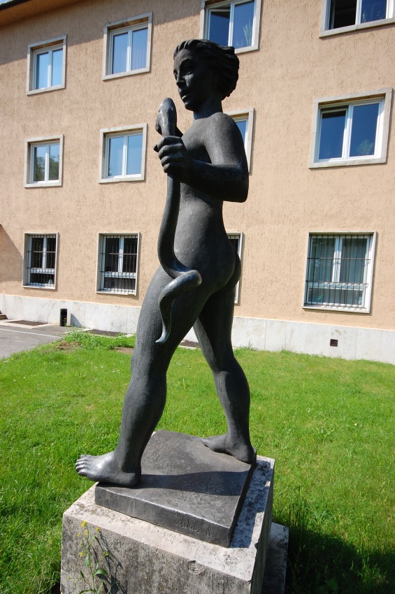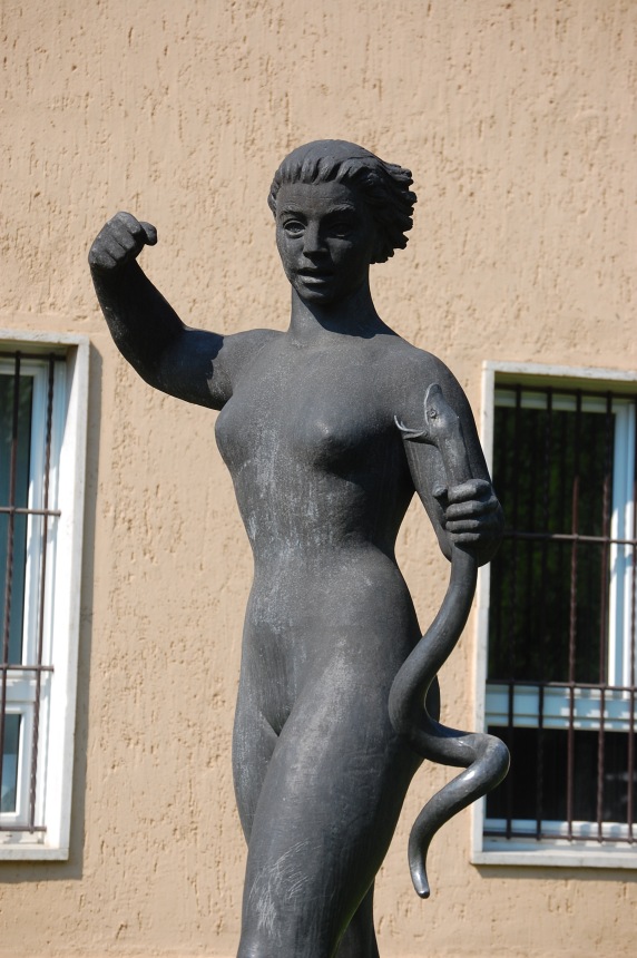 Magyarországon a szobrok megformálásakor még nem nagyon lehetett tudni a feminizmusról, így a nő lelkiismeret-furdalás nélkül, nyugodt szívvel kaphatta a kisebbik bestiát, egy talán méter hosszúságú kígyót: