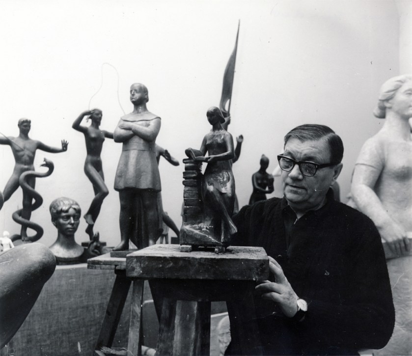A női változatról készült sor végén álljon itt egy archív kép a mesterről, szobra 1:1-es bronzváltozatának társaságában, Lugosy Szilvia felvételeként: