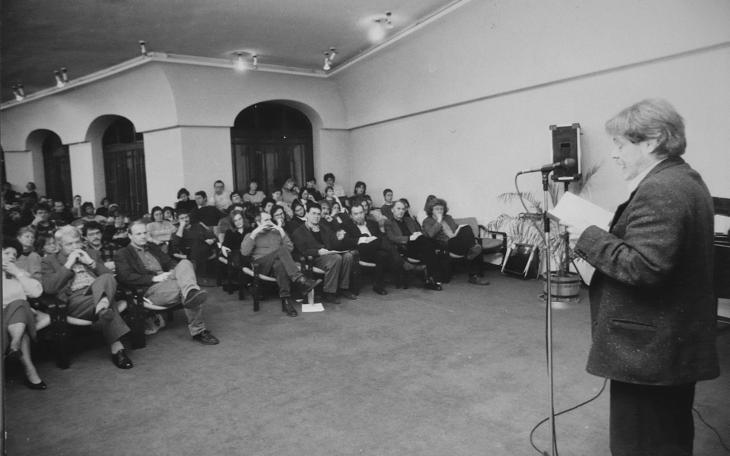[Ez megint csak korai írás, 1990 februárjában jelent meg az Alföldben, nem kell hozzátennem, ahogyan semelyik fiatalkorú értekezőnek sem kell hozzátennie akár már néhány hónappal írása megjelenése után, hogy ma egészen másképp írnám meg. Arra nem emlékszem már, a címe miért nem a verssor-szerűbb, trocheikus A jó fül és a partitúra lett; pedig amíg most elő nem kerestem, így emlékeztem rá. – Érdekesebbek a képek, melyek négy évvel későbbiek, mint az írás. Balassa Péterről, úgy emlékszem, soha nem készítettem fényképet, kapcsolatunk, annak legmelegebb, legbarátibb része is a saját fényképezésem előtti időkre nyúlik vissza, digitális fényképezésről még az interneten se lehetett olvasni, már csak azért sem, mert az internet sem volt egykönnyen hozzáférhető még. Az itt látható fekete-fehér képek 1994. január 25-én készültek, a magyar-német nyelvű Jelenkor-antológia pécsi bemutatóján, a Művészetek Háza nagytermében. Ez alkalmat adott arra is, hogy az előző év legjobb Jelenkor-publikációjáért járó Szinnyei Júlia-díjat, a Jelenkor évekig létező nivódíját Darvasi Lászlónak a lehető legünnepélyesebb keretek között a kuratórium nevében átadjam. A felolvasóesten az antológia szereplői közül Balassa Péter, Bertók László, Darvasi László, Esterházy Péter, Márton László, Kukorelly Endre, Parti Nagy Lajos és Sándor Iván vettek részt. A fekete-fehér fotók kivétel nélkül a később a Művészetek Háza hivatalos eseményfotósává lett kiváló pécsi fényképész, Tóth László felvételei. Sok van még ott, ahonnan ezek jönnek, de türelem, mindent a maga idejében.]