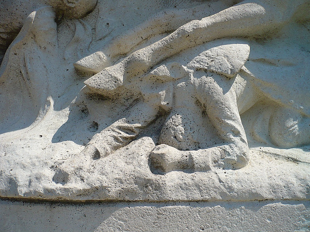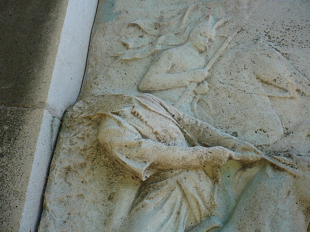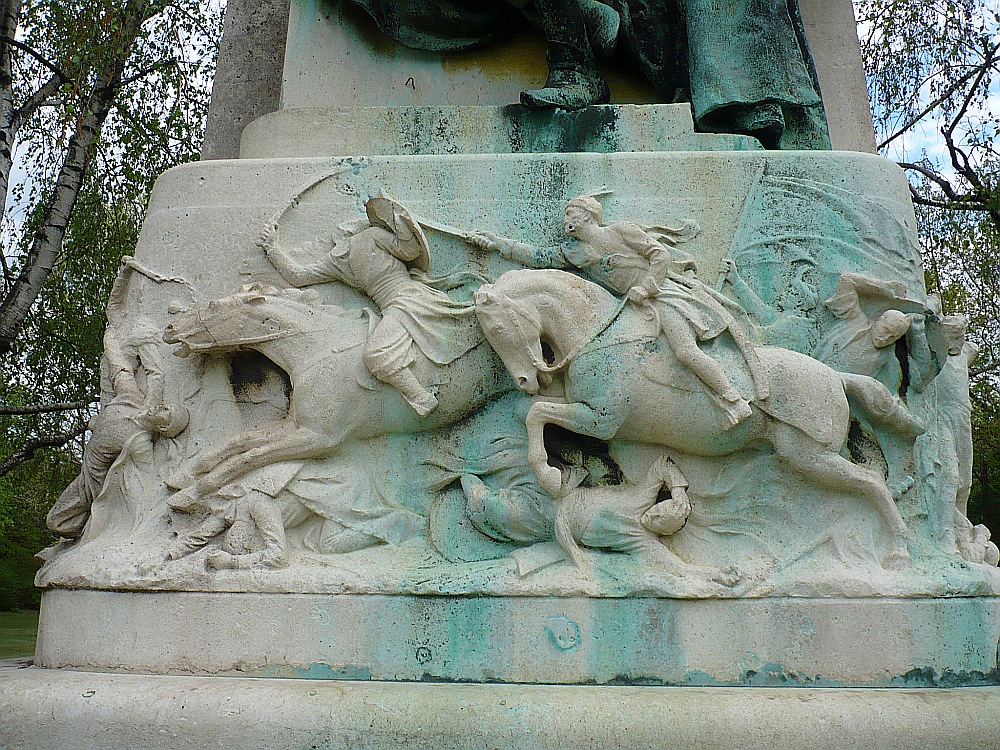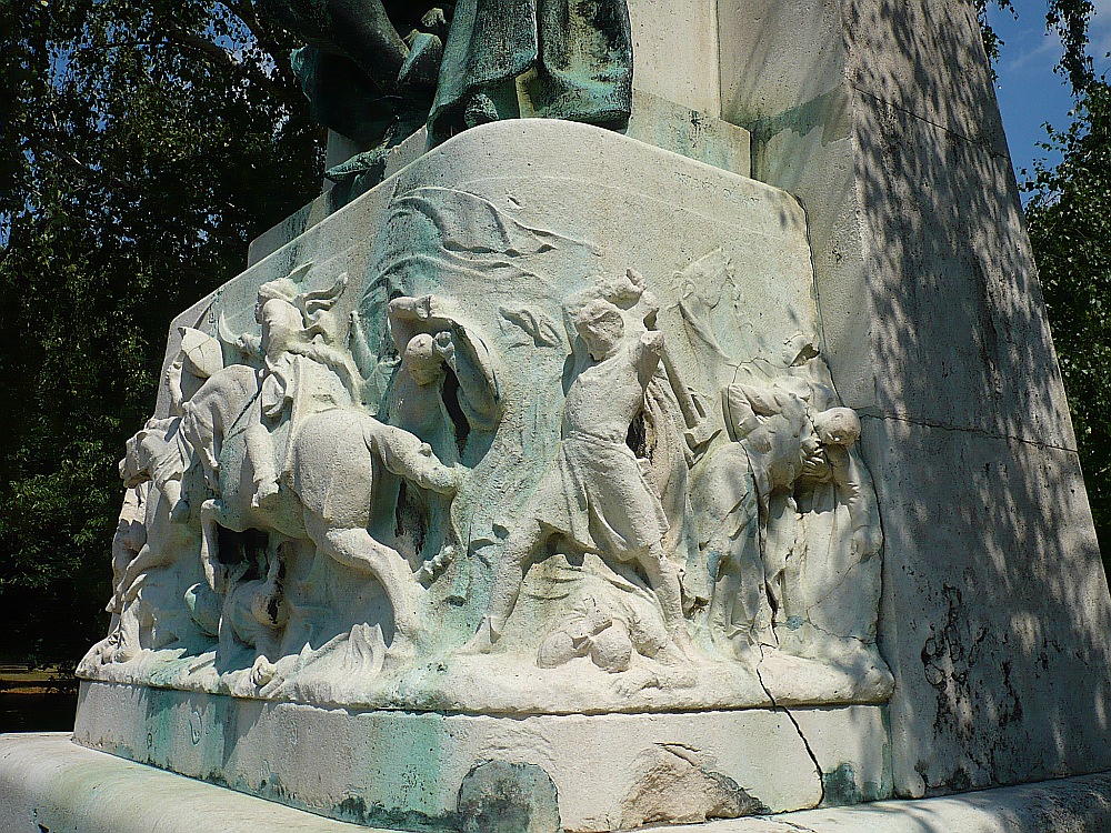 A jobb oldalon sem rózsásabb a helyzet. A lesújtani készülő magyar vitéznek megvan a feje, ő csak az arcát vesztette el az idők folyamán. Mintha a pöröly épp őt találta volna el. Se füle, se szeme, se szája, se orra.