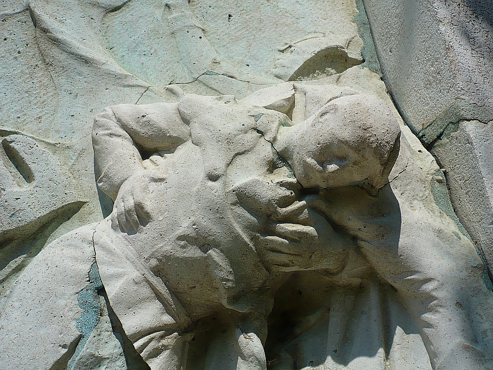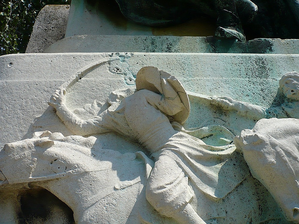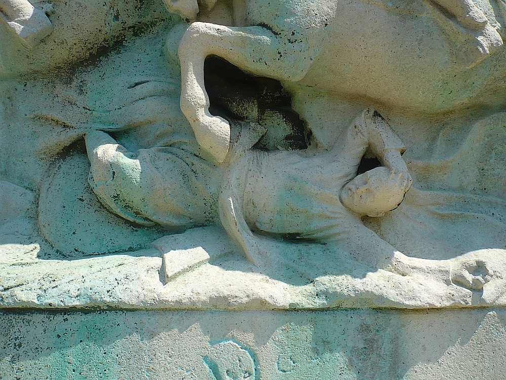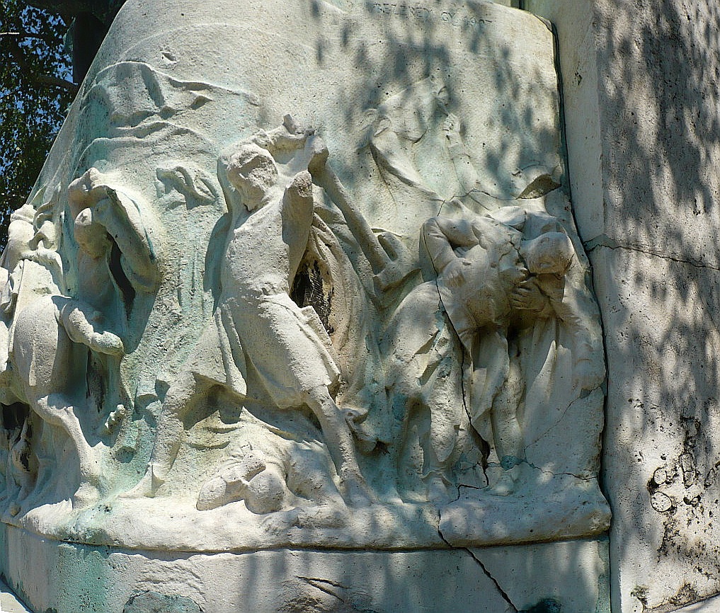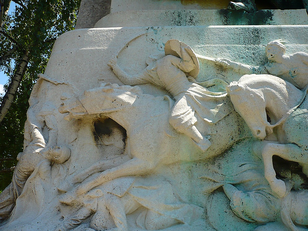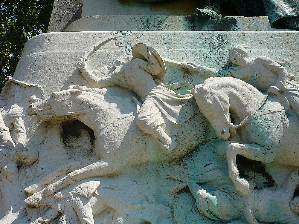 A száguldó ló patája alatt görnyedő sebesült feje csak azért menekült meg, mert a szobrász elővigyázatosan elrejtette a rongálók elöl, ő fülét-farkát behúzva menekült meg, bár sok reménye a jelenetben nem nagyon lehet.