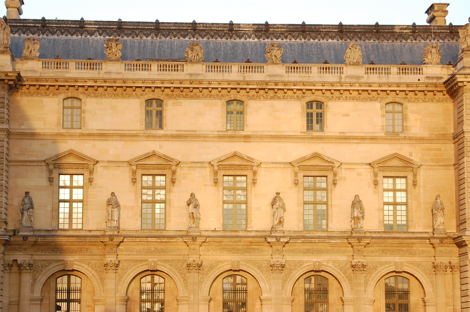 A fent látható mozaik 70 darab kisebb képből áll, 7 sorban soronként tíz egész alakos szoborral, és azt a hetven szobrot ábrázolja, amelyek a Louvre belső, üvegpiramisos udvarában, az első emelet magasságában a homlokzaton az ablakközökben körbefutnak. Pontatlan a “kör” szó, hiszen az udvar nyugatra, a Tuileriák kertje felé nyitott. A képeket 2008 júniusában, egy napfényes kora este alatt csináltam, kicsit unaloműzésből, várakozásképpen. A közelgő napforduló miatt a 8 és fél 9 közötti idő általában naposnak, világosnak számít a júniusi Párizsban. A szobrokat véletlenül vettem észre, majd amikor felfedeztem őket, próbáltam azonos szögből, egyforma távolságból a belépő Nikon nagyobb objektívjével lefényképezni (ez néha nem volt könnyű, a sarkokban vagy kiugrókban elhelyezkedő szobrok esetében pedig éppenséggel lehetetlennek bizonyult). Az alábbi kép nagyjából megmutatja, a szobrok hogyan is helyezkednek el az udvart övező épületek falain – itt épp hat látszik közülük egymás mellett: