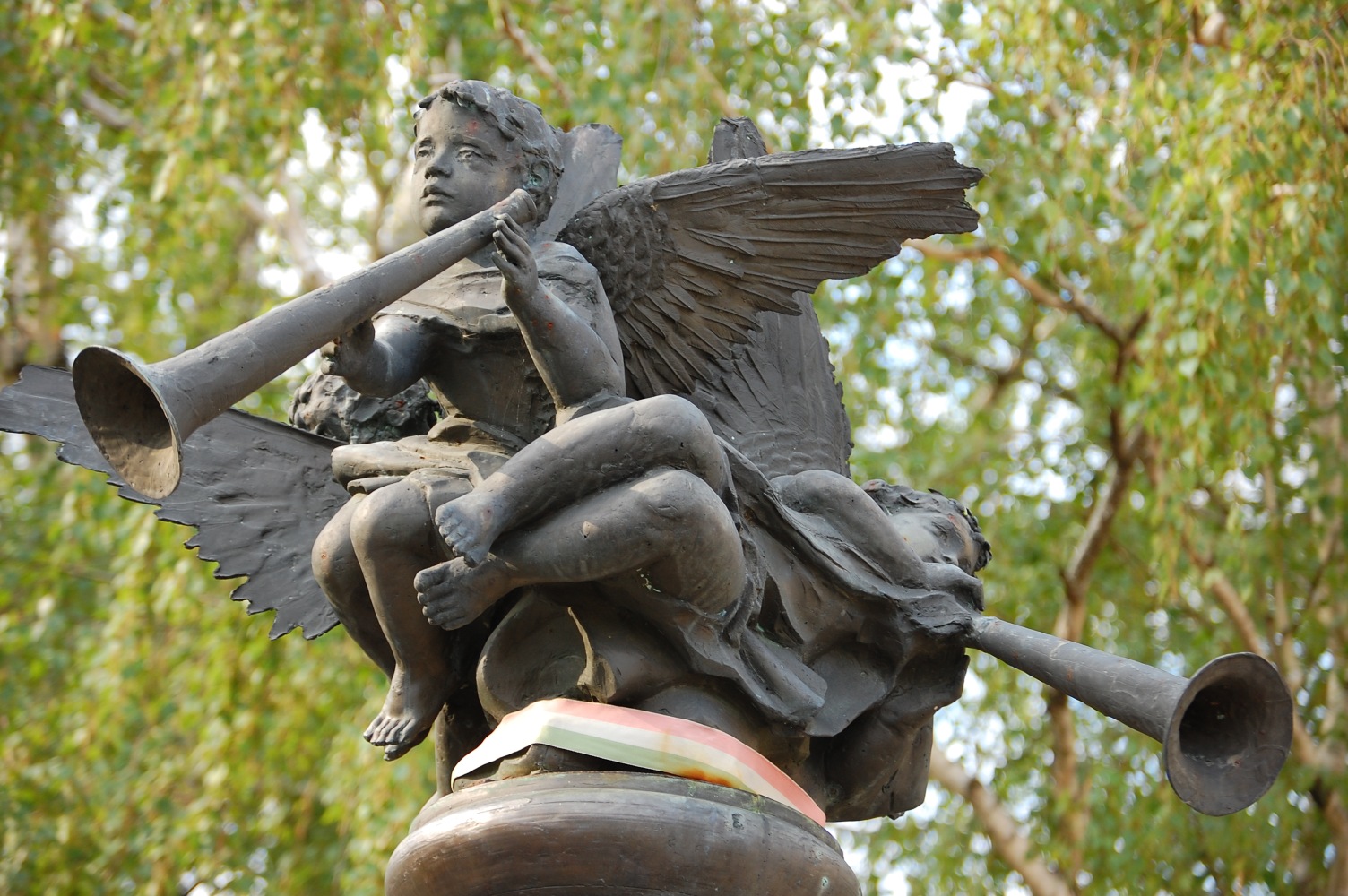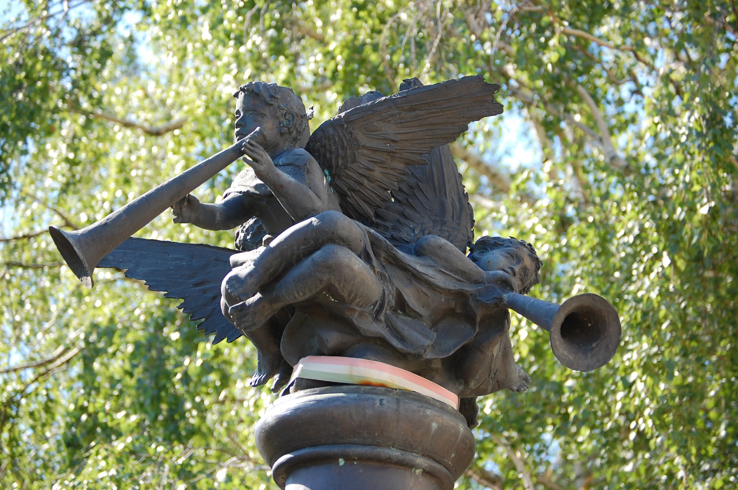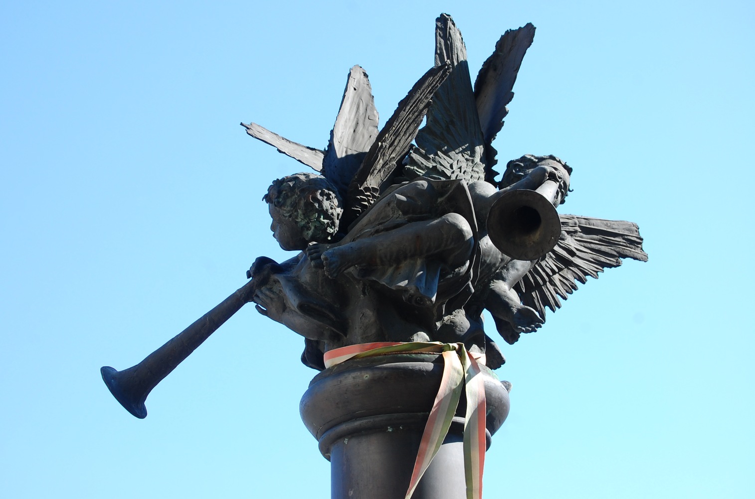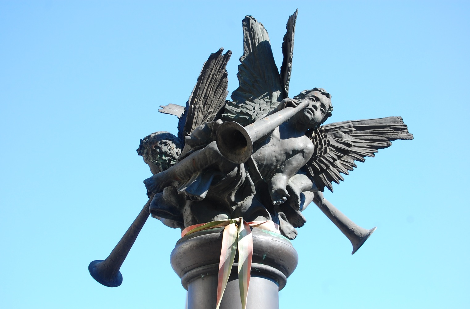 Angyalok fújják őket. Három. Máté István II. világháborús emlékműve Soltvadkert központjában, a nagy körforgalom és az evangélikus templom közelében, néhány lépésre a szépen cigiző Szent Orbán-kúttól. Körbe-körbe után kiált, zöldből a kékbe. Tulajdonképpen ez a színhaladvány a szobor legigazibb csábereje.