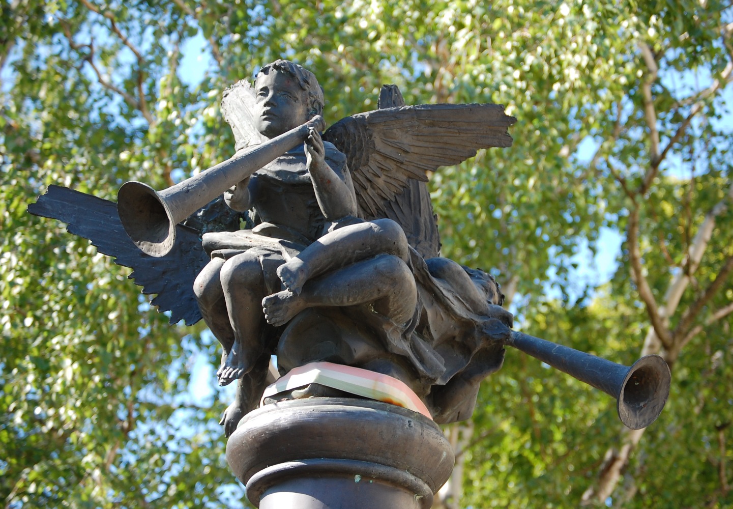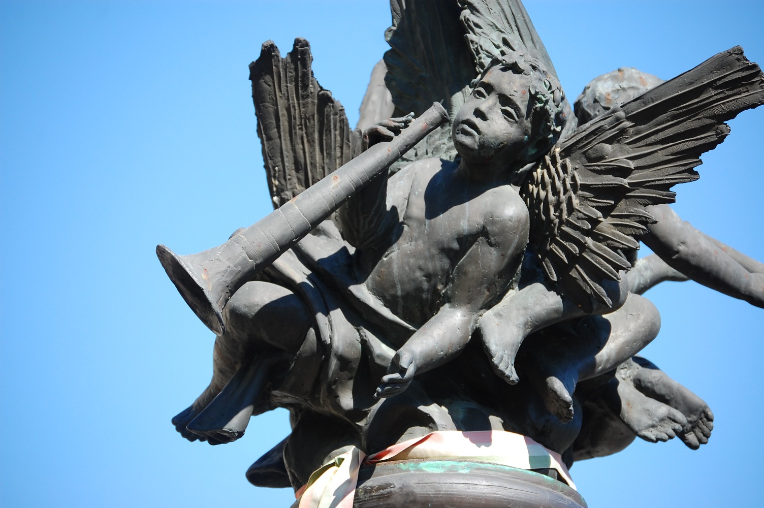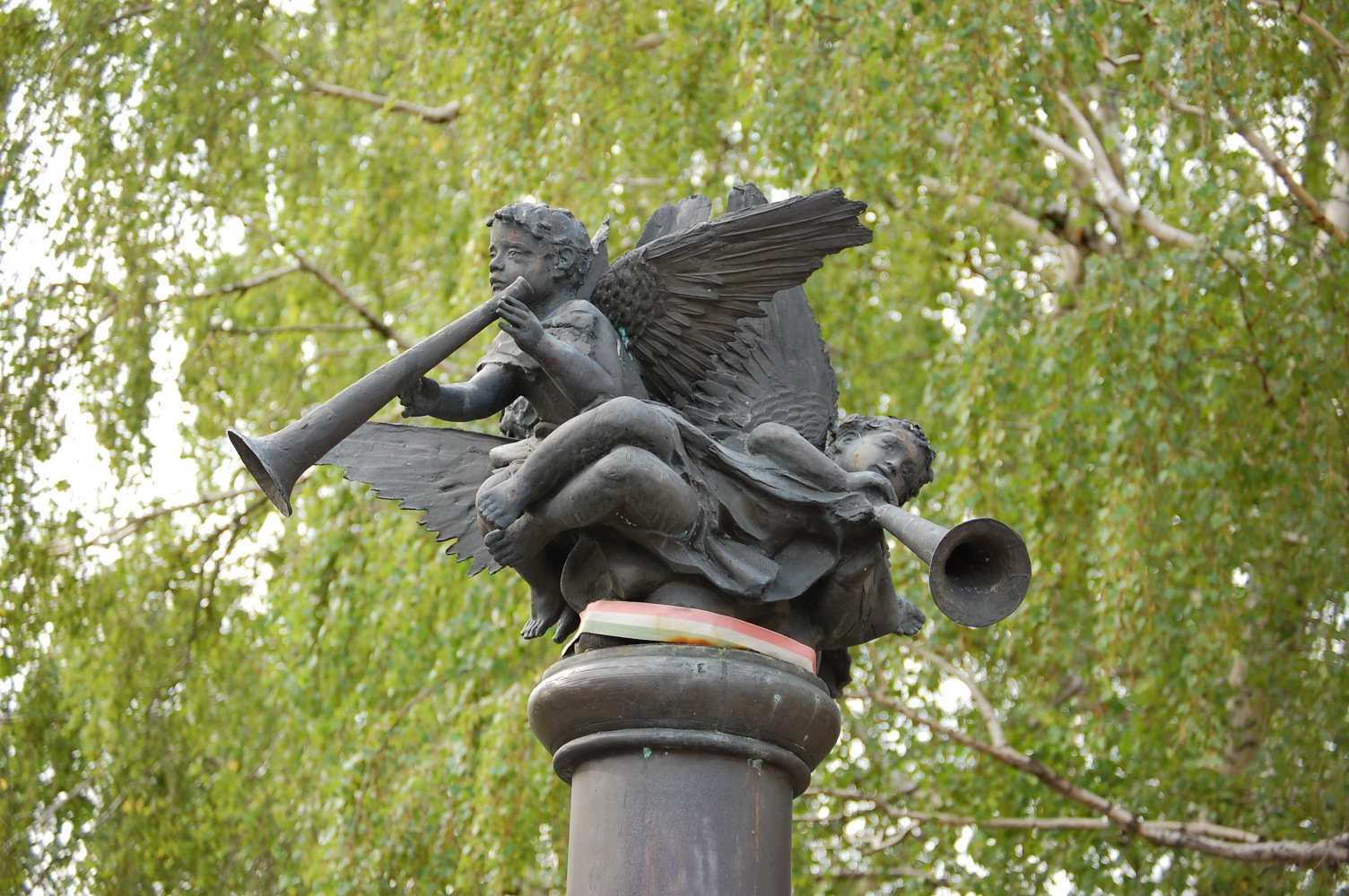 Angyalok fújják őket. Három. Máté István II. világháborús emlékműve Soltvadkert központjában, a nagy körforgalom és az evangélikus templom közelében, néhány lépésre a szépen cigiző Szent Orbán-kúttól. Körbe-körbe után kiált, zöldből a kékbe. Tulajdonképpen ez a színhaladvány a szobor legigazibb csábereje.