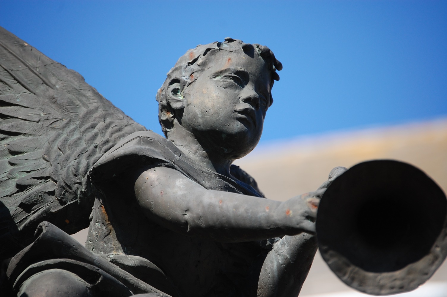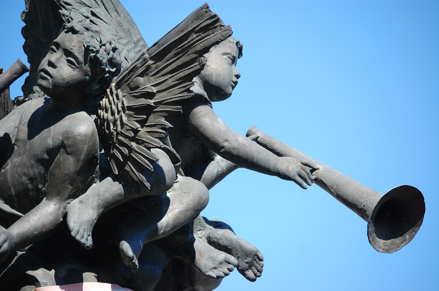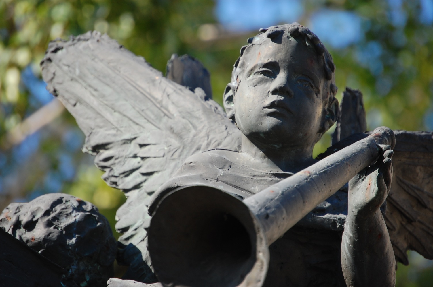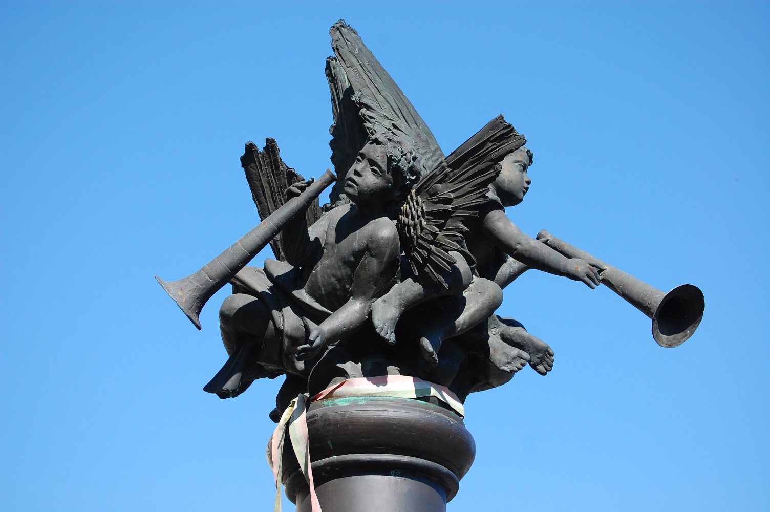 Angyalok fújják őket. Három. Máté István II. világháborús emlékműve Soltvadkert központjában, a nagy körforgalom és az evangélikus templom közelében, néhány lépésre a szépen cigiző Szent Orbán-kúttól. Körbe-körbe után kiált, zöldből a kékbe. Tulajdonképpen ez a színhaladvány a szobor legigazibb csábereje.