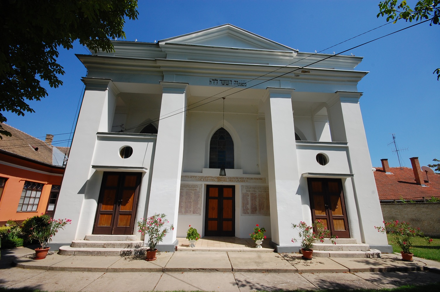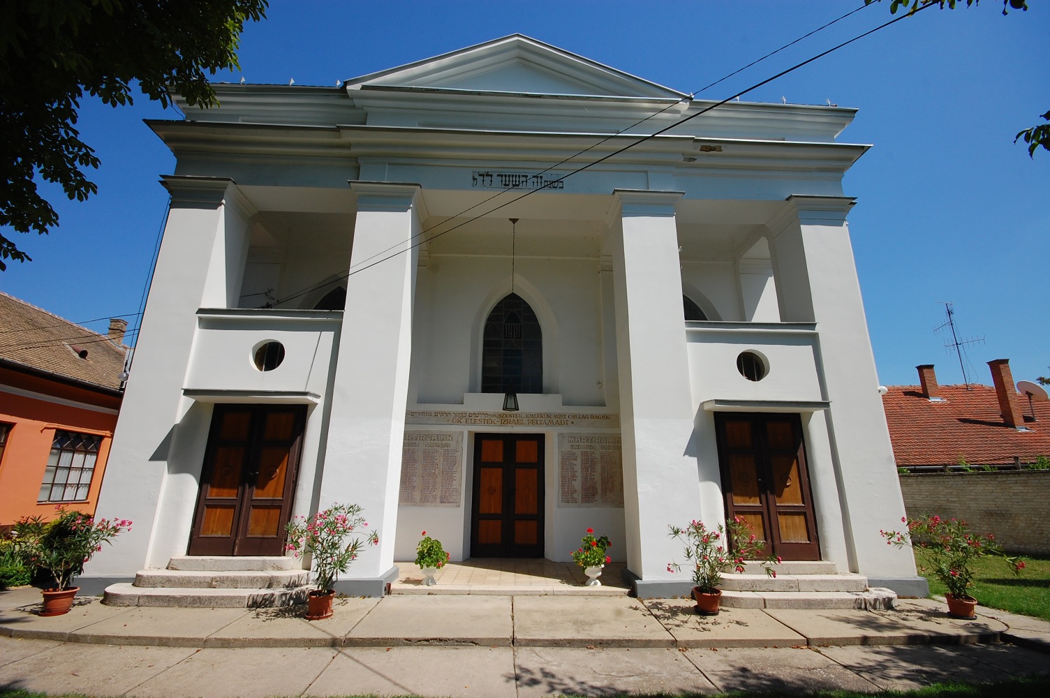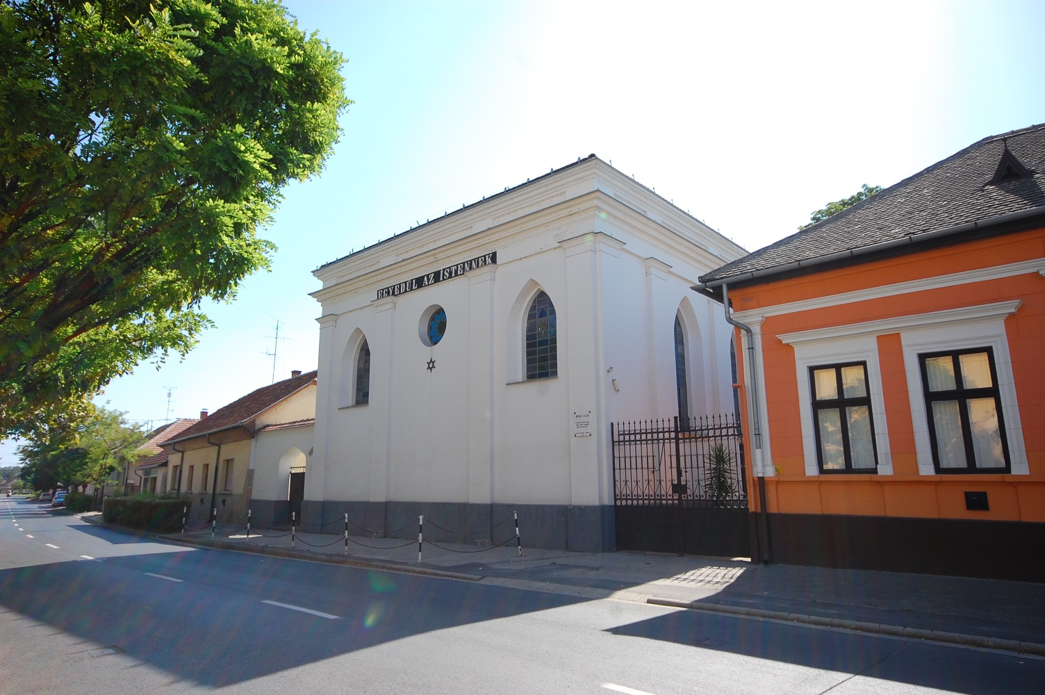 A zsinagóga 1857 és 1861 között épült fel, 1860-ban felavatták már, de végső befejezése csak a rákövetkező évben történt meg. Tervezője ismeretlen, könnyen elképzelhető, hogy azonos az ehhez igen hasonló, de eggyel kisebb léptékű jánoshalmai zsinagóga építészével. Az épület a klasszicista és a romantikus építészet jellegzetes keveréke, az utcáról látható részeken a nyílászárókkal inkább a romantikus jegyek uralkodnak. A keleti utcahomlokzaton magyarul olvasható az “Egyedül az Istennek” felirat.