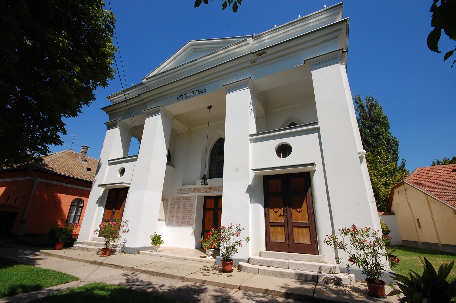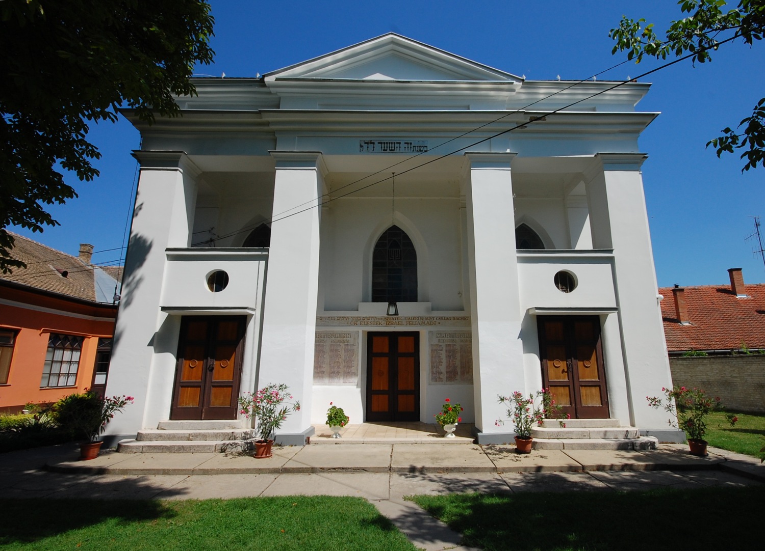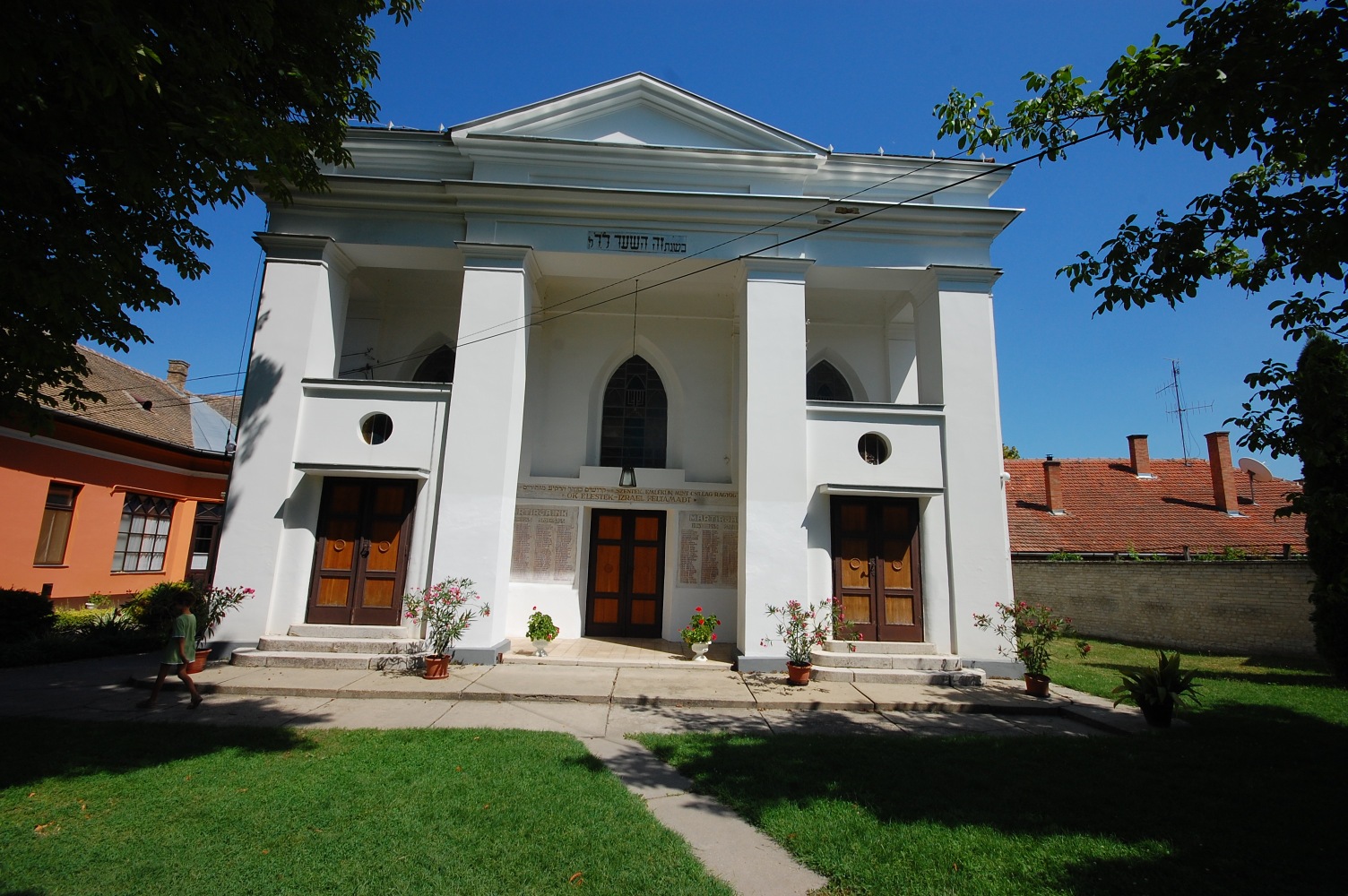 A zsinagóga 1857 és 1861 között épült fel, 1860-ban felavatták már, de végső befejezése csak a rákövetkező évben történt meg. Tervezője ismeretlen, könnyen elképzelhető, hogy azonos az ehhez igen hasonló, de eggyel kisebb léptékű jánoshalmai zsinagóga építészével. Az épület a klasszicista és a romantikus építészet jellegzetes keveréke, az utcáról látható részeken a nyílászárókkal inkább a romantikus jegyek uralkodnak. A keleti utcahomlokzaton magyarul olvasható az “Egyedül az Istennek” felirat.