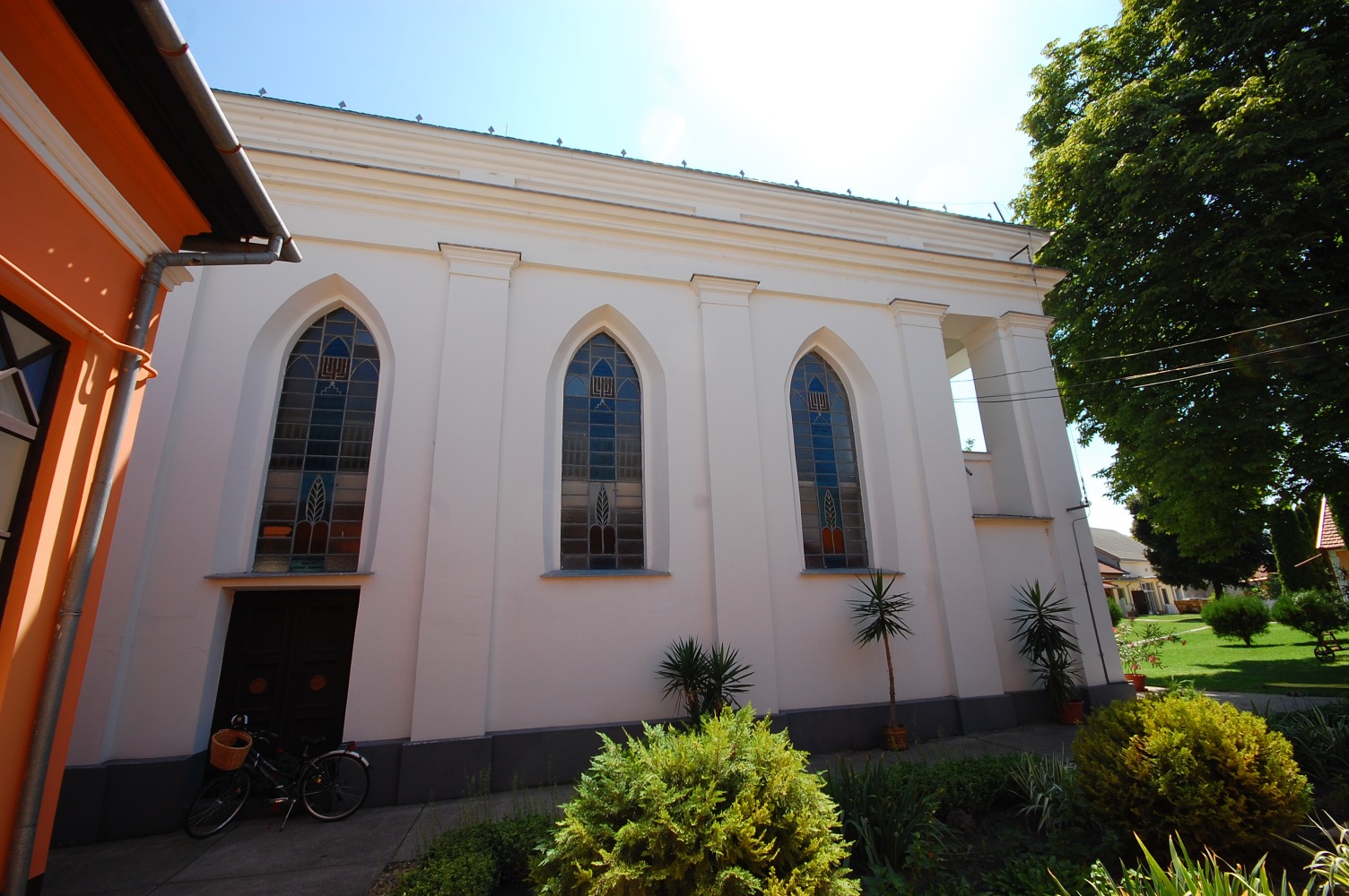 A nyugati, bejárati oldalra fordulva azonban hirtelen megváltozik az épület stílusa, a timpanonos megoldás a tetőrészen egyértelműen klasszicista jegy.