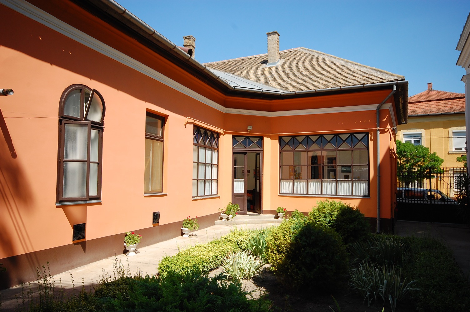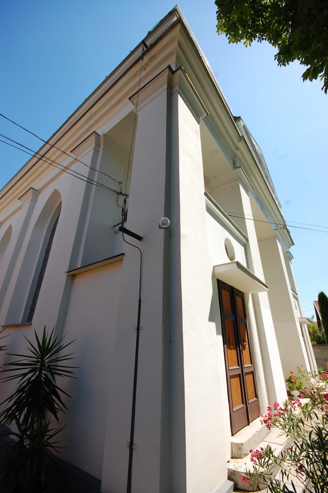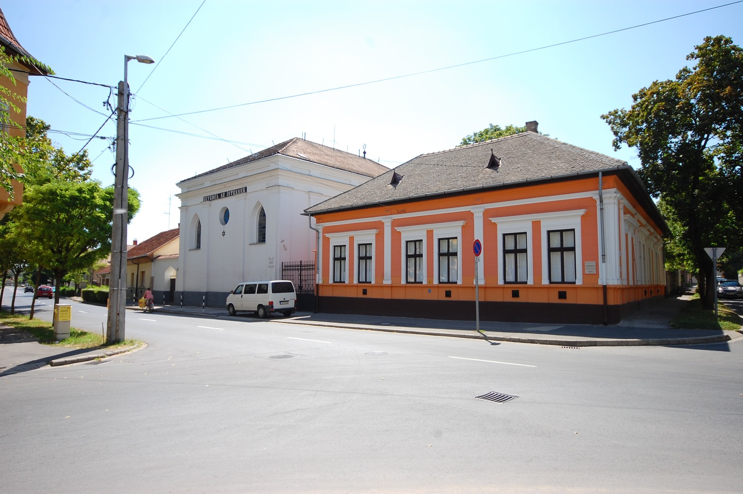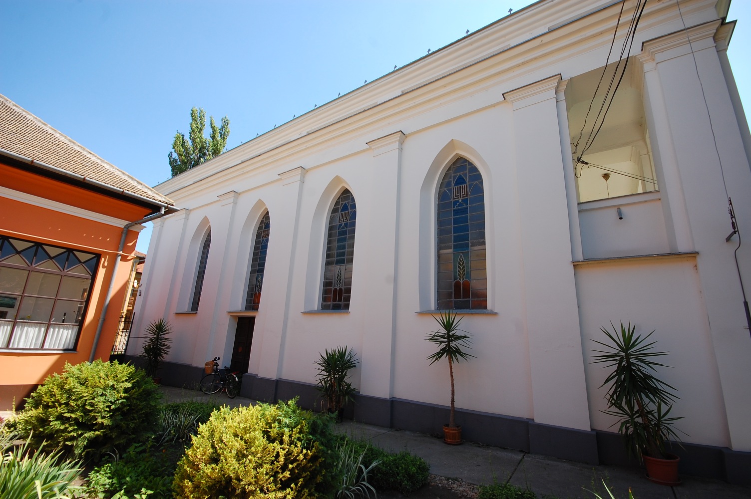 A zsinagóga keleti, Petőfi utcai nézete, mellette jobbra a szépen rendben tartott egykori rabbiház.