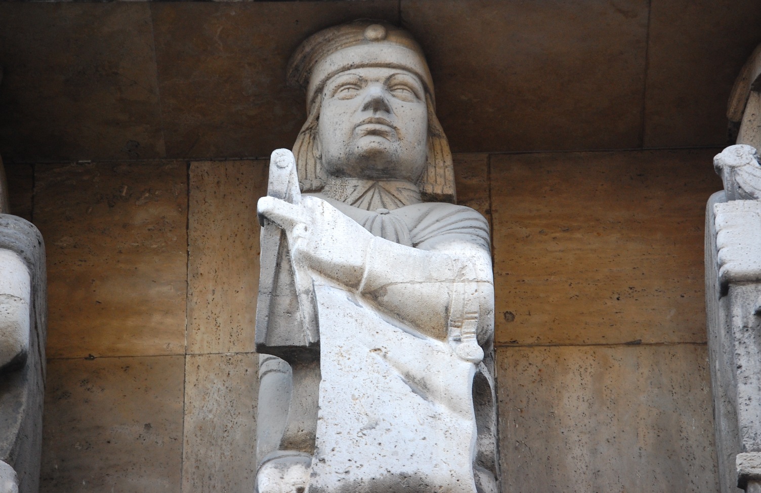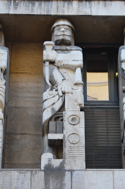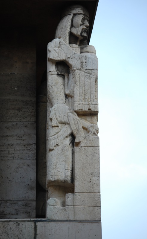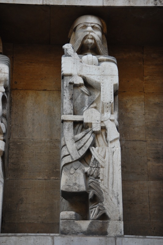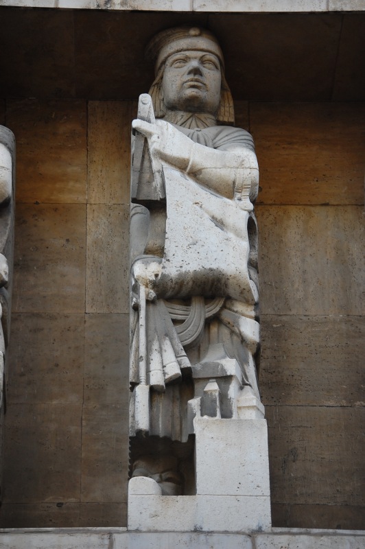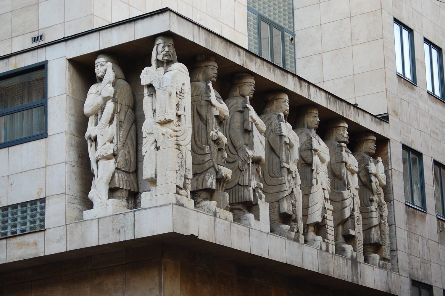 Balról az első figura ősmagyar hírvivő (igazodva az épület funkciójához), a sarkon Szent István alakja kapott helyet (megemlékezve az 1938-as Szent István-évfordulóról, mely a szobor elkészültekor, 1940-ben már a múlt volt, a tervezéskor, 1937-ben azonban még a jövő), a Hársfa utcai oldalon pedig sorban hat allegória: a magyar politikát, a művészetet, a katonáskodást, a tudományt, a technikát és a mezőgazdaságot megszemélyesítő férfialak áll.
