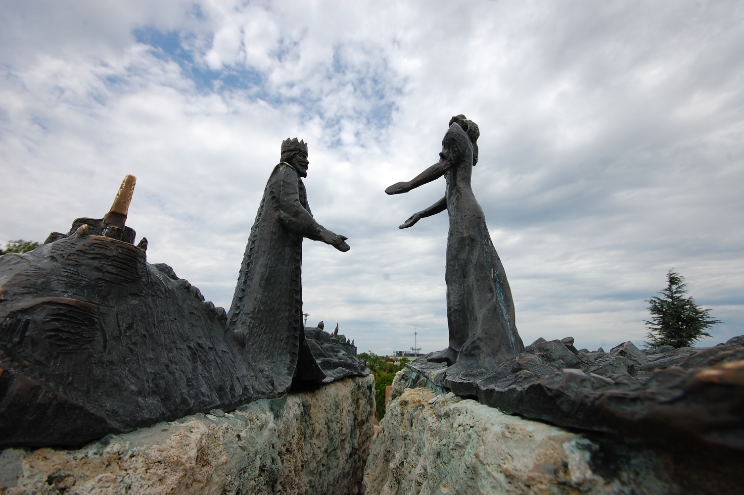 69. Buda István: Vergilius és Dante. (2006) A szobor a Köztérképen. “A múltból jön a jövőt megvilágító fény.”