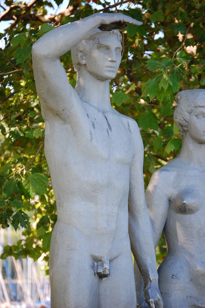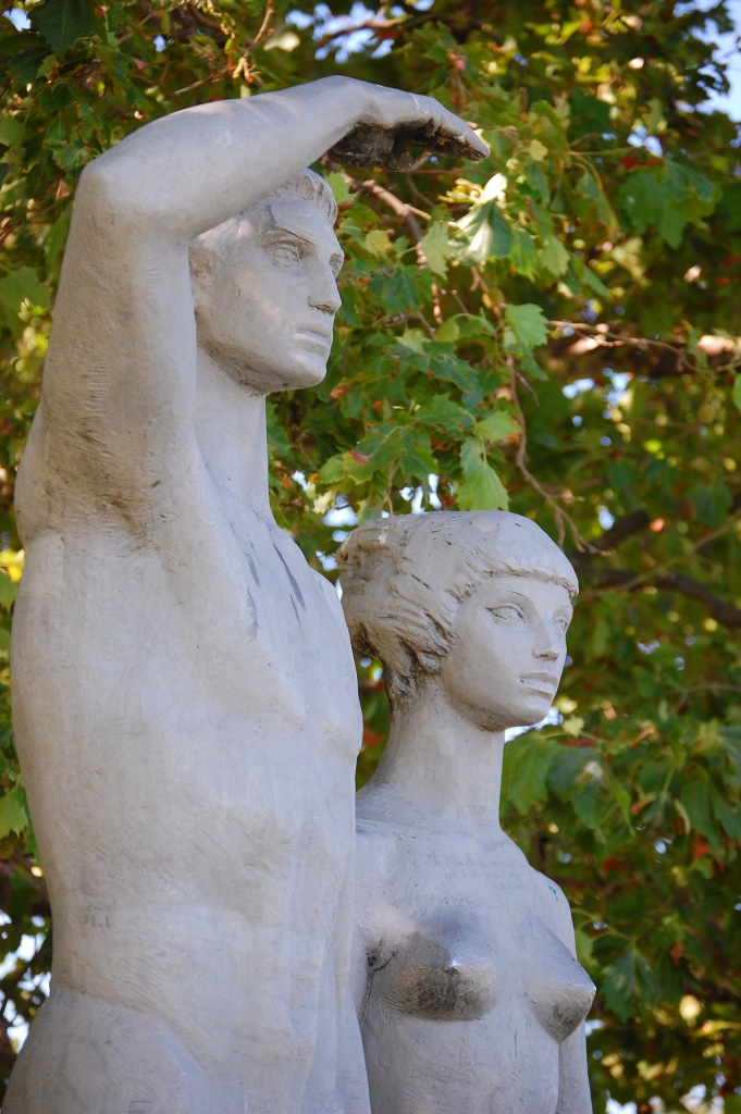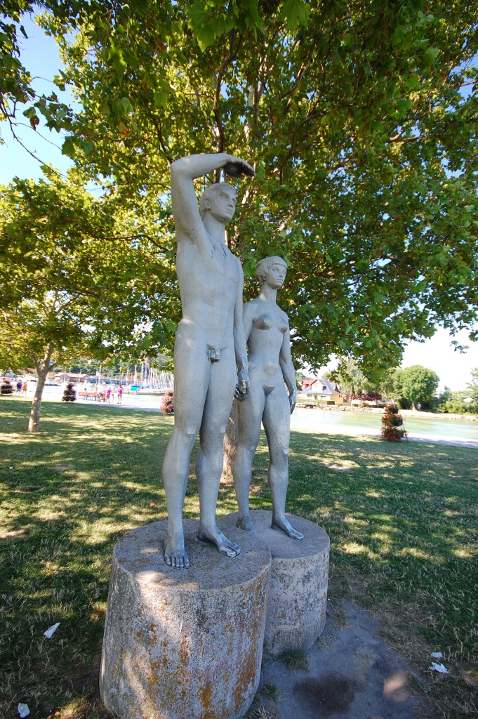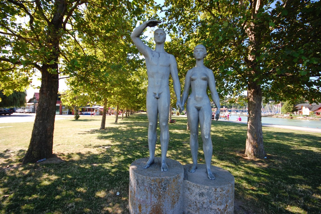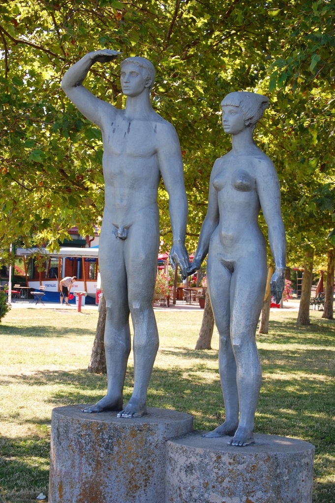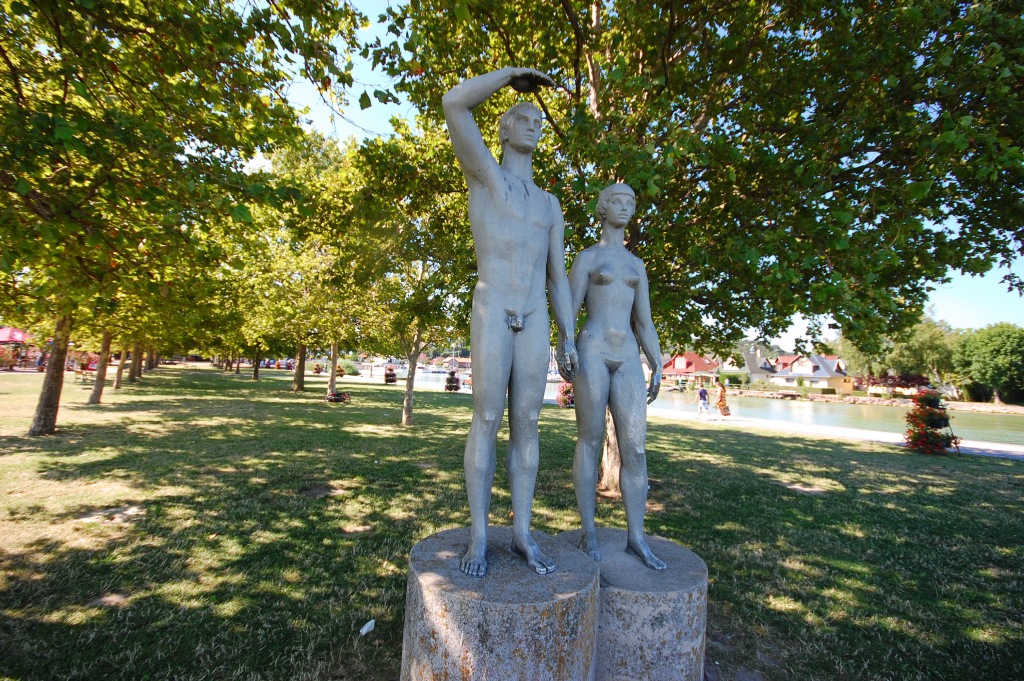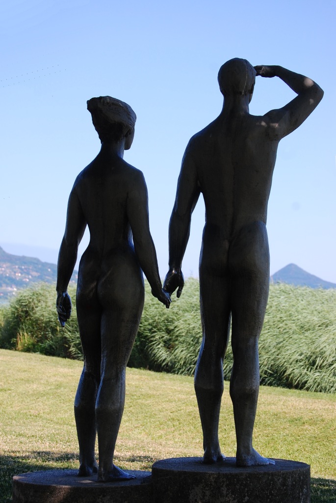 De a szobornak elölnézete is van, nem is akármilyen. Az Emberpár programja a lehető legegyszerűbb és legsallangmentesebb tézis: két fiatal, meztelen ember egymás kezét érintve, az összekulcsolás pillanata előtt a víz felé néz, a balra álló férfi figura kezéből afféle szemellenzőt formálva a Balatont kémleli, a nő megadóan leejti bal karját. Semmi rejtekezés, semmi takargatás, éppenséggel a korszakban furcsa, rendkívüli nyíltság. A szobor architekturális titka is egyszerű: a két életnagyságú alak közül a férfi húsz centiméterrel magasabb henger alakú talapzaton áll, ami által kinyújtott kezük erőfeszítés nélkül összeér, és emiatt nem is érzékelünk nagyságrendi, és ami furcsább, szintbeli eltérést sem a két ábrázolt figura között. Csak amikor már jobban figyelünk, akkor tűnik ez fel; odáig minden zökkenőmentesen harmonikus és magától értetődő.