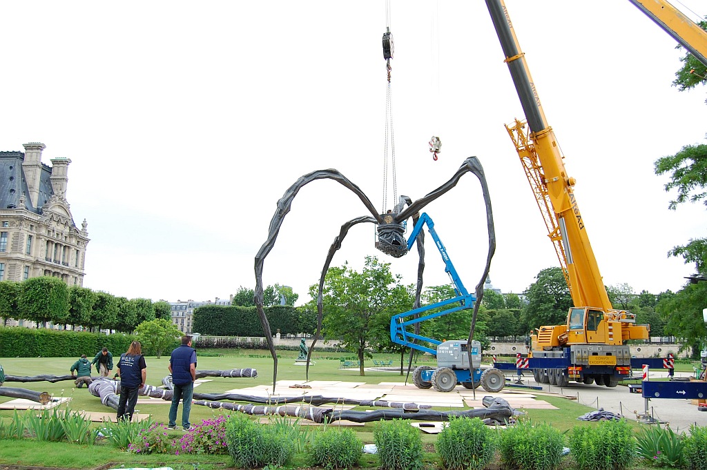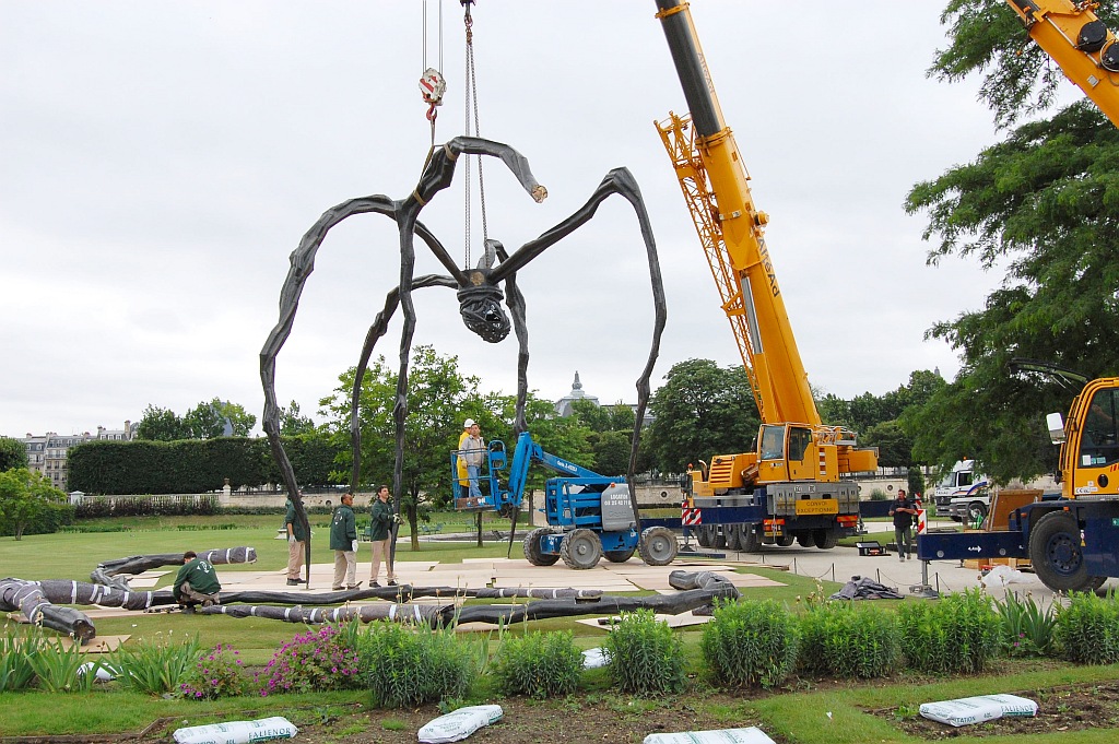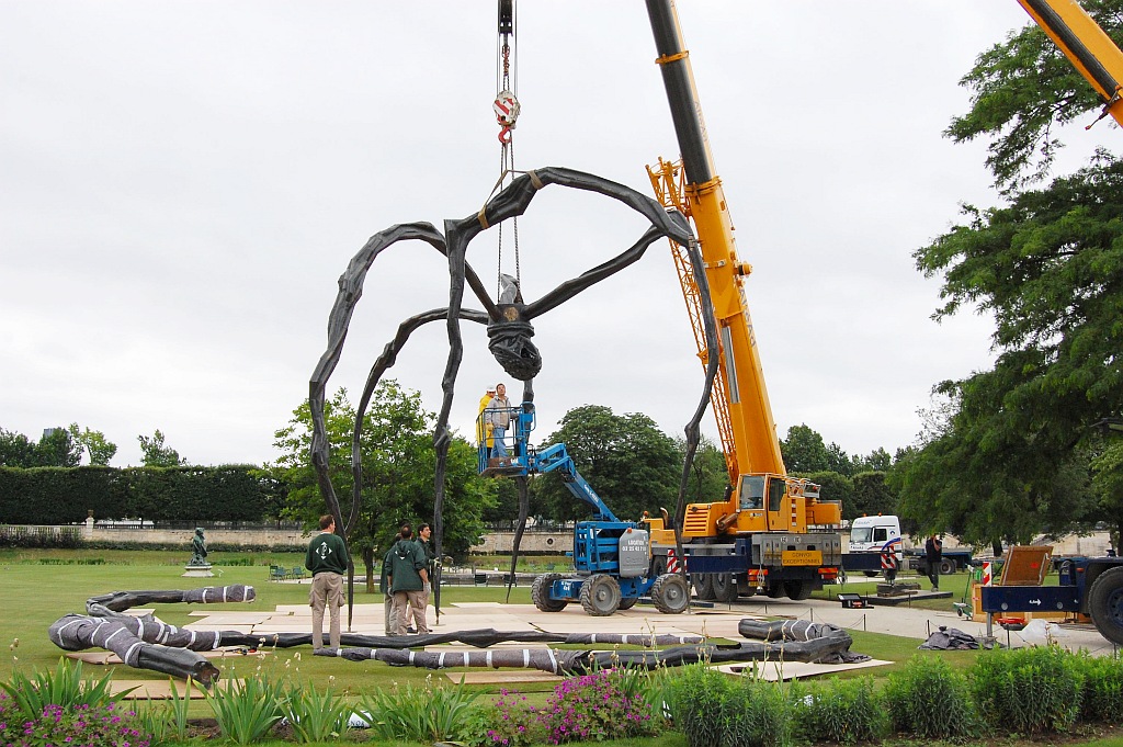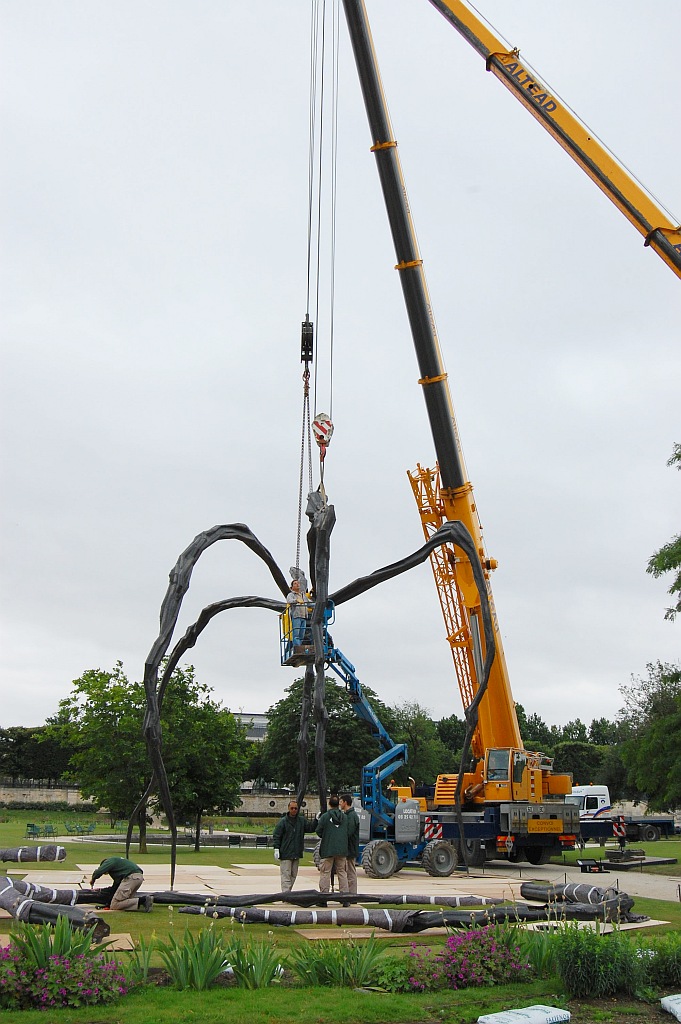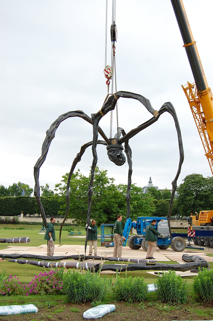 A vicc szerint: nem jó neki. De ennek a póknak jó. Louise Bourgeois (1911-2010) 1997-ben, hosszú pályafutásának utolsó szakaszában készítette el talán legnagyobb nemzetközi hírnevet szerző művét; az állandó kiállításokon, főként amerikai múzeumokban látható példányok mellett a szobornak különböző méretű utazó másolatai is léteznek. A kisebb változatok (úgy három méter magasságig) Spider, a nagyobbak, a tízméteresek Maman címen váltak ismertté. Biztos, hogy 2000 tavaszán a londoni Tate Modern ezzel az installációval nyílt meg, az 1999 folyamán egyetlen acélból készült, nagyméretű Pók a turbinaterem belső részének közepén volt látható, és idővel a múzeum tulajdonába került. Az itt következő képsorozaton az látható, ahogy 2008. júniusában, egy esőre hajló délelőttön Párizsban, a Tuileriák kertjében ideiglenes jelleggel felállított nagy példány ötödik lábát szerelik le. 8-10 szakember 3 munkagép segítségével 10 perc alatt végez az 5. lábbal, és már jön is a következő. Szóval mégsem olyan jó a póknak; de legalább egy igazi piedesztálról levéve.