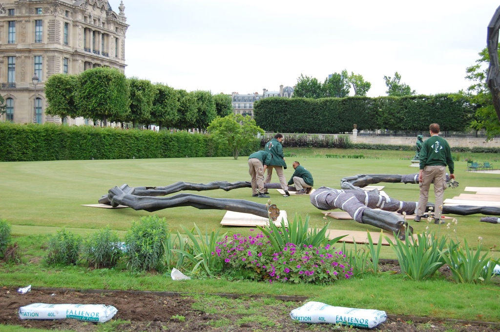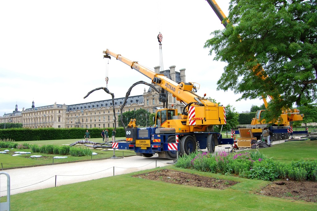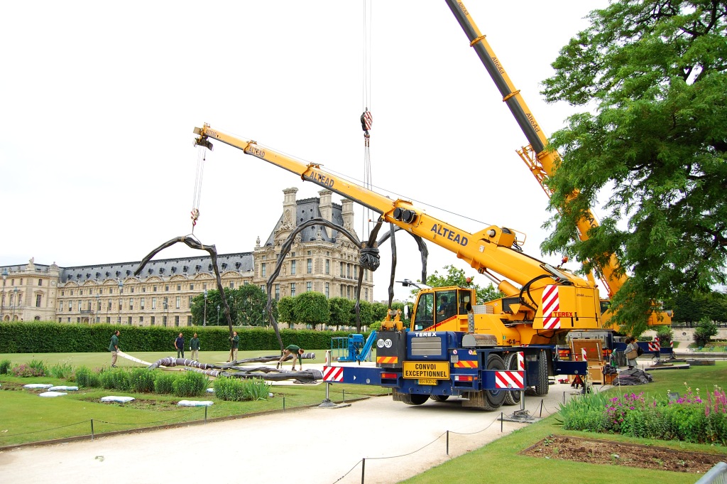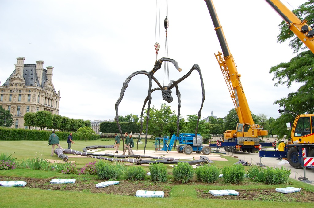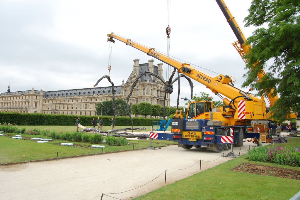 A vicc szerint: nem jó neki. De ennek a póknak jó. Louise Bourgeois (1911-2010) 1997-ben, hosszú pályafutásának utolsó szakaszában készítette el talán legnagyobb nemzetközi hírnevet szerző művét; az állandó kiállításokon, főként amerikai múzeumokban látható példányok mellett a szobornak különböző méretű utazó másolatai is léteznek. A kisebb változatok (úgy három méter magasságig) Spider, a nagyobbak, a tízméteresek Maman címen váltak ismertté. Biztos, hogy 2000 tavaszán a londoni Tate Modern ezzel az installációval nyílt meg, az 1999 folyamán egyetlen acélból készült, nagyméretű Pók a turbinaterem belső részének közepén volt látható, és idővel a múzeum tulajdonába került. Az itt következő képsorozaton az látható, ahogy 2008. júniusában, egy esőre hajló délelőttön Párizsban, a Tuileriák kertjében ideiglenes jelleggel felállított nagy példány ötödik lábát szerelik le. 8-10 szakember 3 munkagép segítségével 10 perc alatt végez az 5. lábbal, és már jön is a következő. Szóval mégsem olyan jó a póknak; de legalább egy igazi piedesztálról levéve.