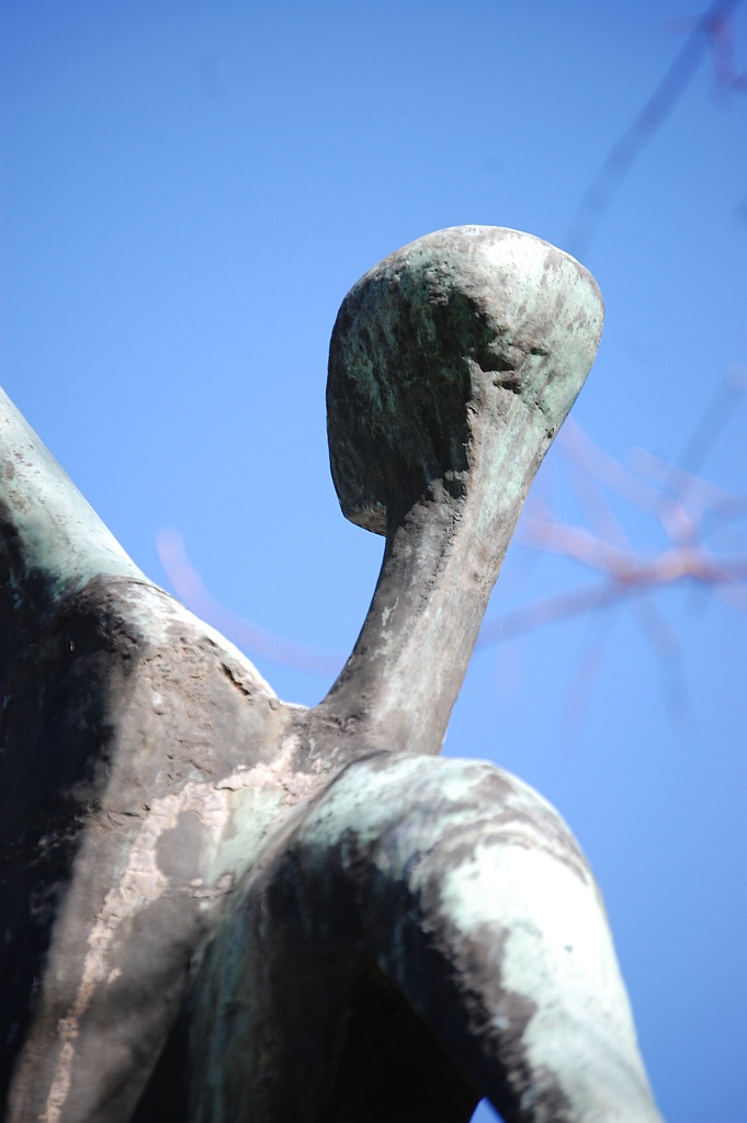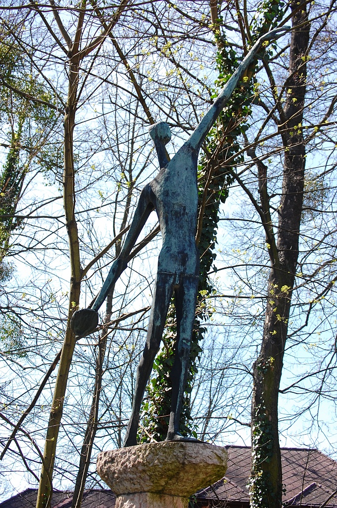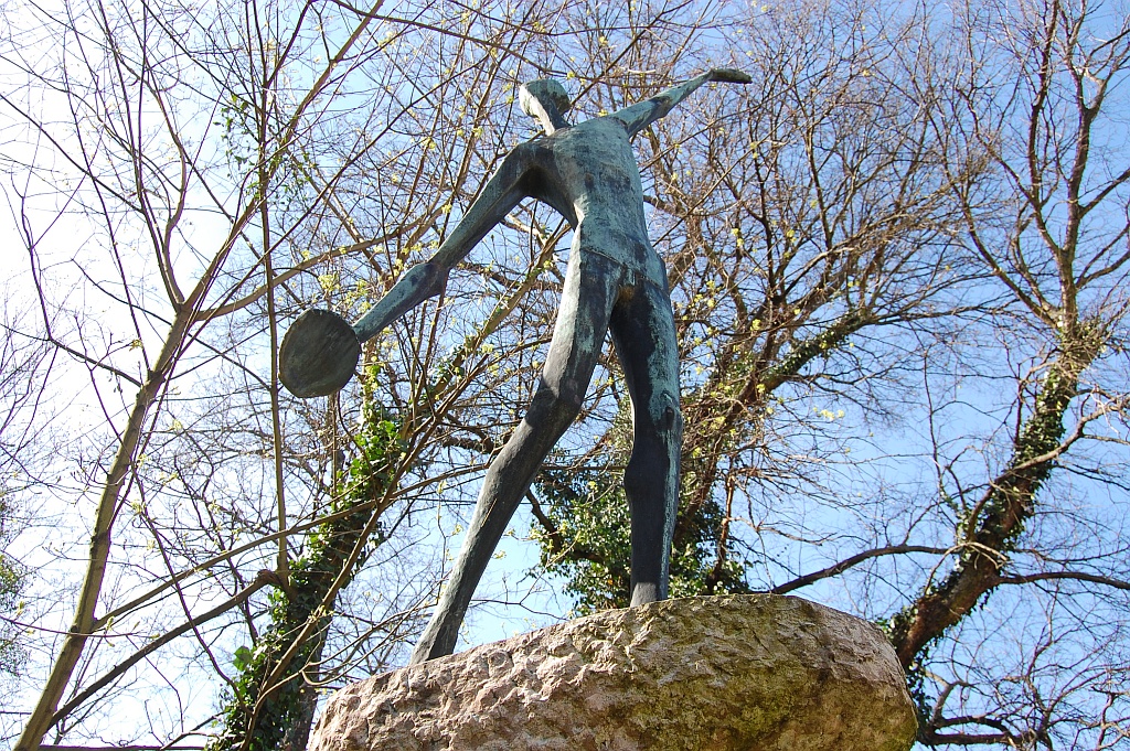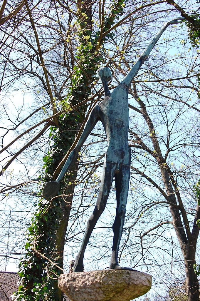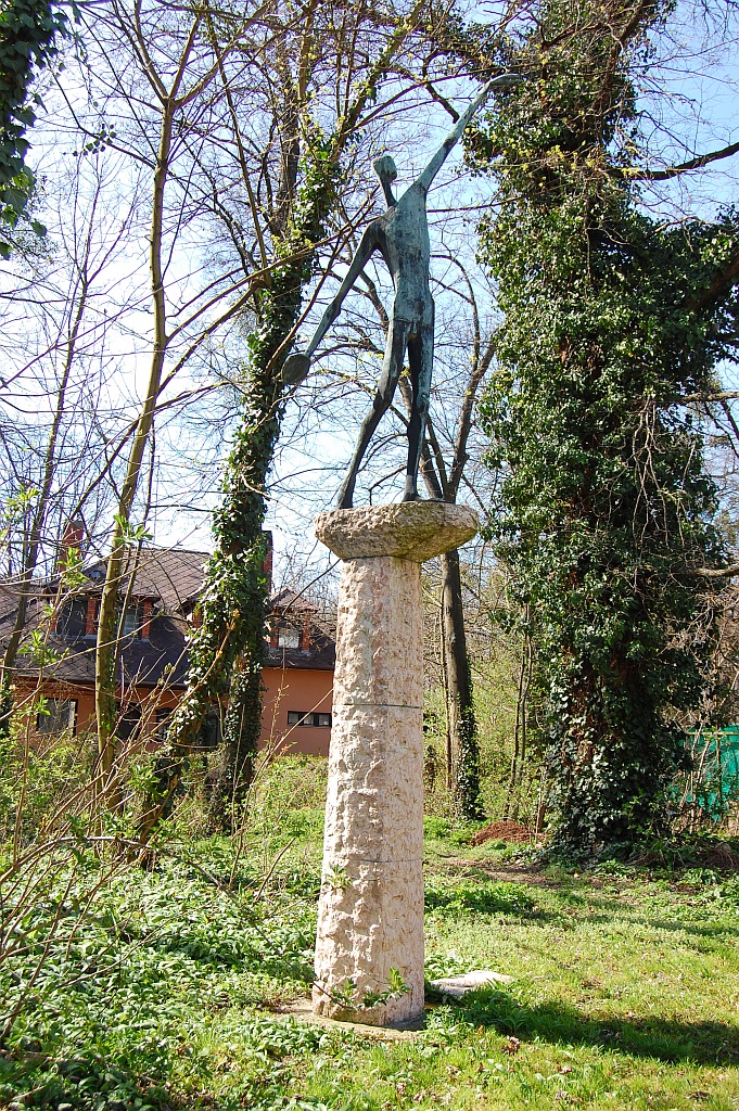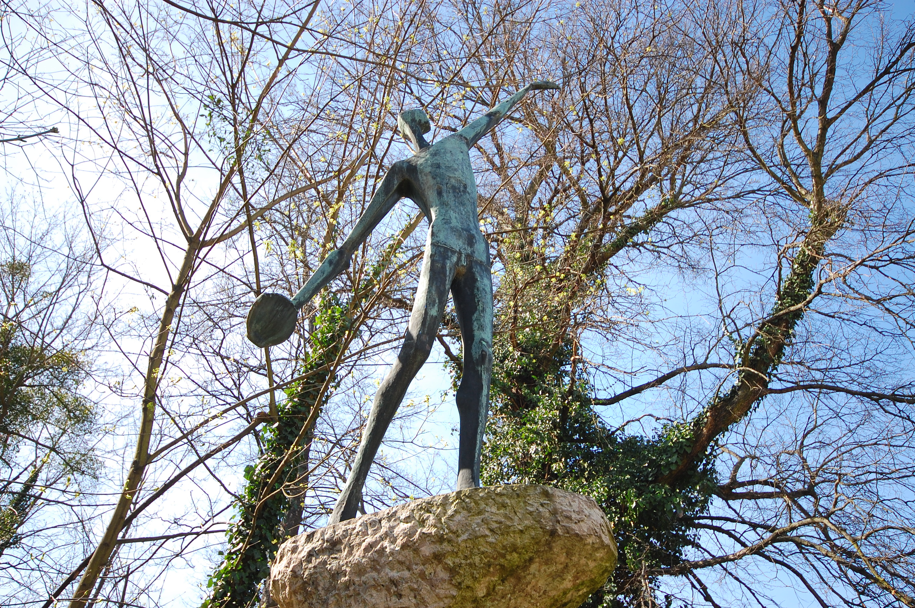 Mintha nem tudná, hogy legalább száz éve várok rá. Nagyon szép, de a haja nem lobog, és sötét ruhában én bújok át a kerítésen, hogy lássam. Tényleg így voltam ezzel a szoborral, Laborcz Ferenc Diszkoszvetőjével, ahogy a Pál Utcai Fiúk énekli, mint a kisgyerek: legalább száz éve mindent tudtam róla, vártam rá, de a valóságban csak idén március végén láttam először. Hát jöjjön akkor ő. Ennek a blogon belül az időben visszafele haladó, három részből álló, a három egyalakos Laborcz-szoborral foglalkozó sorozatnak ez a középső darabja, az első (az időben ténylegesen utolsó) itt érhető el. Az időbeli megfordításnak végül lesz értelme — azt most leszámítva, hogy az újszülöttek a blogot mindig a legfrissebb poszttól visszafele olvassák –, remélhetőleg látni is fogjuk majd, miért.