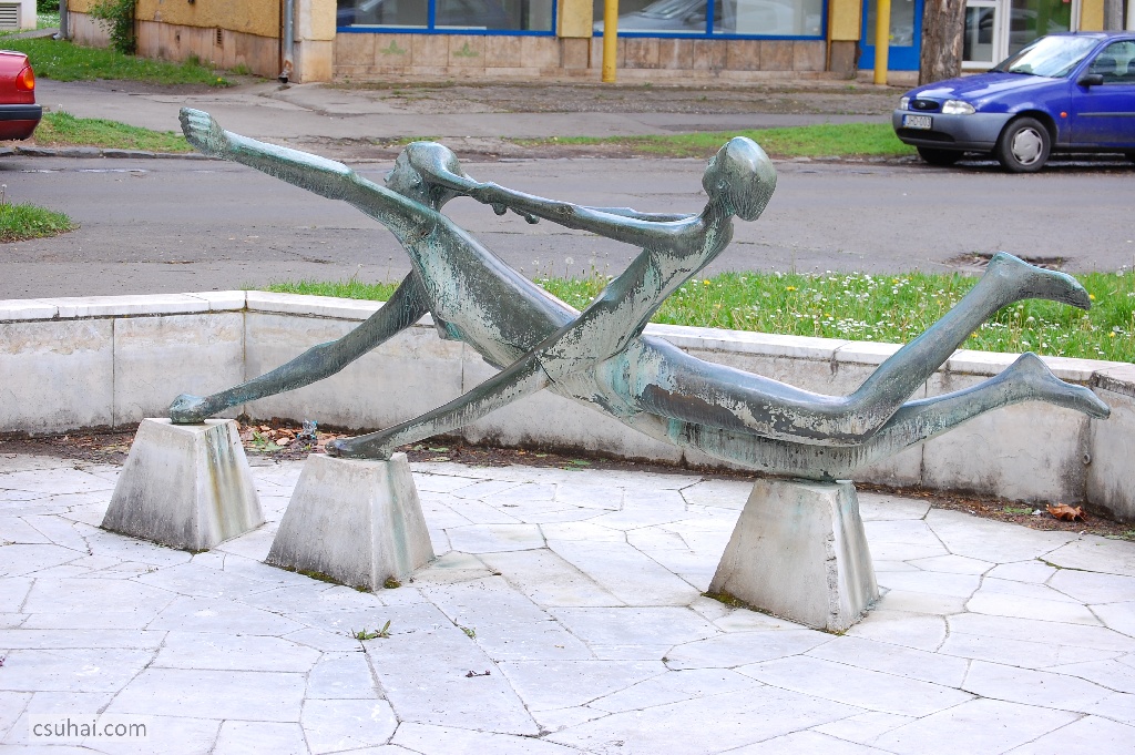 Két fiatal lány, a kamaszkorú nagyobb és a hátán ülő kisebb gyerek (vélhetően testvérek, hiszen a köztük lévő korkülönbség ilyen mértékű incselkedő intimitást más viszonyban nem engedne meg) a plasztikába foglalt “történet” szerint a vízen siklik, a három, a medence vízszintjére emelt betontömb végzi el a megtámasztást, ez azonban rendhagyó pozitúra, hiszen az alsó, nagyobbik test féloldalasan, csupán a két jobb oldali végtagjával, az ökölbe szorított jobb kezével