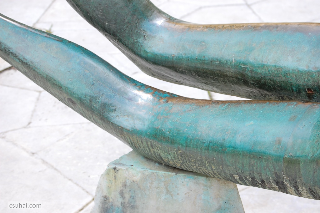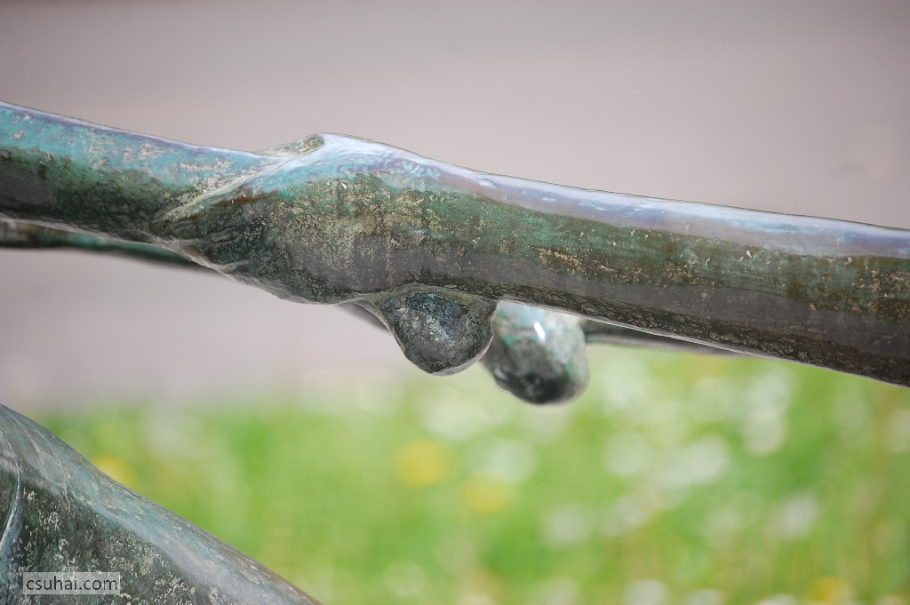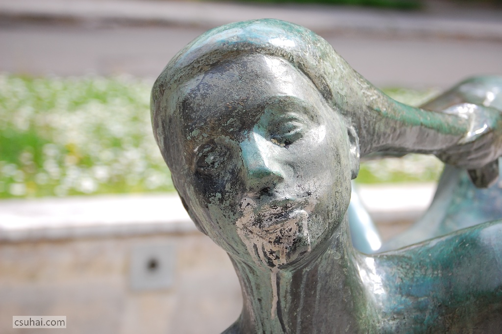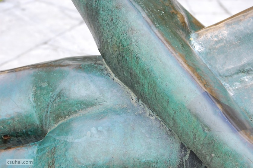 a bronz zöldes patinája meg a víz nélkül álló medence töredezett burkolásának közeiben előbukkanó kicsiny növény, “csak a zöld”. Idén, ahogy a napfényben előkerültek a szobor aranyos-rezes árnyalatai, inkább egyéb részletek.