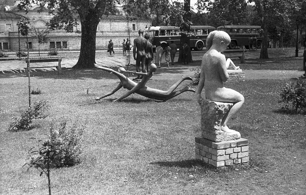 Hogy a szobor 1962-ben valóban készen volt, azt semmi nem bizonyítja jobban, mint az a Fortepanon látható kép, mely a Műcsarnok 1962-es szabadtéri szoborkiállításának néhány kiállított művét mutatja, középen, medence és a későbbi jellegzetes talapzat nélkül, a Műcsarnok a Műjégpálya felé eső északkeleti oldalánál ott fekszik a füvön a Játszó gyermekek: