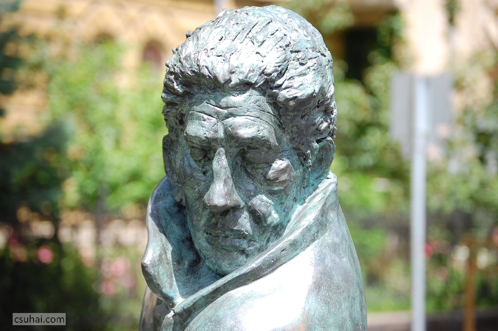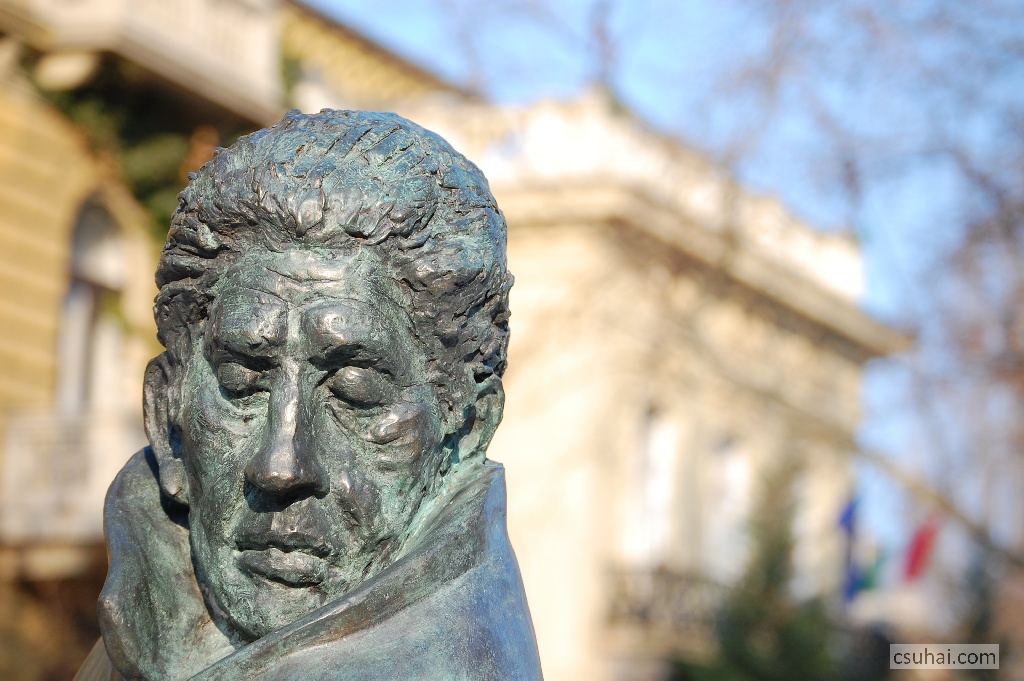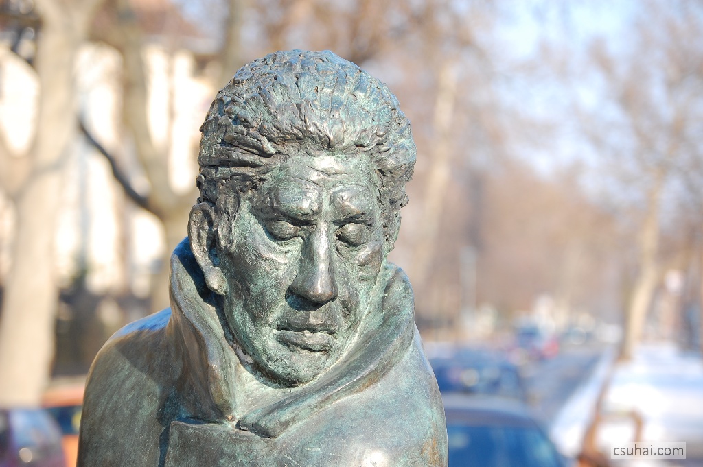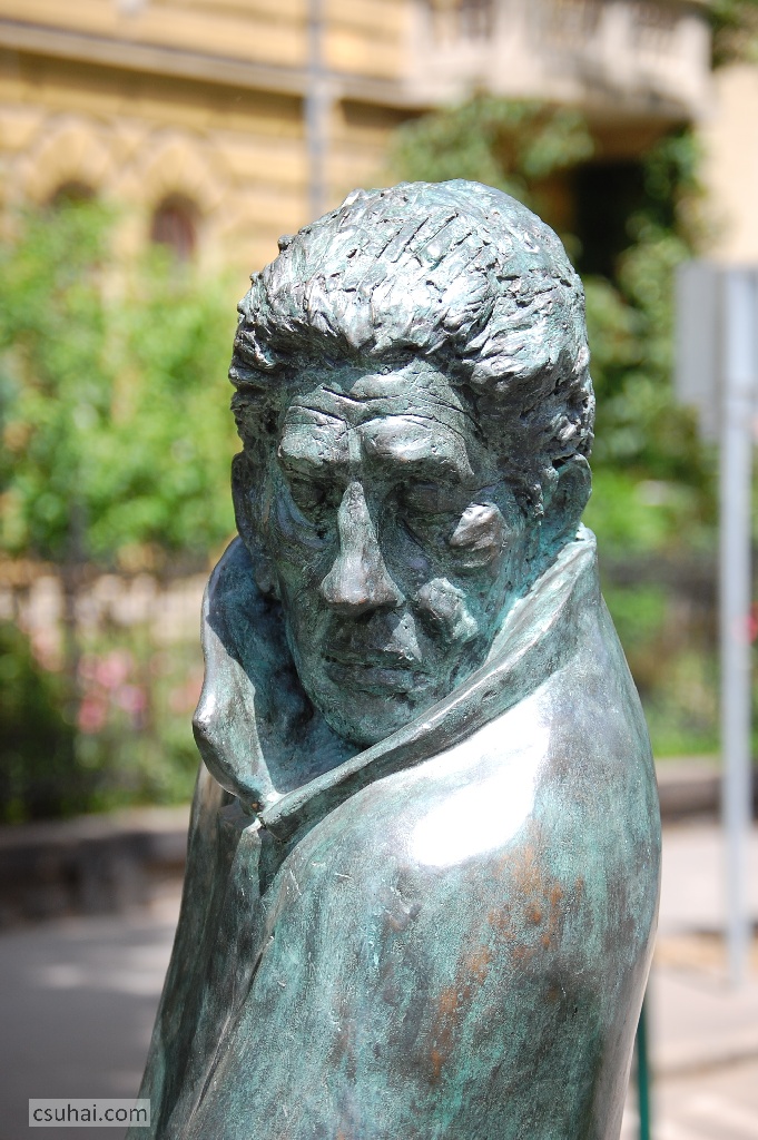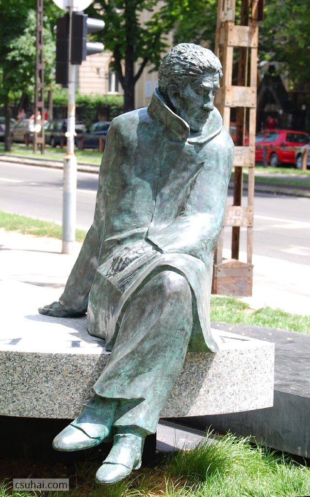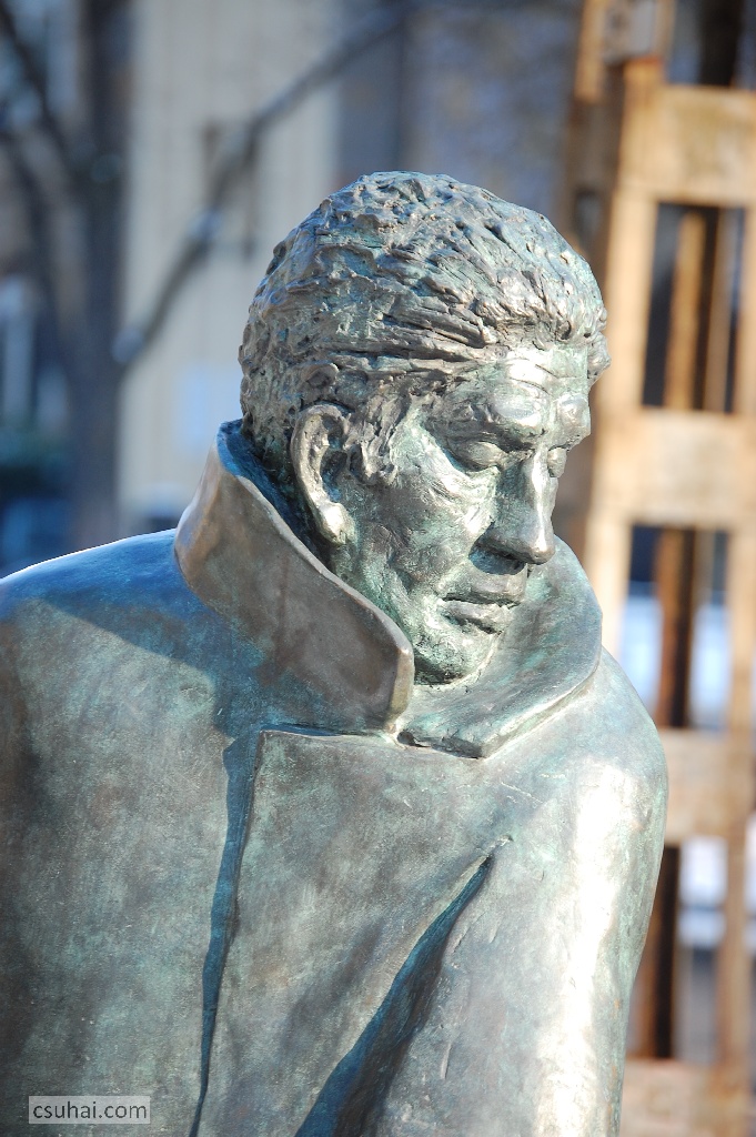 Bronzszobra könnyedén lógázza keresztbe tett lábait a kinyúló mészkő piedesztálon,