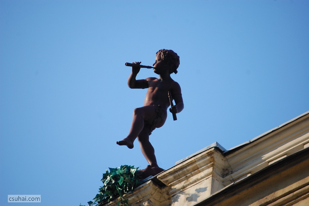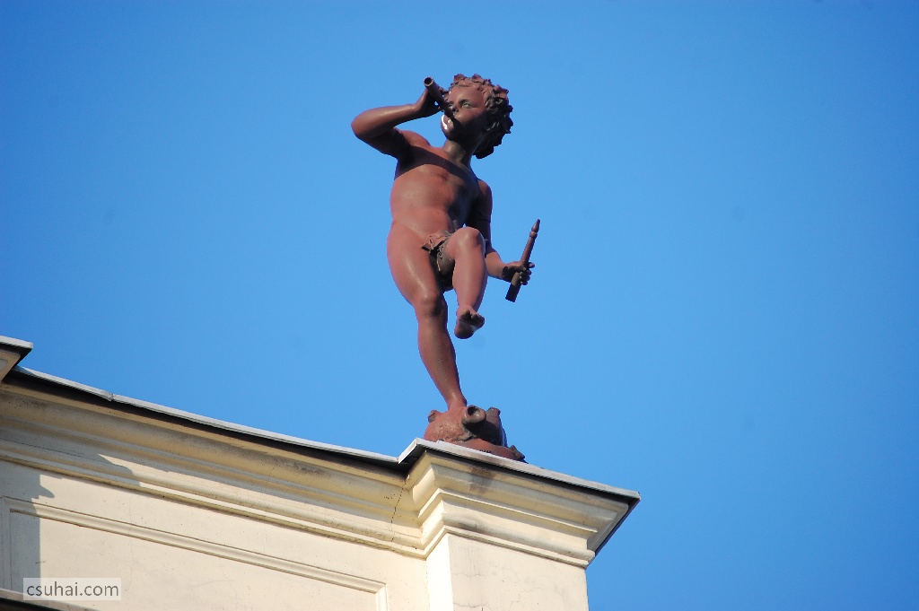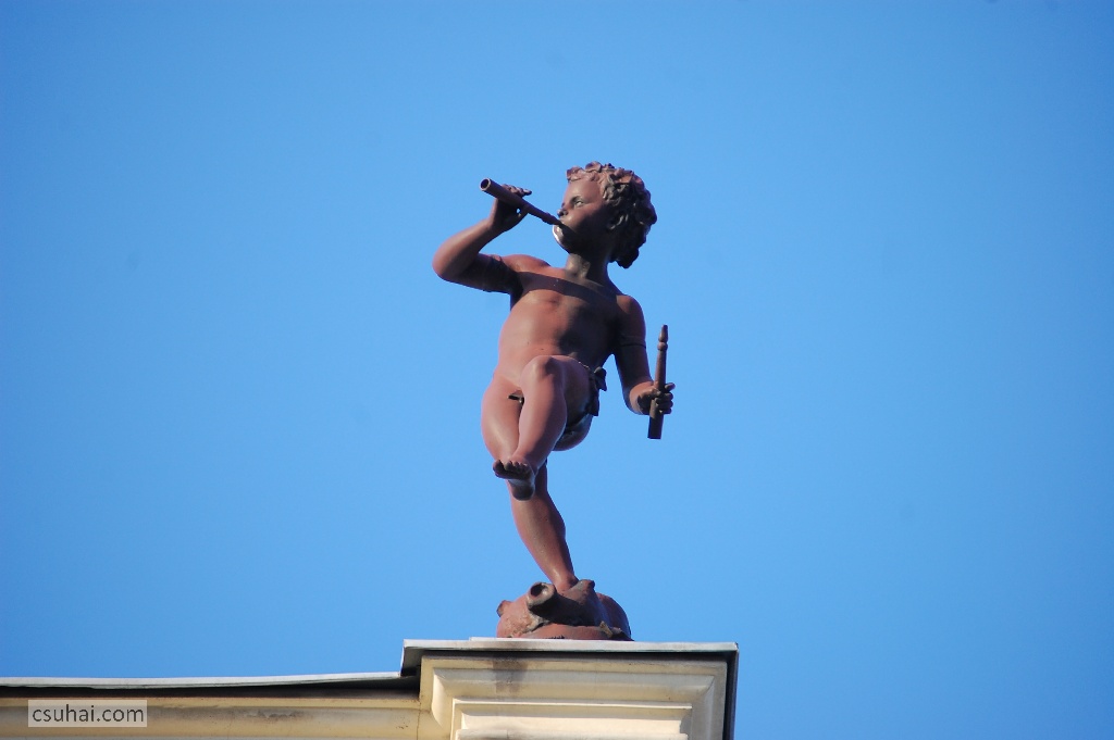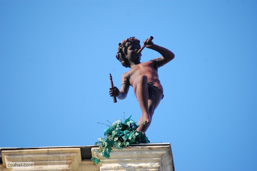 A szobrok azonosak, kettő a bal lábát lendíti, és a jobb kezével tartja szájában a megfújt sípot, a megmaradt három figura közül a középső éppen fordítva, tükörképe a másik kettőnek, ő a bal lábára támaszkodik és a jobb kezével hadonászik, hogy megőrizze szépséges egyensúlyát.