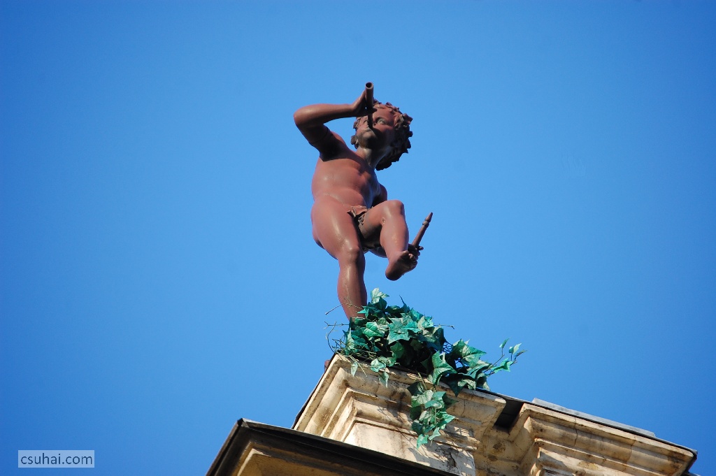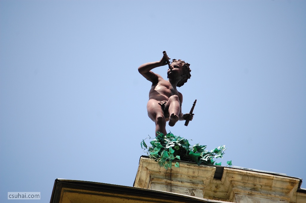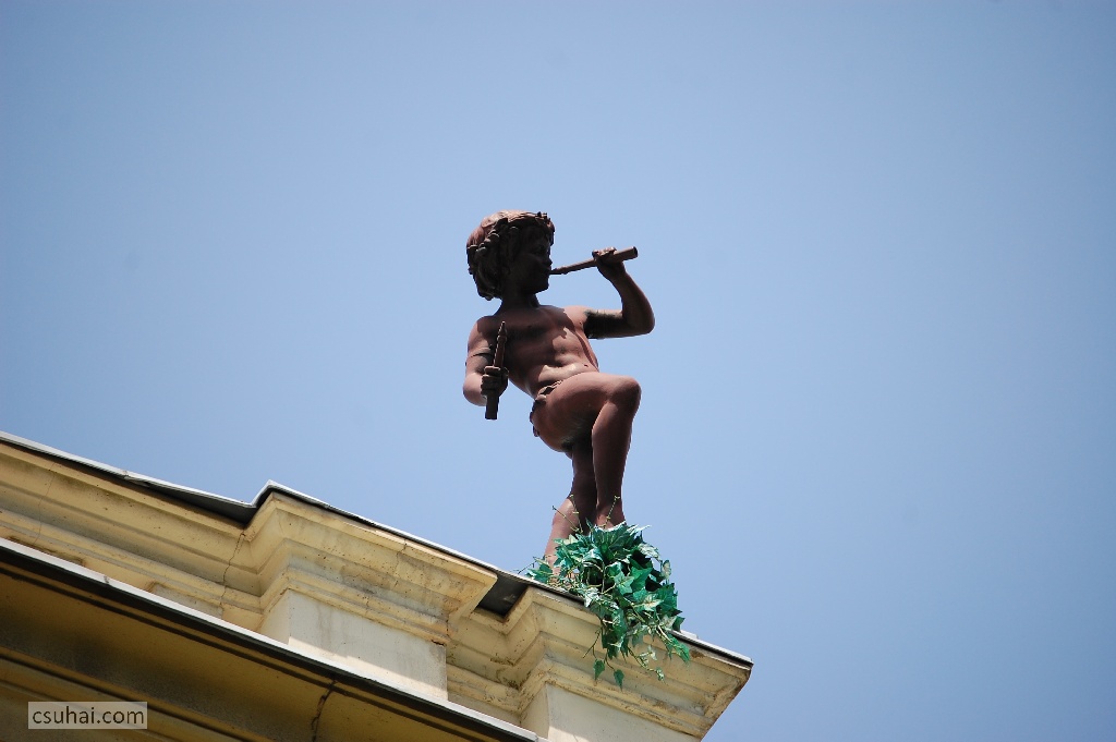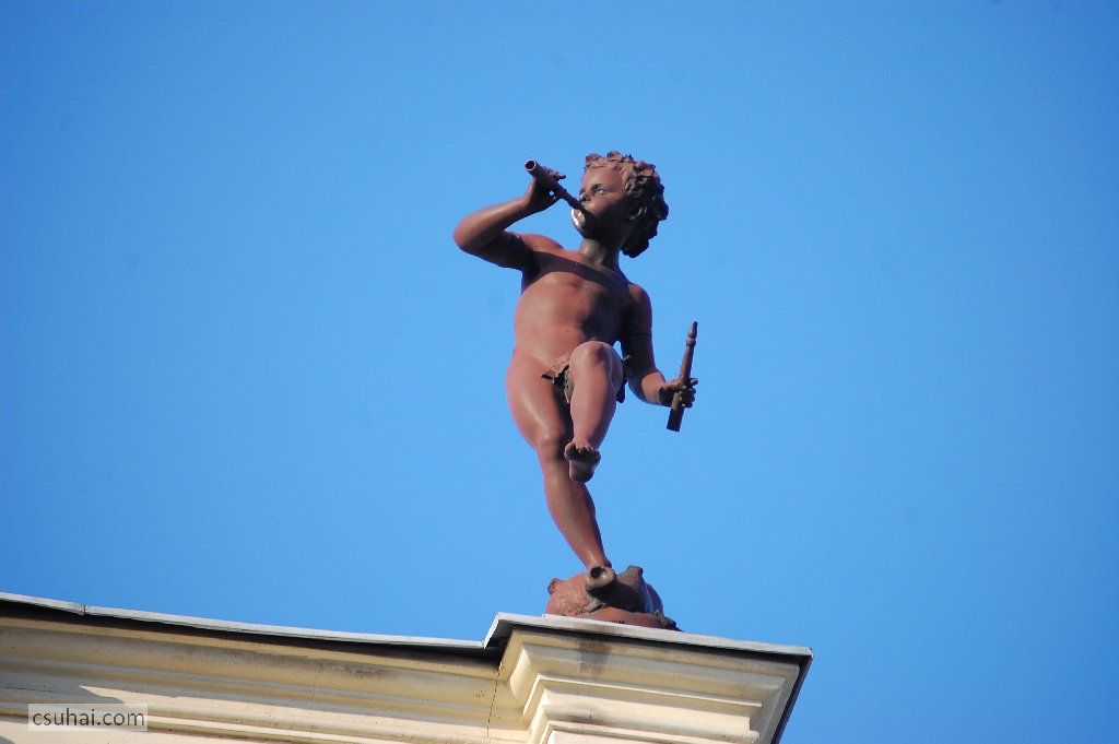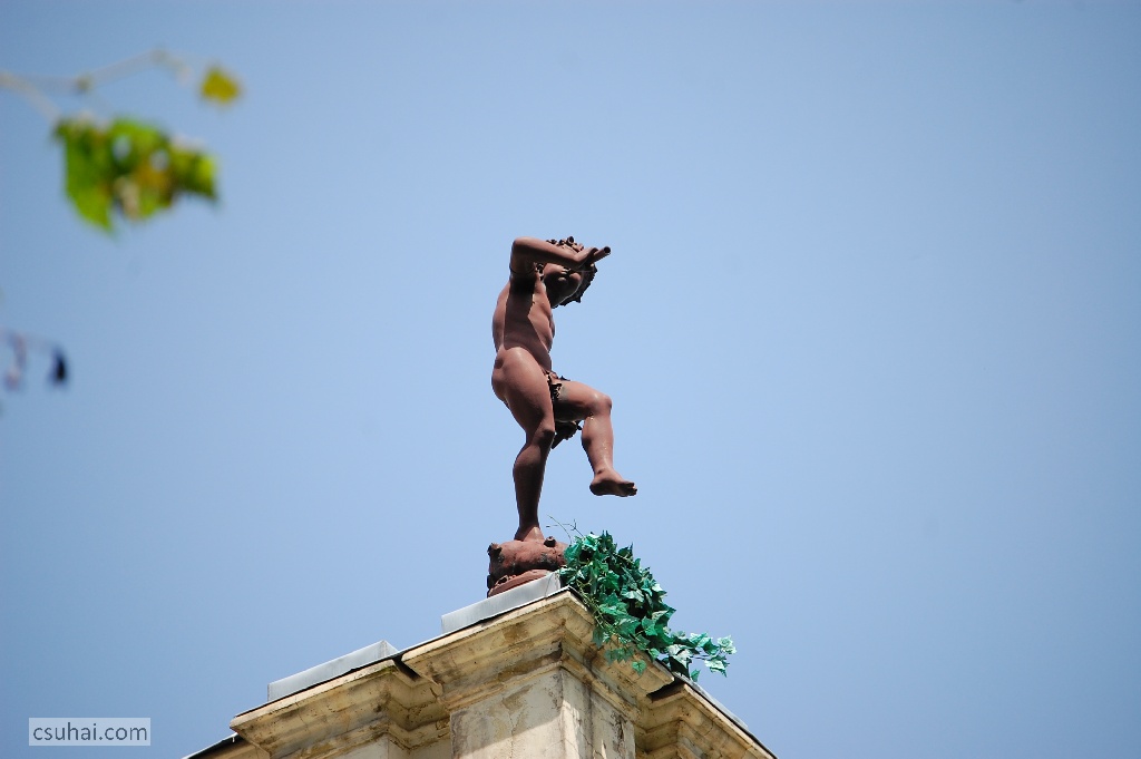 A szobrok azonosak, kettő a bal lábát lendíti, és a jobb kezével tartja szájában a megfújt sípot, a megmaradt három figura közül a középső éppen fordítva, tükörképe a másik kettőnek, ő a bal lábára támaszkodik és a jobb kezével hadonászik, hogy megőrizze szépséges egyensúlyát.