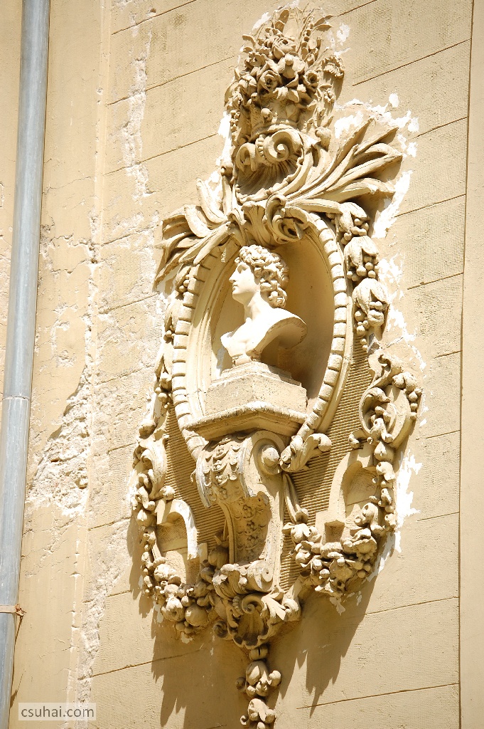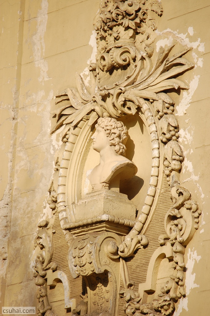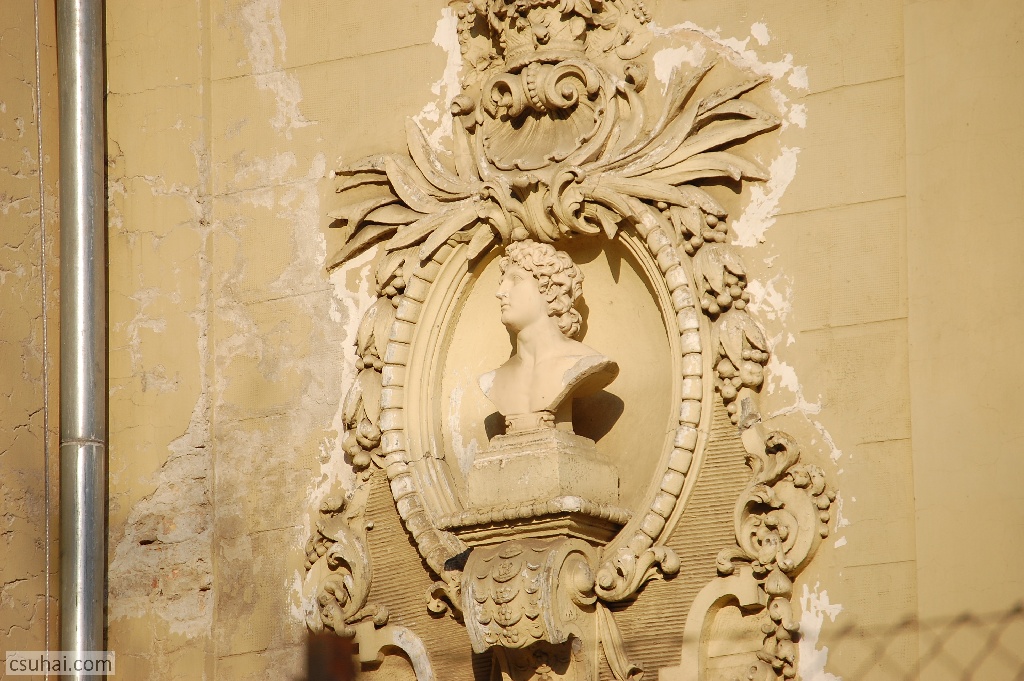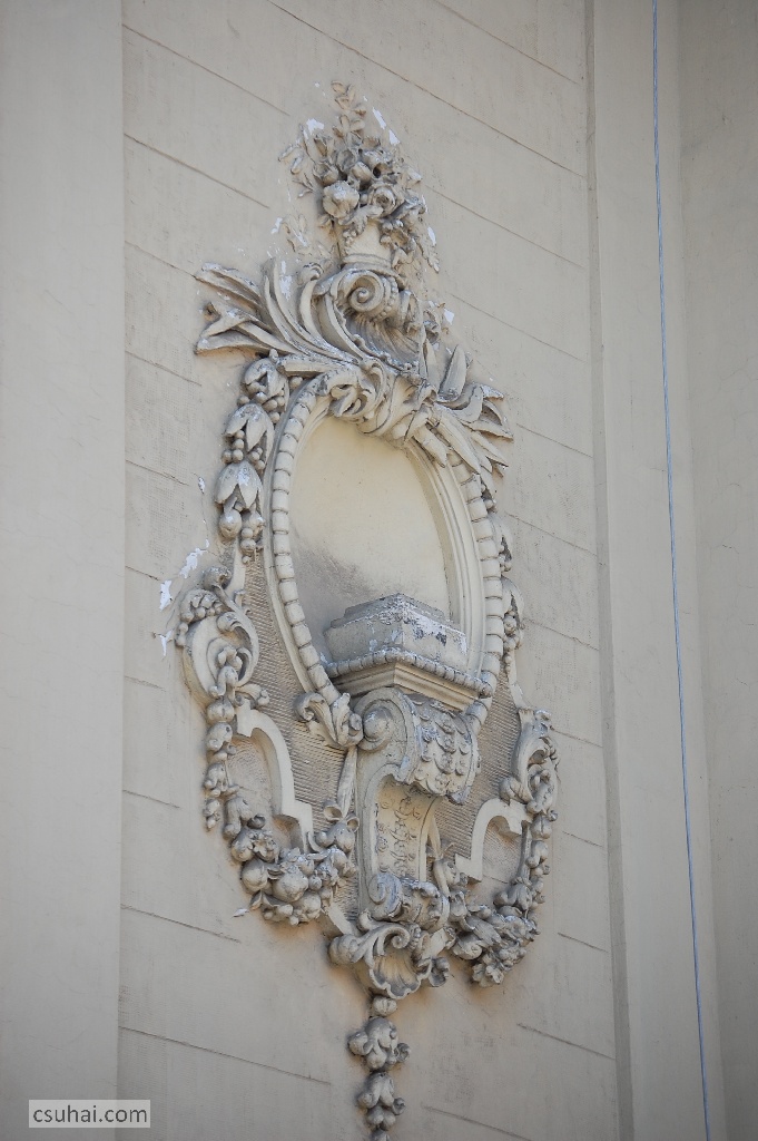 A másik oldalon a szimmetrikusan elhelyezett, hasonló díszítésű szoborfülke üres: valaki eltűnt innen.