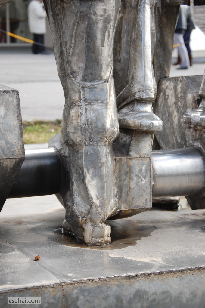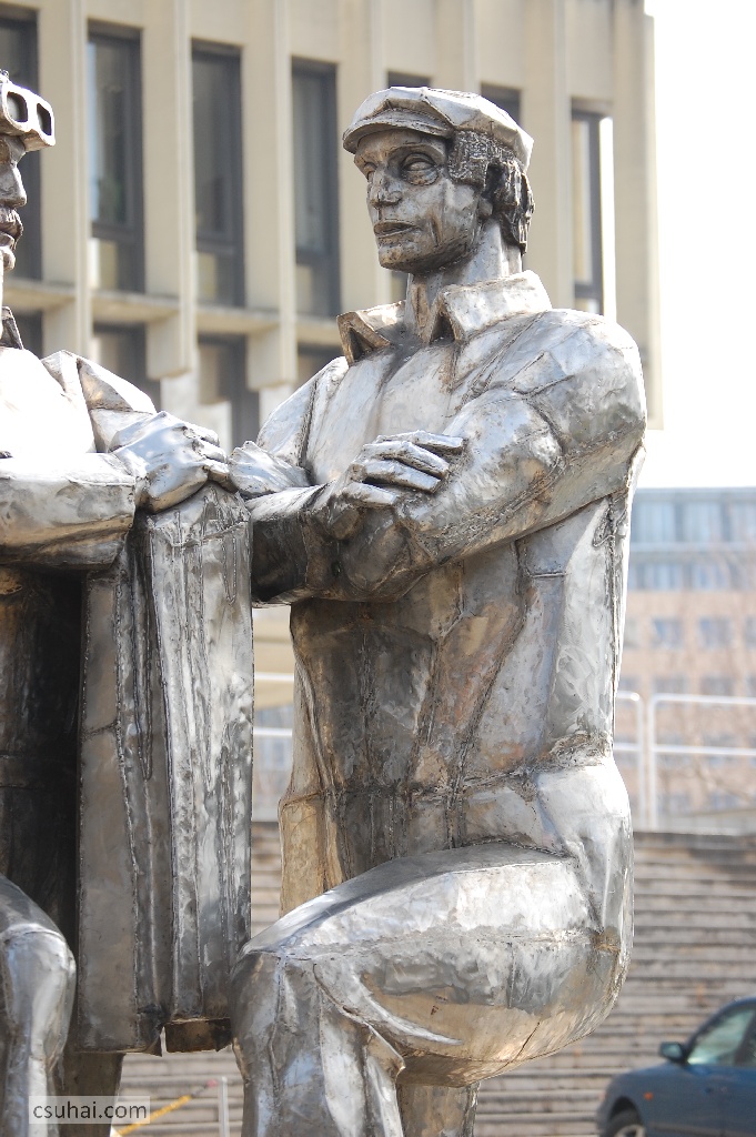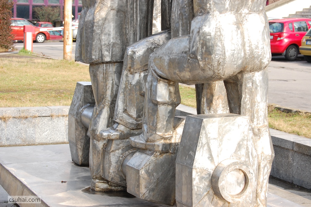 aki a köztes időben sem ódzkodott attól, hogy alakjaira a korra jellemző ruházatot aggasson, mint pédául 1975-ben, a zuglói házasságkötő terem udvarán felállított Sejt című munkáján. A Munkások szinte tobzódik a részletekben, és ezt a tobzódást kiszolgálja, jóformán előhívja a hegesztéses krómacél-technika.