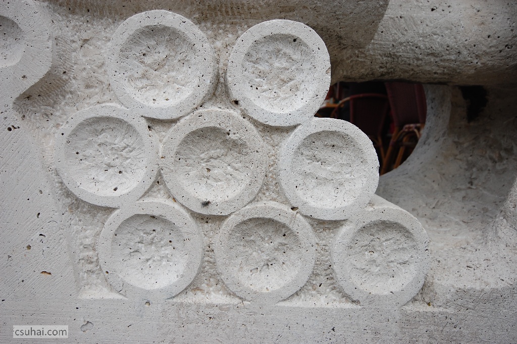 A harmadik mű, Marton László Figurális rácskompozíciója is kor és alkotás kérdéseit feszegeti. Ezt a darabot még a tapolcai zsinagógáról szóló bejegyzésem végén említettem, a fent látható képpel. Az épület a Bakonyi Bauxitbányák Vállalat 1968-ban épült tapolcai székháza volt eredetileg, “Jó szerencsét!” volt az elnevezése, Marton műve ennek a sarkán, a földszinten kapott helyet L-alakban, hosszabb szára az egykori Lenin térre, rövidebbik a Kossuth Lajos utcára nézett.