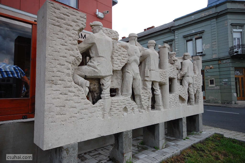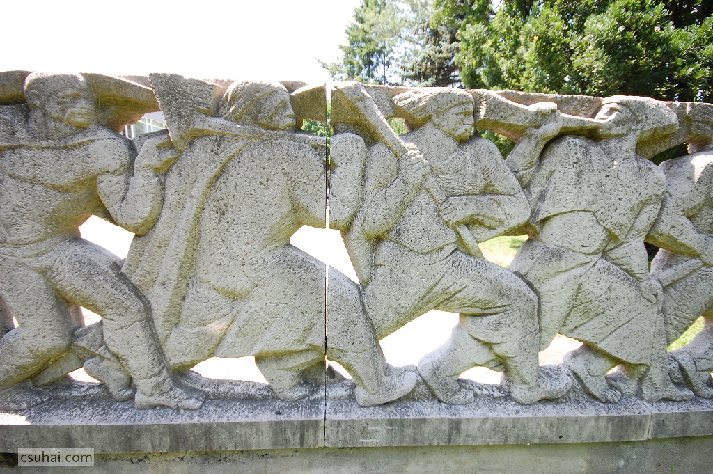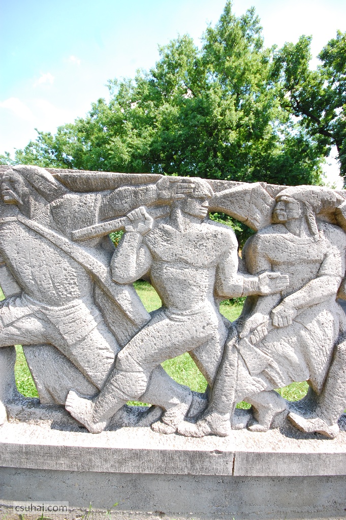 amott fegyvereket cipelnek, de ugyanaz a testtartás és mozdulat, a lépő alakok ugyanolyan sora, “Dózsa népe”, nem véletlen, hogy Dózsa kegyetlen halálbüntetésének középkori kiötlői éppen azt a végzetet szánták a népvezérnek, amit. Kárpáti Anna különleges vizuális-szobrászati megoldással teszi különbözővé a két oldalt,