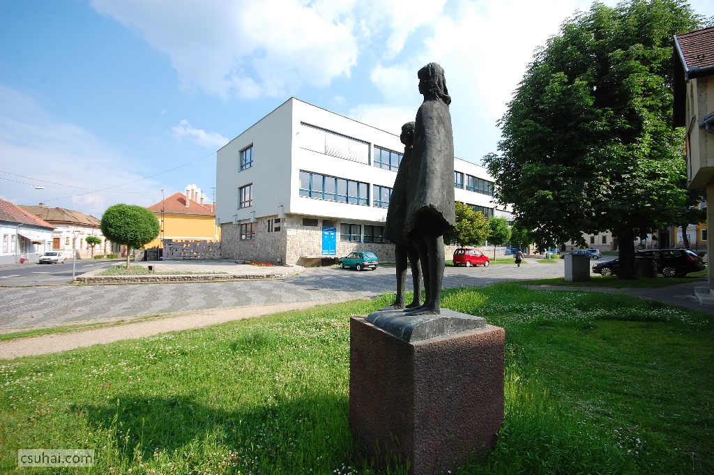 az egyszerű modernizmusával maradandó iskolaépület és a régi Vác egyszintes lakóházainak környezetébe — és más szobrok közelsége sem zavarja.