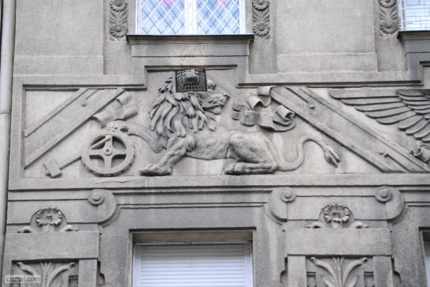 És ha már Cházár András utca, akkor az ELTE Radnóti Miklós Gyakorló Iskola kapubejárata, azon is a bejárati ajtók közül a középső, jobb alsó üvegkazetta előtti, oroszlánt ábrázoló rács,