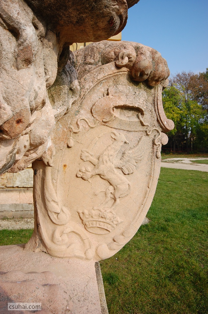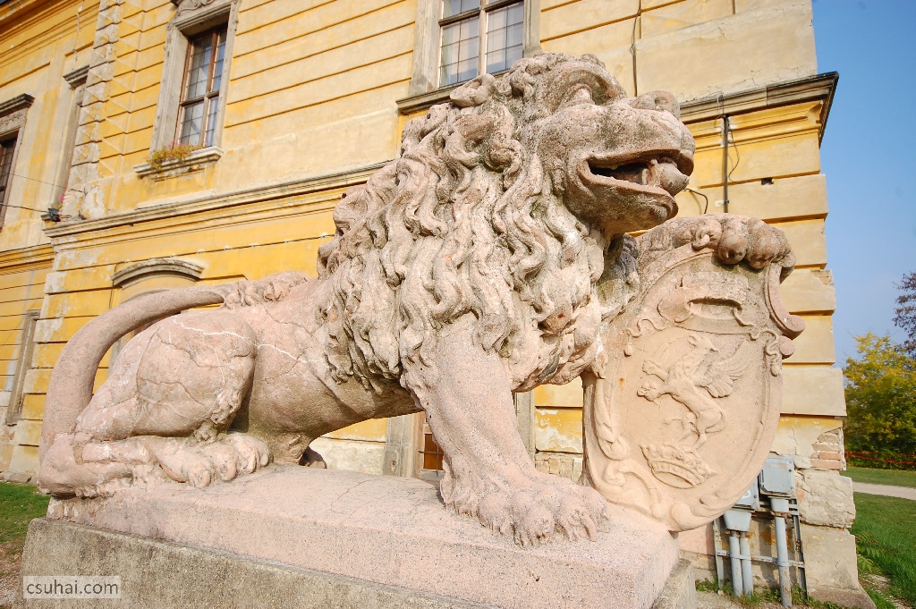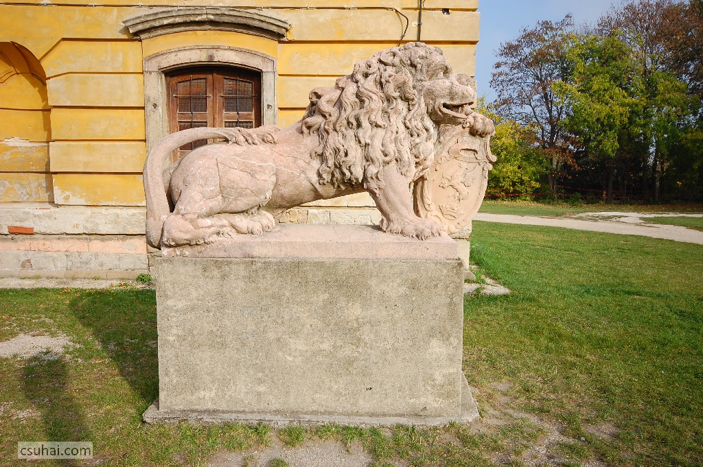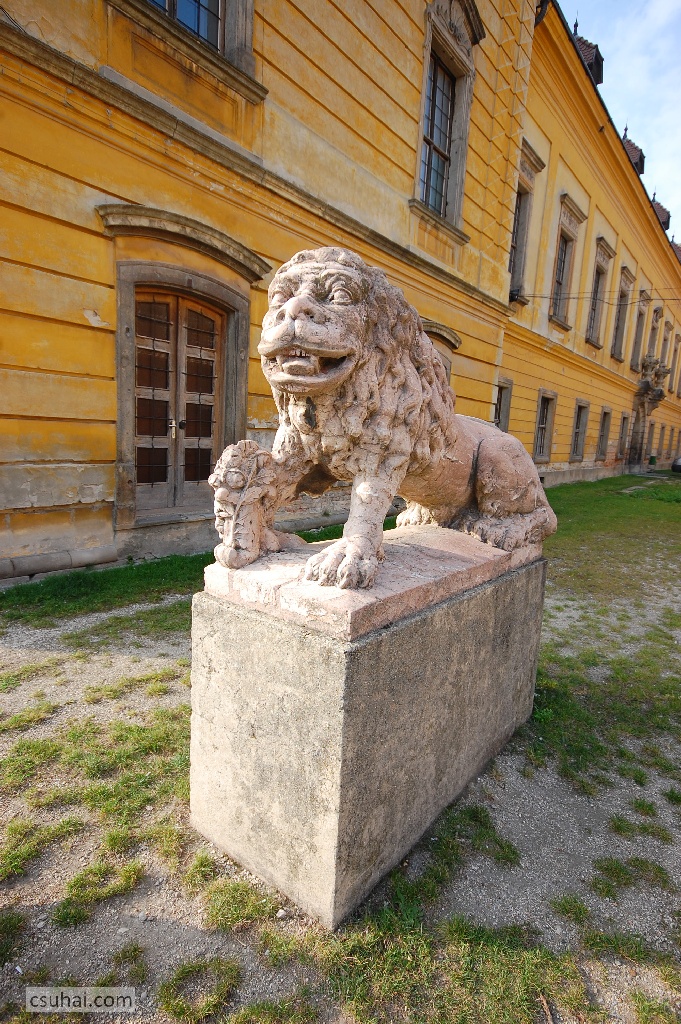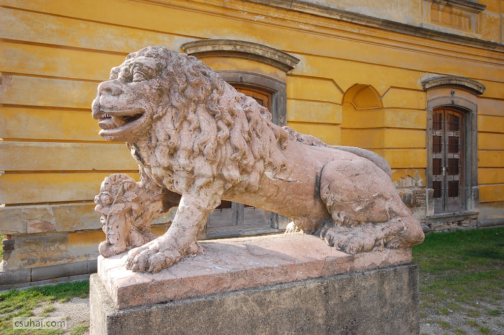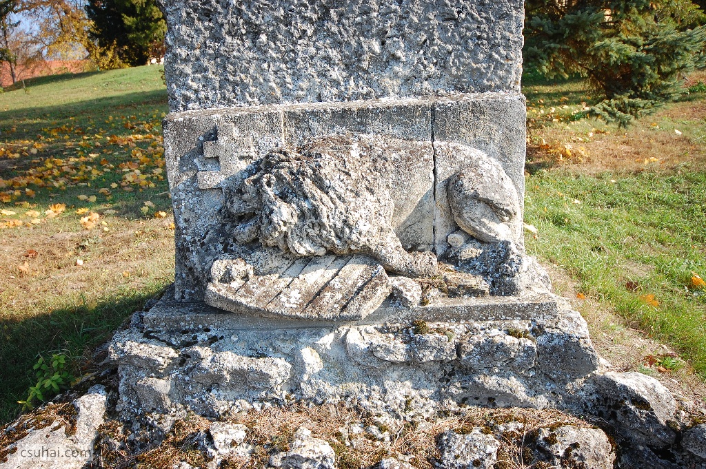 És ha már szomszéd, még a szomszédnál is szomszédabb az Esterházy-címerállat, például ez a törődött példány Gannán, a családi mauzóleum előtti 48-as emlékművön,
