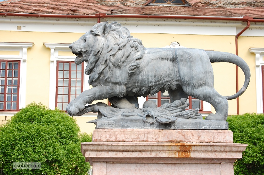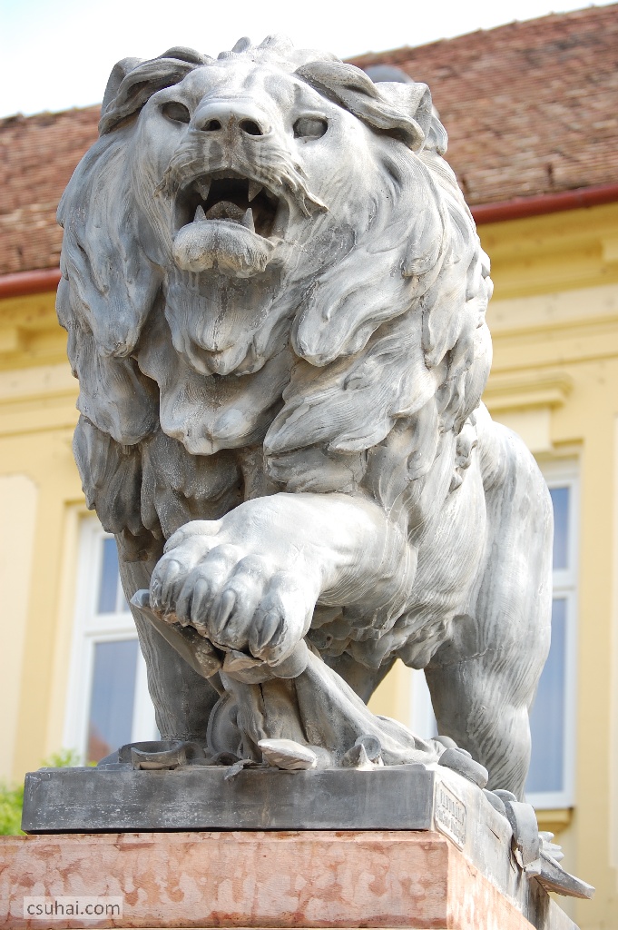 Ha a szomszédba megyünk mégis, rögtön itt van Révkomáromban, a Klapka-szobor talapzatánál Róna József oroszlánja,