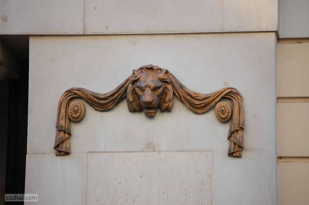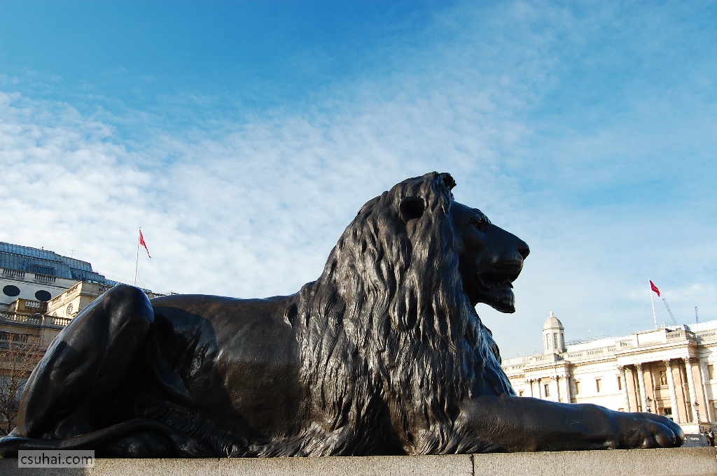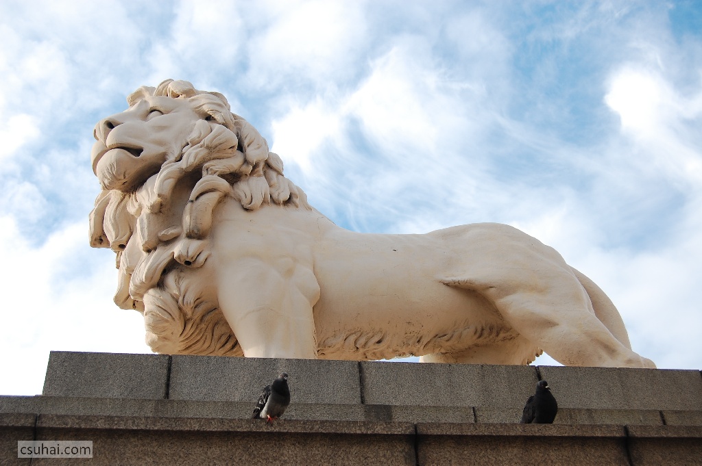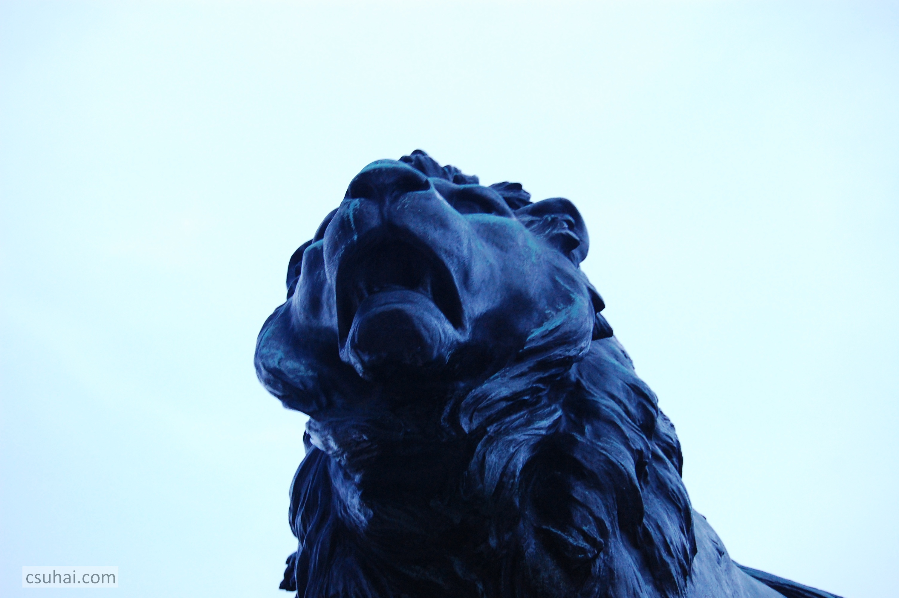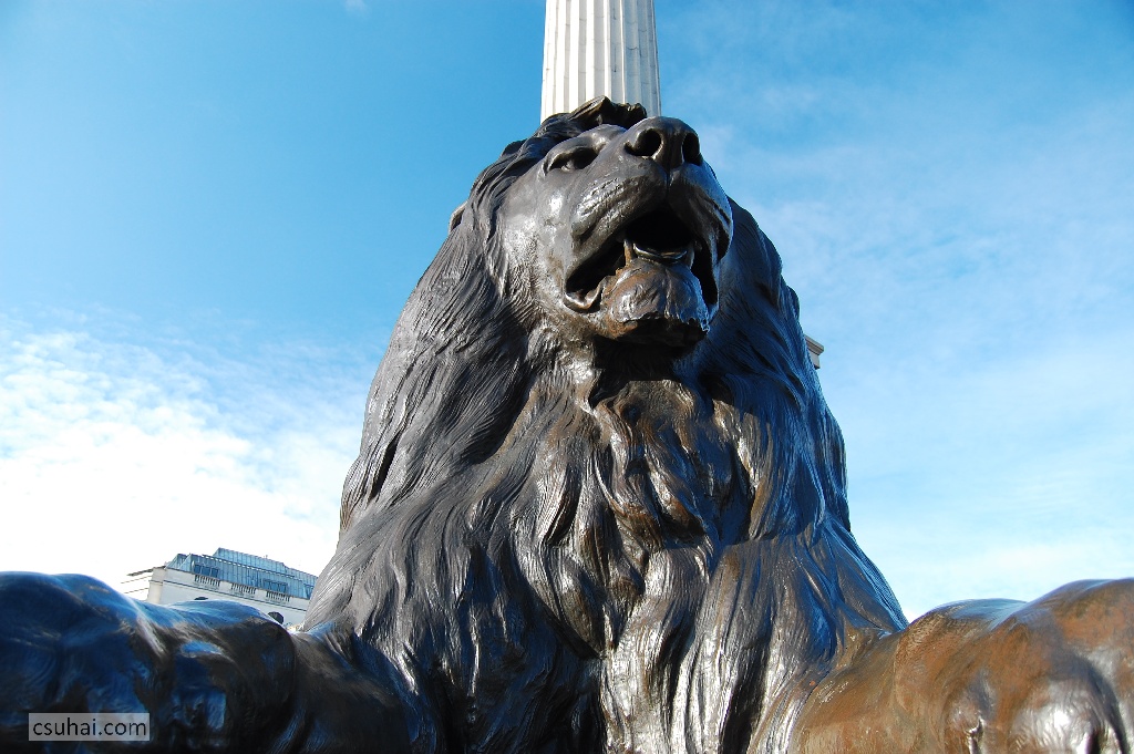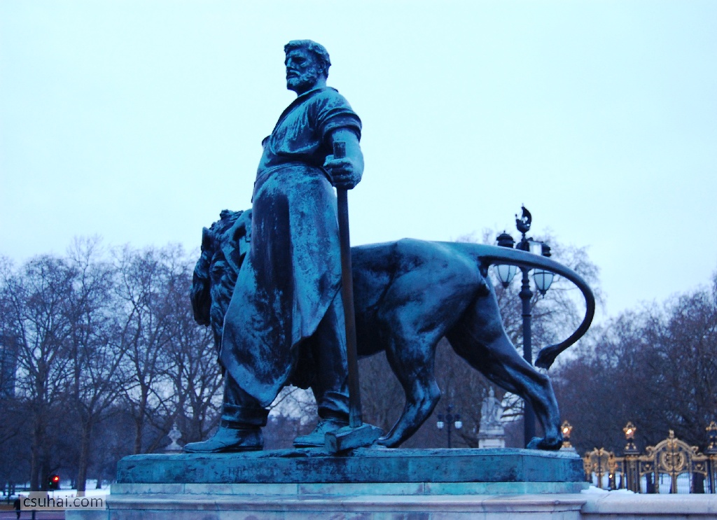 mint Sir Thomas Brock oroszlánjait a Buckingham Palota előtt, a Victoria Emlékmű körül (a négy közül a szürkületben készült képeken itt most csak kettő látható, a sarlóval a Földművelés/Mezőgazdaság, illetve a hosszúnyelű kalapáccsal az Ipar/Kézművesség allegóriája). 1911-ben, az emlékmű avatásakor V. Györgyöt állítólag annyira megindította az egész kompozíció látványa, nagymamája ábrázolása és a hosszú életű királyi öregasszony emlékének méltó ápolása, hogy azonnal kardot kért, és a helyszínen lovaggá ütötte a szobrászt — így volt-e vagy sem, az oroszlánok ebben az instant művészi elismerésben még biztosan nem osztoztak Sir Thomas Brockkal, mert ők csak tizenhárom évvel ezután, 1924-ben kerültek végső helyükre.