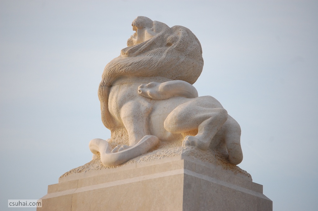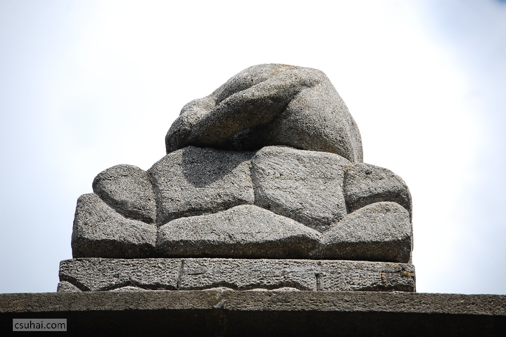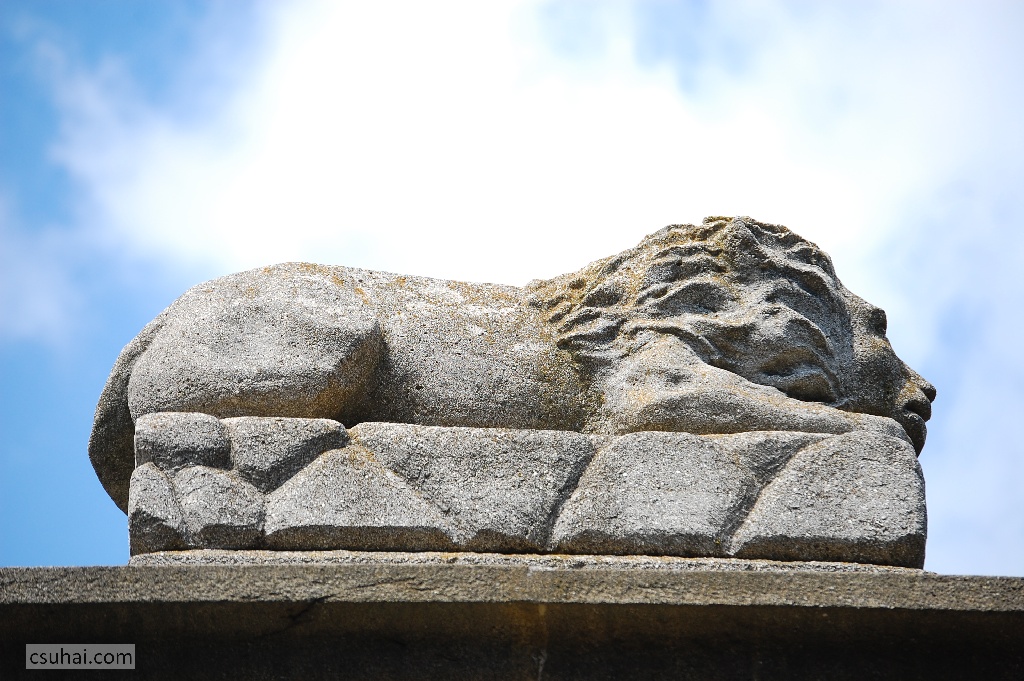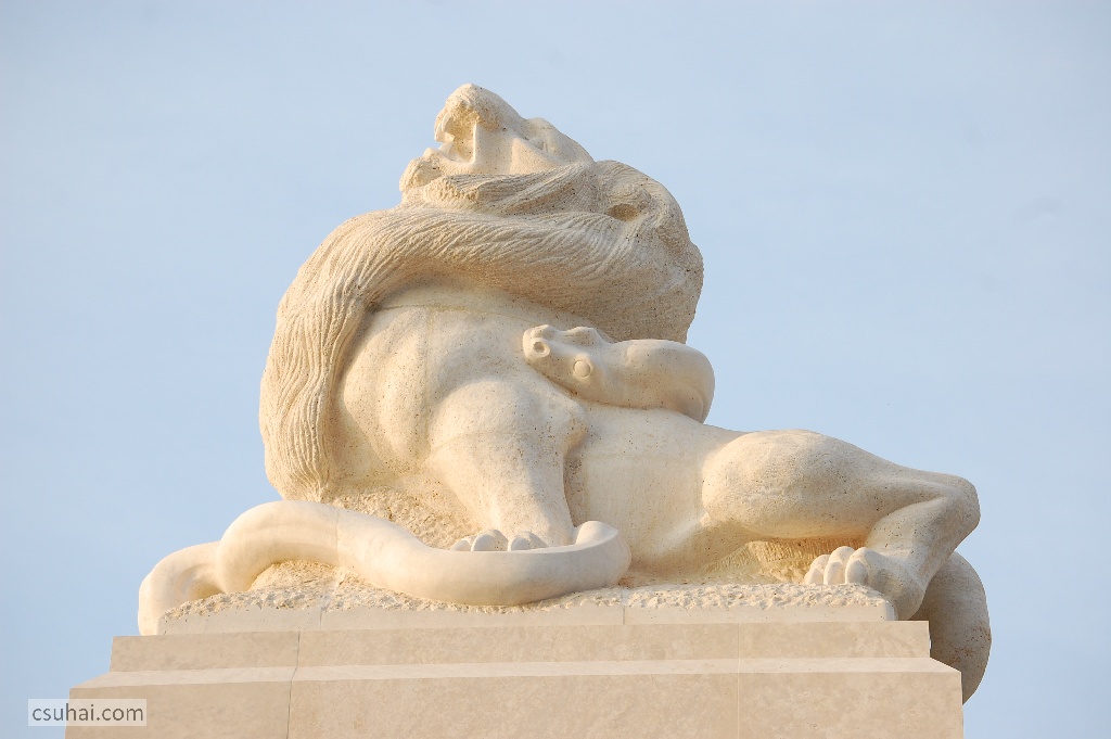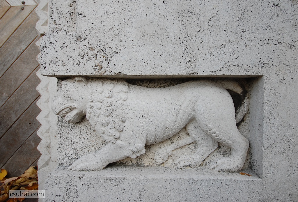 a Tisza-szoborcsoport tetején a mű egyetlen értékelhető szobrászati elemét, egy fekvő oroszlánt,