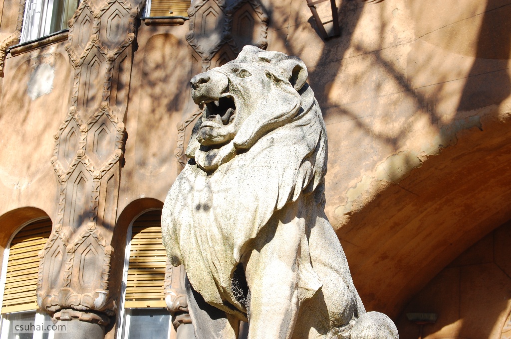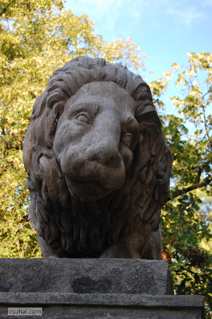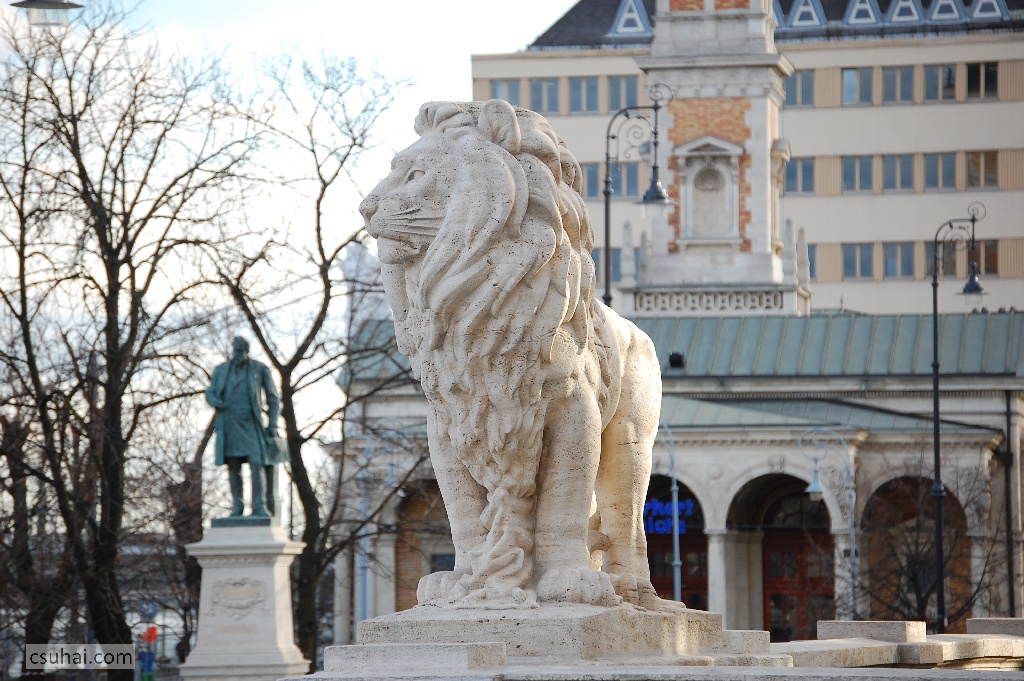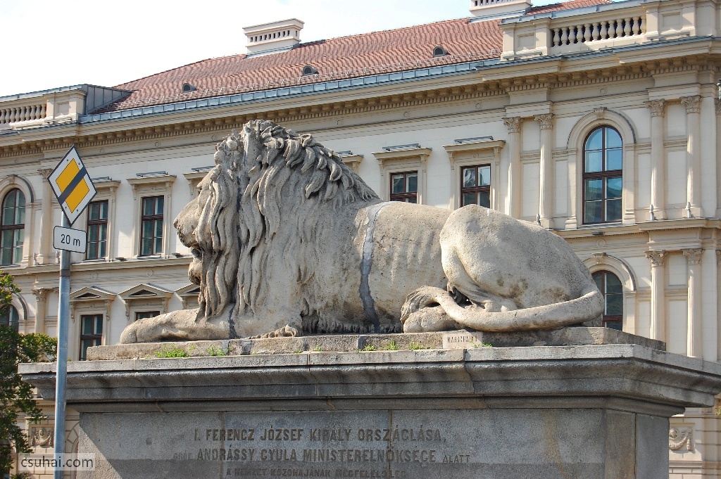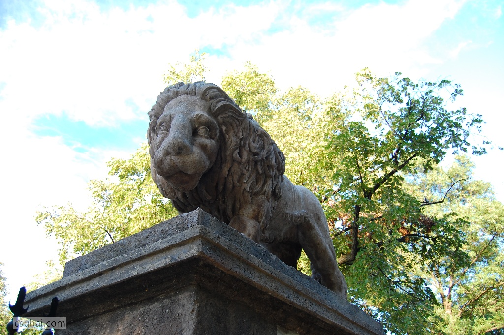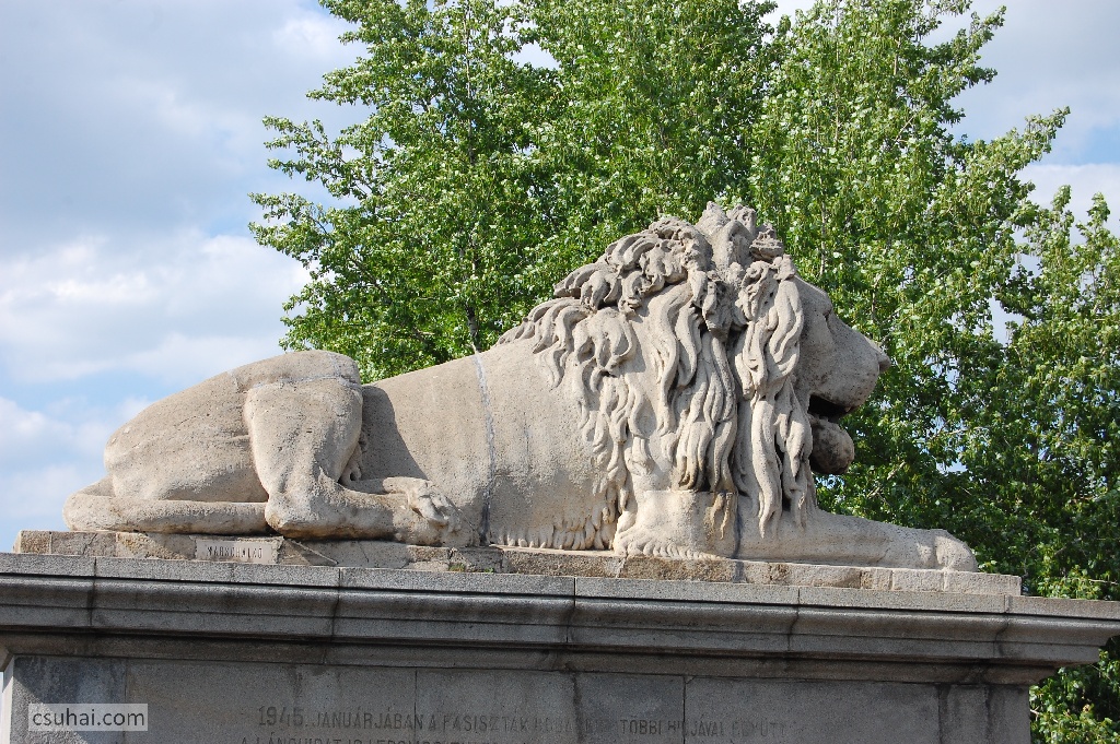 és mivel az eredeti darabokról néhány fényképen kívül semmiféle pontos dokumentáció vagy minta nem maradt fenn, a korszak felfogása szerint új oroszlánszobrokat kellett készíteni; de a korszak felfogása hálistennek nem esett távol a korábbi korszak felfogásától, a szocreál oroszlán pontosan olyan, mint a történelmi dicsőséget hirdető klasszikus — csak egy kicsit jóltápláltabb. A szelíd napfény és a háttér itt mindenesetre segít eloszlatni Nagy Lajos a Képtelen természetrajzban olvasható kételyét, hogy vajon a sárga vagy a vörös az oroszlán természetes színe,