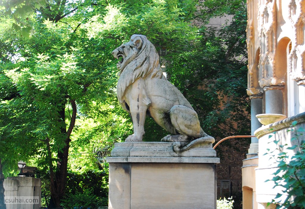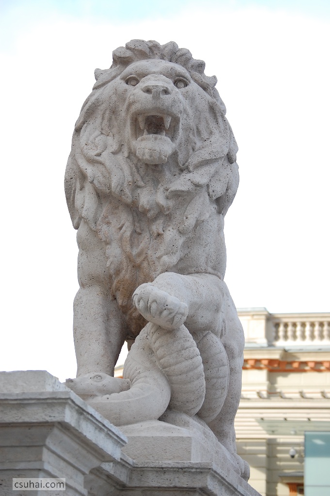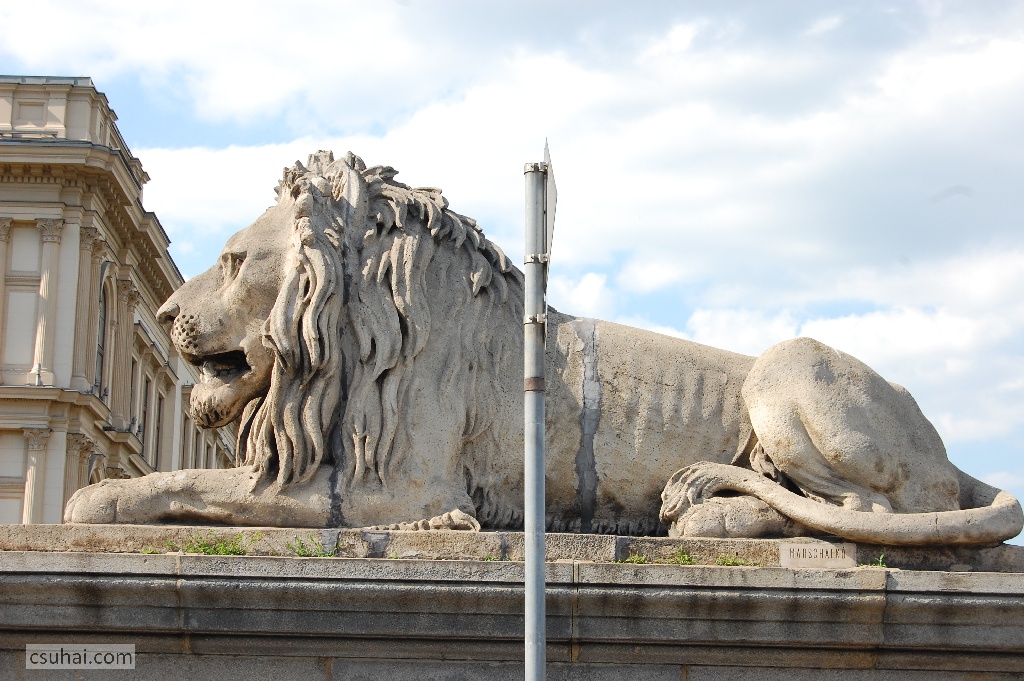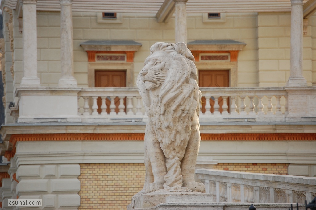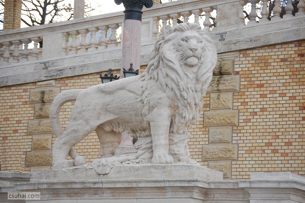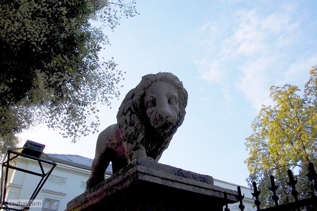 és mivel az eredeti darabokról néhány fényképen kívül semmiféle pontos dokumentáció vagy minta nem maradt fenn, a korszak felfogása szerint új oroszlánszobrokat kellett készíteni; de a korszak felfogása hálistennek nem esett távol a korábbi korszak felfogásától, a szocreál oroszlán pontosan olyan, mint a történelmi dicsőséget hirdető klasszikus — csak egy kicsit jóltápláltabb. A szelíd napfény és a háttér itt mindenesetre segít eloszlatni Nagy Lajos a Képtelen természetrajzban olvasható kételyét, hogy vajon a sárga vagy a vörös az oroszlán természetes színe,