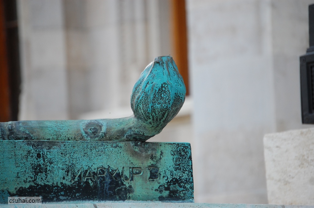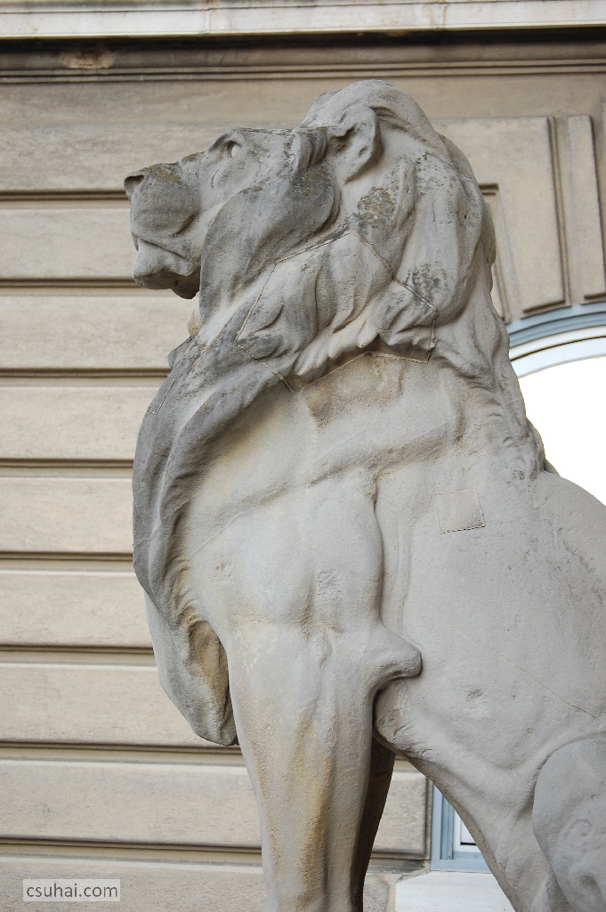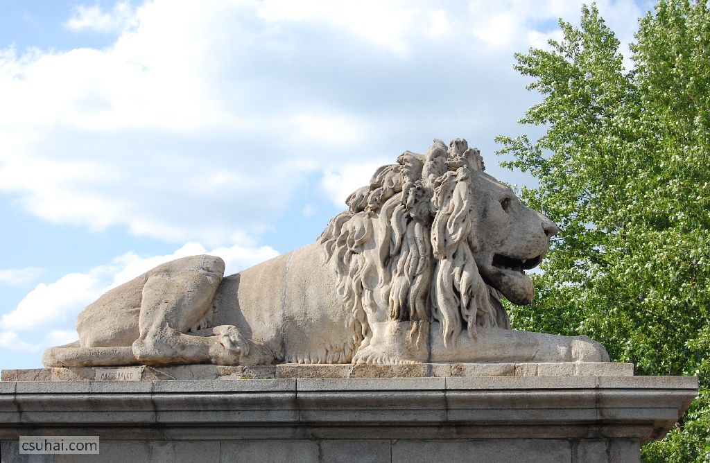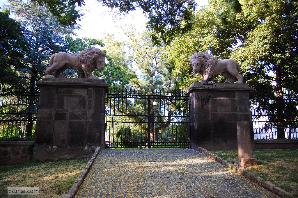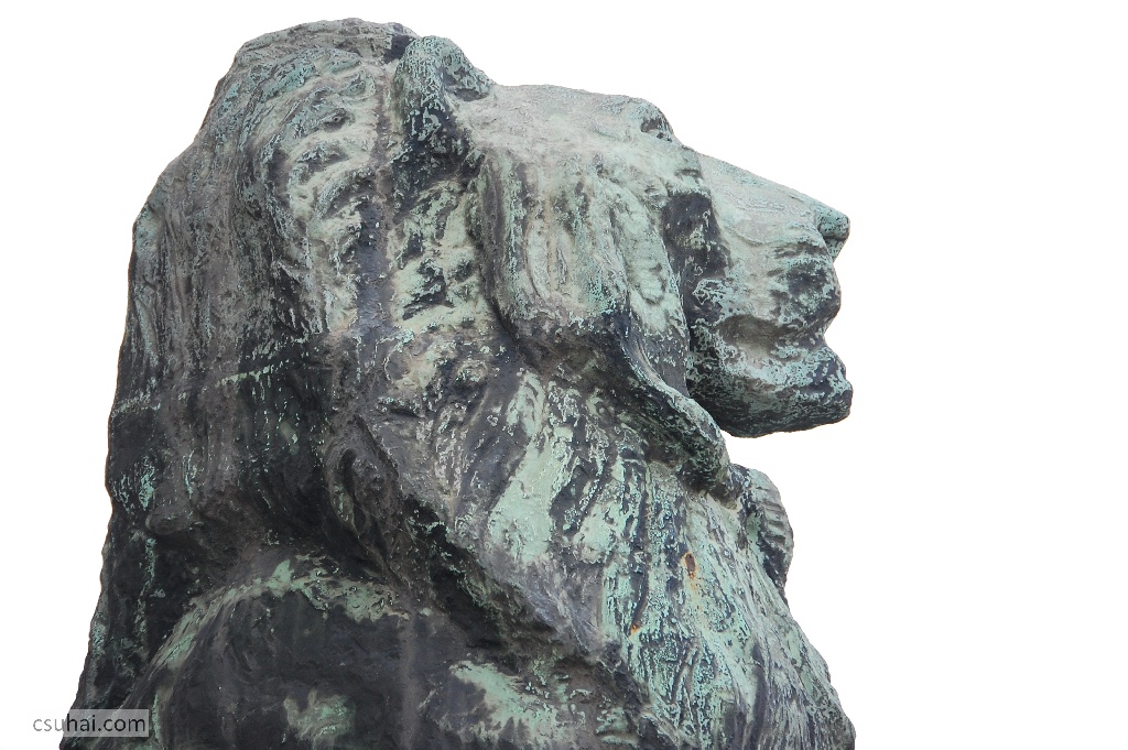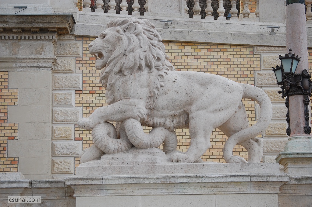 és mivel az eredeti darabokról néhány fényképen kívül semmiféle pontos dokumentáció vagy minta nem maradt fenn, a korszak felfogása szerint új oroszlánszobrokat kellett készíteni; de a korszak felfogása hálistennek nem esett távol a korábbi korszak felfogásától, a szocreál oroszlán pontosan olyan, mint a történelmi dicsőséget hirdető klasszikus — csak egy kicsit jóltápláltabb. A szelíd napfény és a háttér itt mindenesetre segít eloszlatni Nagy Lajos a Képtelen természetrajzban olvasható kételyét, hogy vajon a sárga vagy a vörös az oroszlán természetes színe,