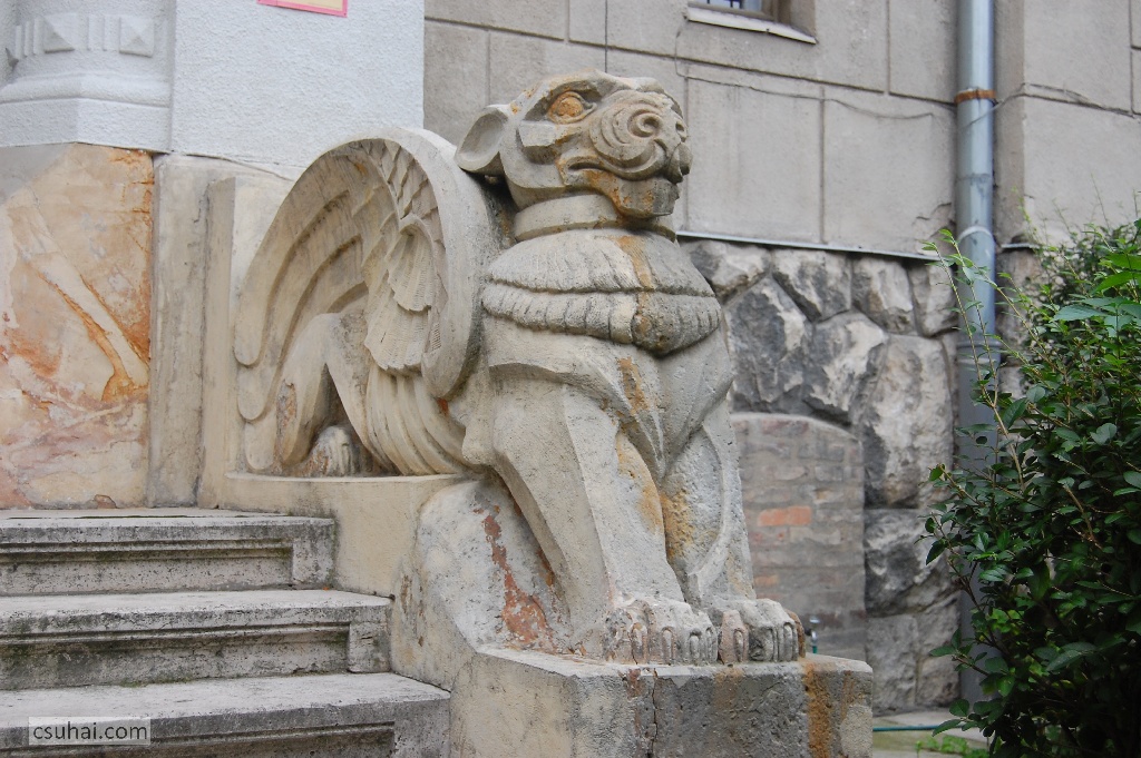és ha a Radnóti, akkor a belső udvaron az épület eredeti tervezőjének, Lajta Bélának emlékül állított oroszlán az iskola egyik udvari ajtóját jelző “oroszlános kapu” fölött,