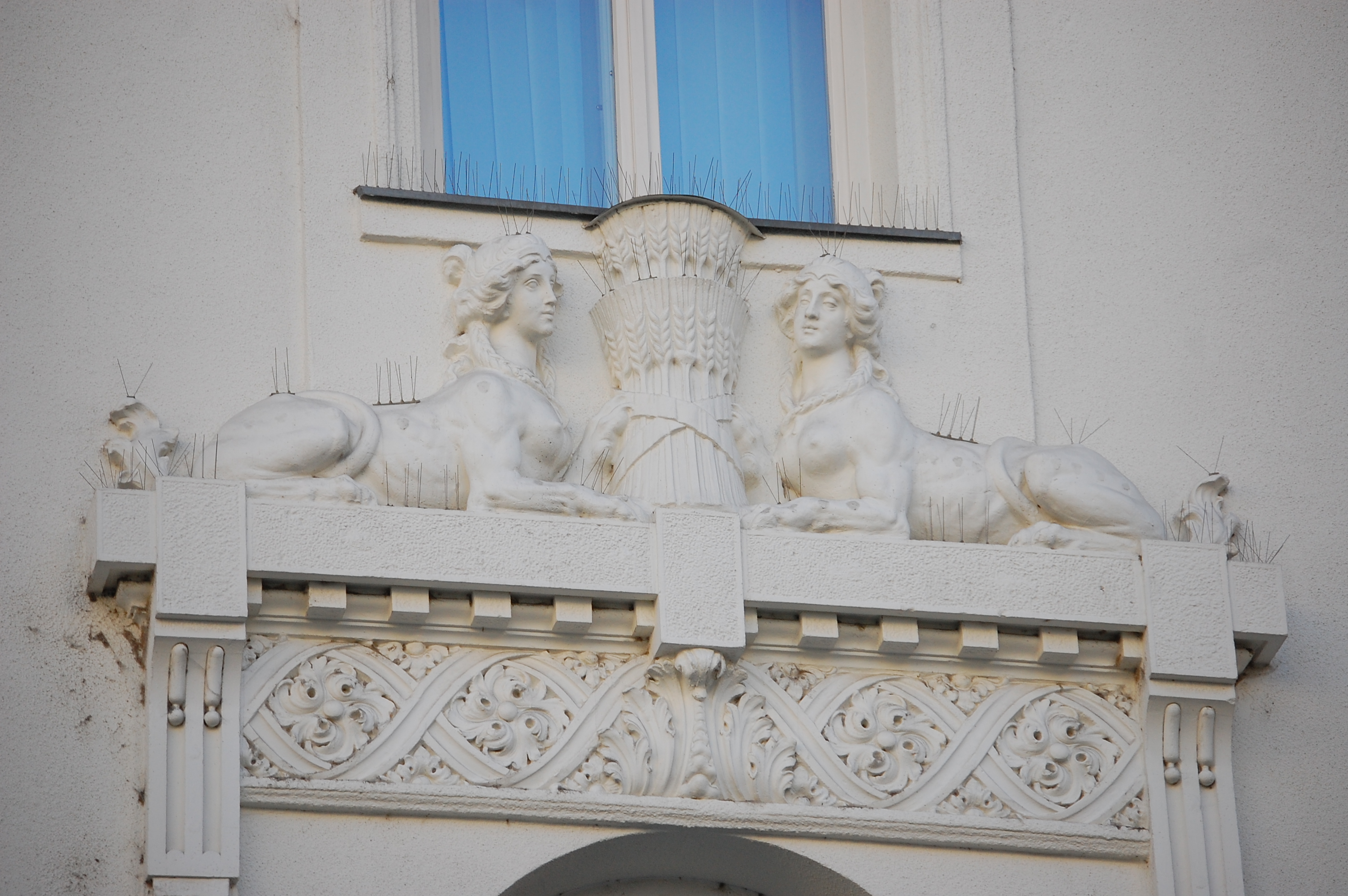 aki a fentebb elmondottaknak megfelelően nem áll egyedül, a másik oldalon ott van kissé törődöttebb társa. A poszt közreadása után figyelt fel a blog leghűségesebb, legszemfülesebb olvasója, e bejegyzésnek is a tervezés során legfőbb bátorítója, akitől egy szimmetrikus pozsonyi oroszlánpárt itt kölcsön is vettem, Szeifert Natália (és mindezekért hatalmas köszönet jár neki), hogy ez a két Thököly úti oroszlán azonos azzal, amit a pécsi Zsolnay-gyárban fentebb szecessziós hajviseletűnek neveztem — ez magyarázatot ad az egyik oroszlán furcsa sérülésére, és igazából az anyagra, ami nem valamilyen fém, hanem bizonyára itt is égetett agyag.