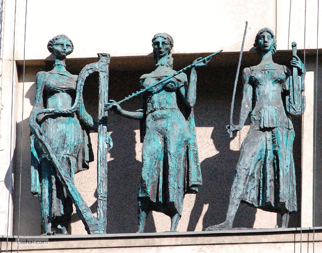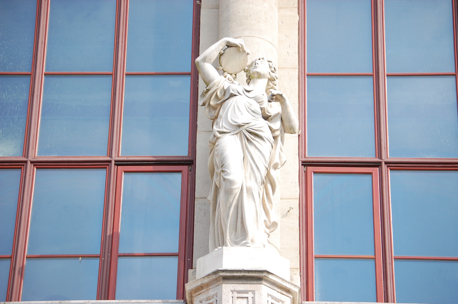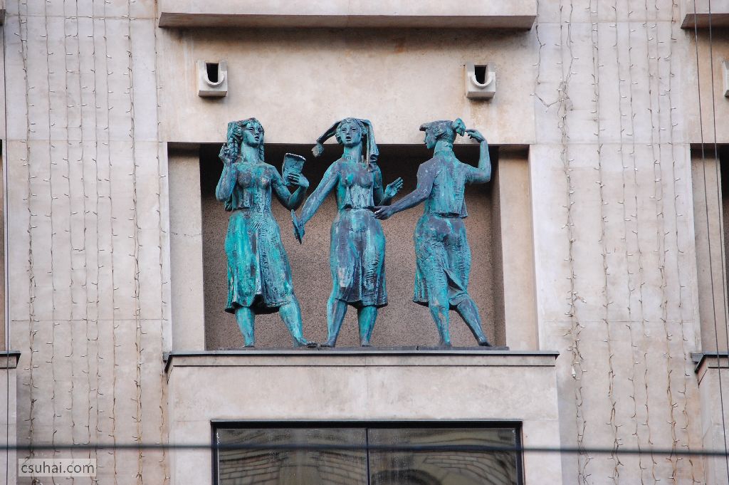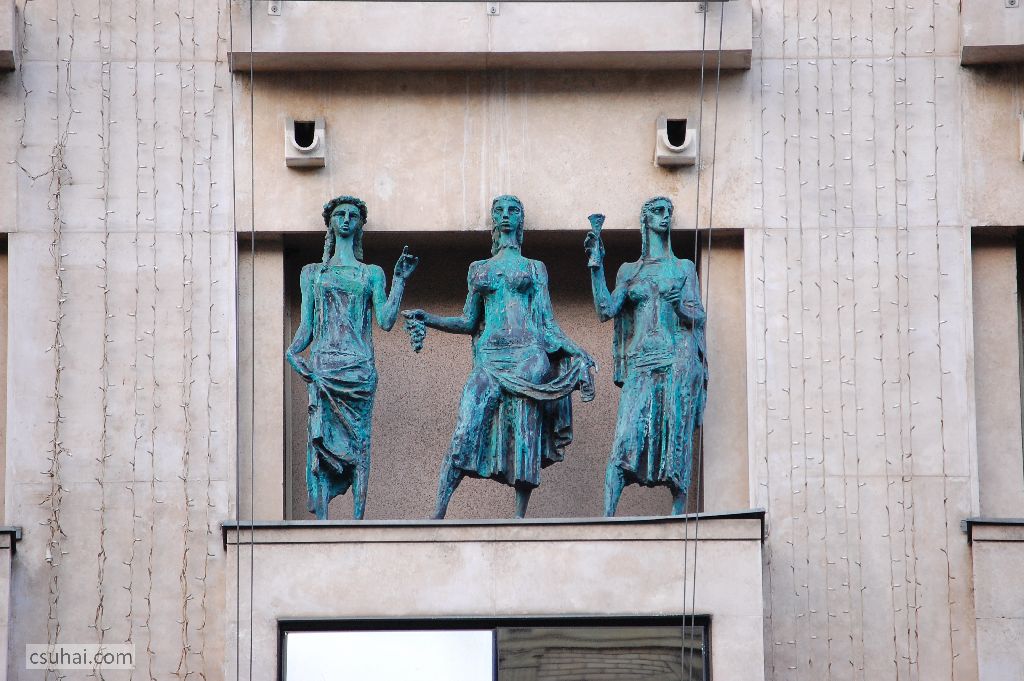 úgy, ahogyan még sohasem sikerült elkapnom, így egymás után kétszer is elsétáltam a színházhoz, hogy a blogban felfedhessem Budapest egyik rejtett szépségét, ezt az öt darab hármas csoportban álló nőt, a homlokzati rizalit hosszanti ablaknyílásai fölötti téglalap-mélyedések előtt elhelyezett tizenöt, egyenként 140 cm magas szobrot. Nem ez volt az első kísérletem velük,