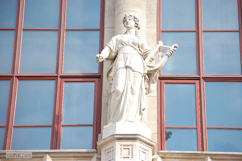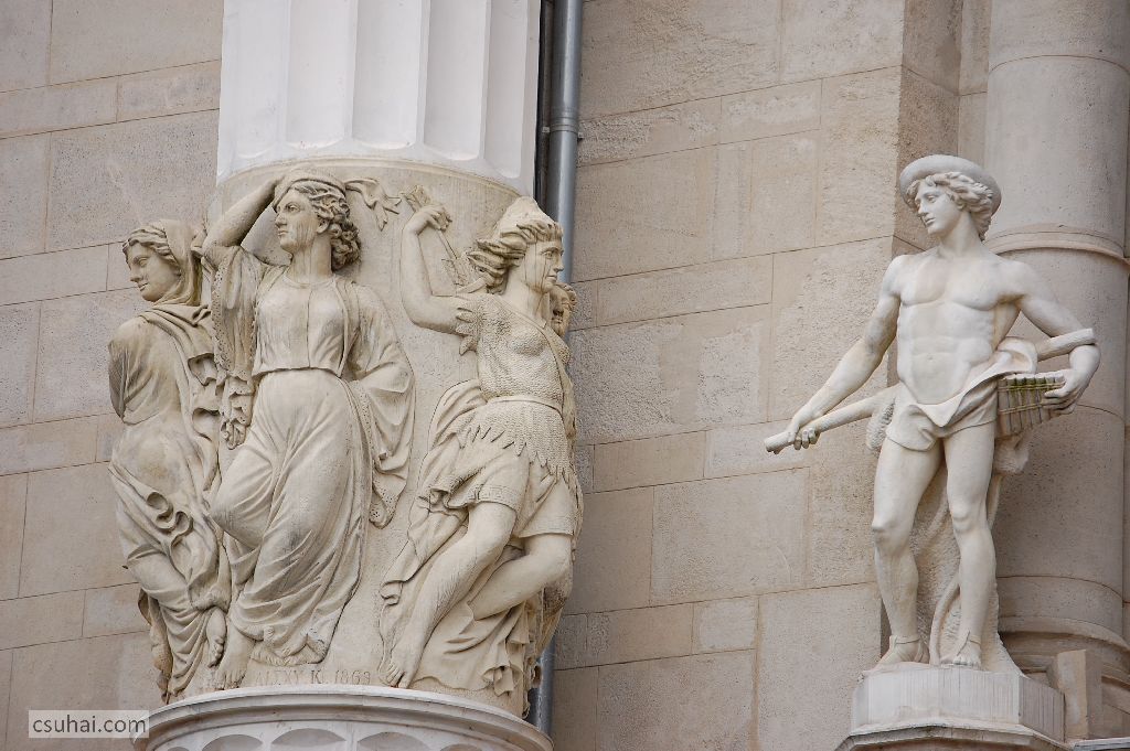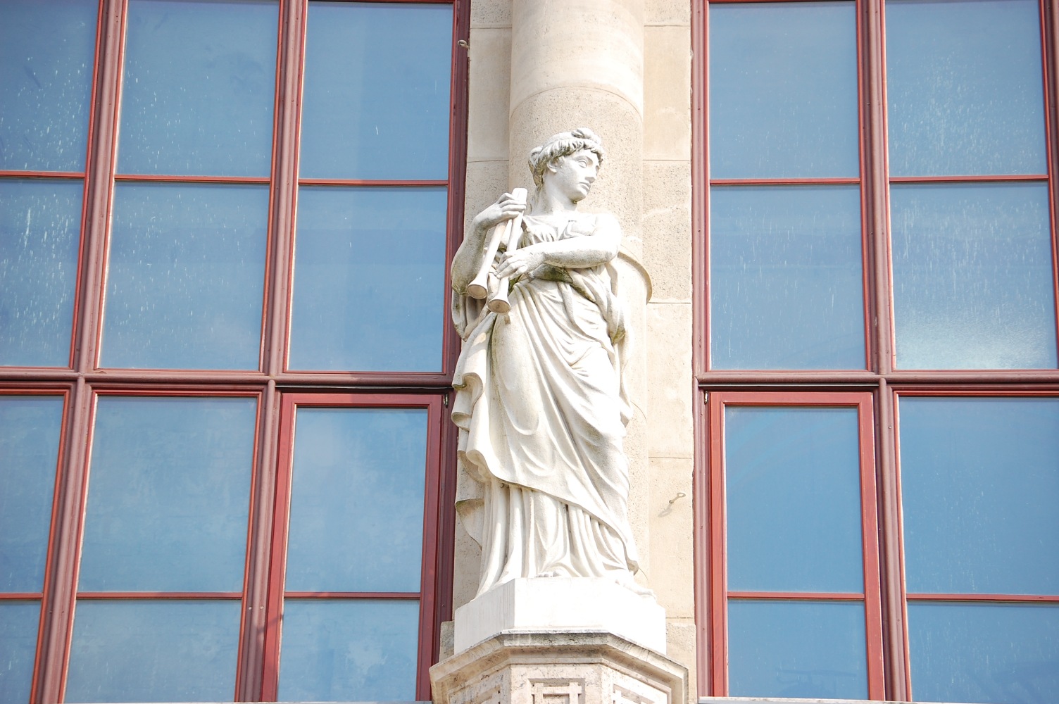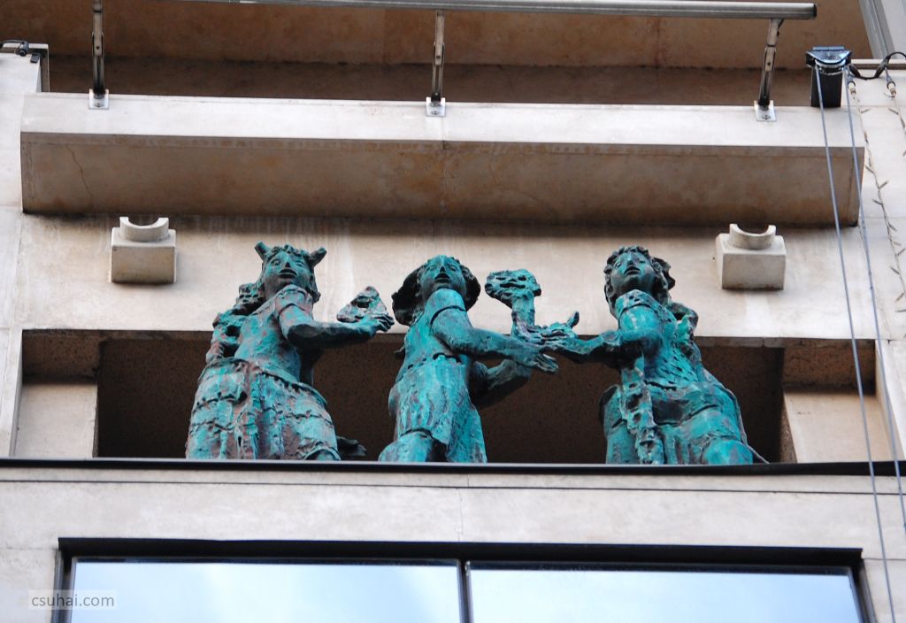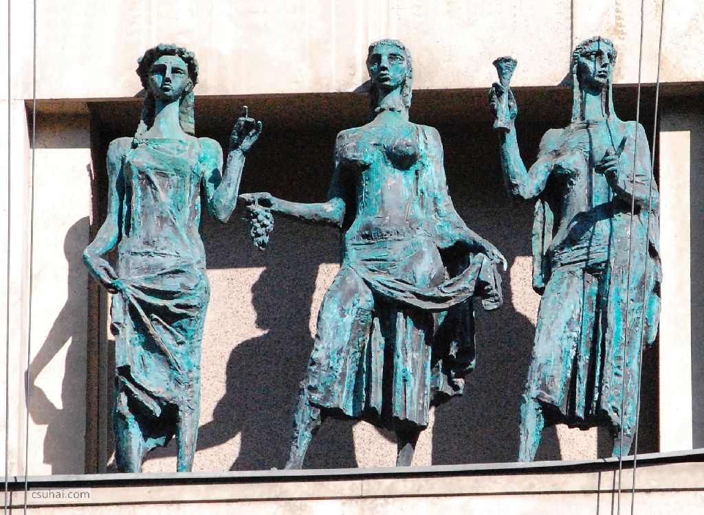 úgy, ahogyan még sohasem sikerült elkapnom, így egymás után kétszer is elsétáltam a színházhoz, hogy a blogban felfedhessem Budapest egyik rejtett szépségét, ezt az öt darab hármas csoportban álló nőt, a homlokzati rizalit hosszanti ablaknyílásai fölötti téglalap-mélyedések előtt elhelyezett tizenöt, egyenként 140 cm magas szobrot. Nem ez volt az első kísérletem velük,