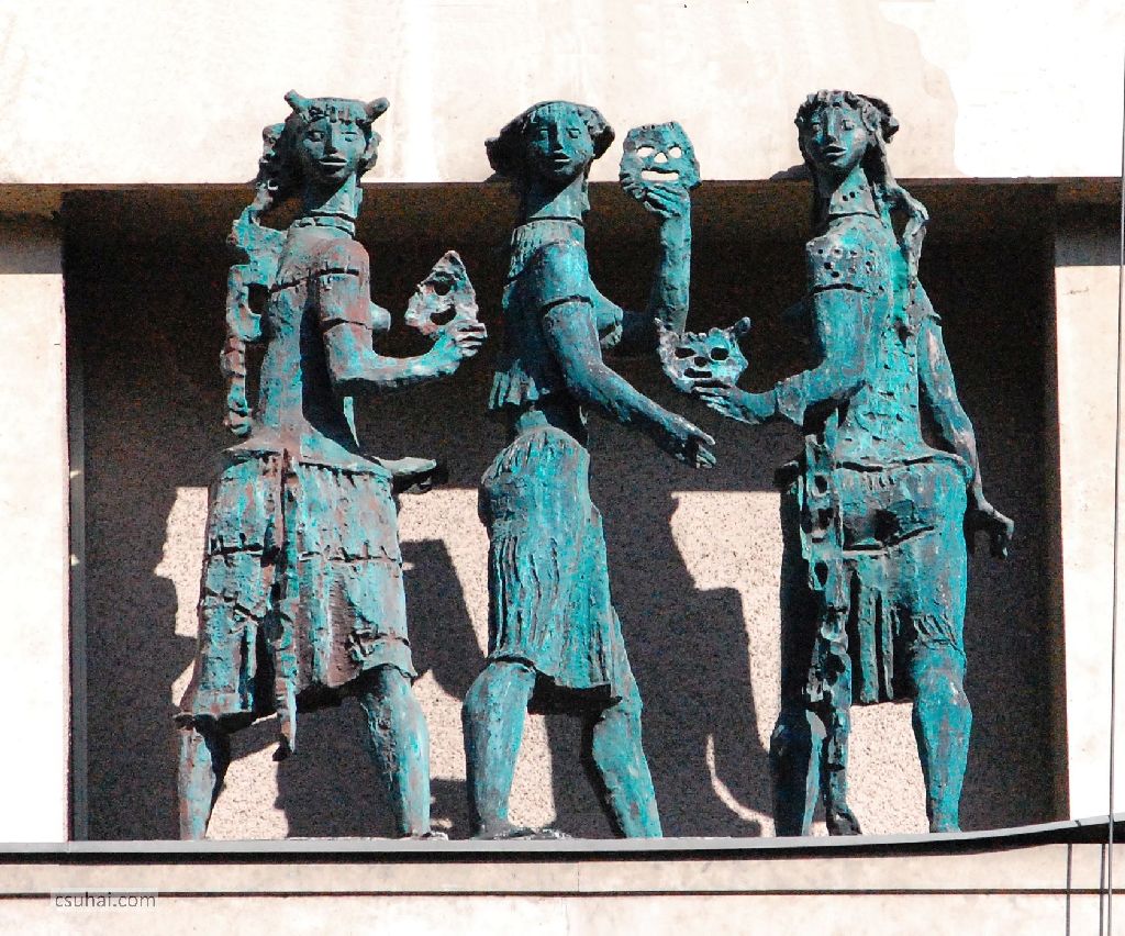 hanem mintegy utalnak a múzsákról való ismereteinkre. Ez a vagány könnyedség teszi őket egyedülállóvá, műgondjukkal fölötte állnak az utcai zsánerszobroknak, nem akarnak feltétlenül monumentálisak lenni, de világosan jelzik, hogy egy új korszakban születtek meg. Inkább a színház tematikájához éppen csak érintve kötődő plasztikai jelzések, amolyan “mesterségünk címere”-játékok, útmutatók az eltévedt utazó számára: itt vagyunk, ezek vagyunk, ha úgy akarod, mi vagyunk bent, de ha ahhoz van kedved, mi vagyunk kint. És vigyázz, mert néha eltűnünk ugyan, de mindig itt vagyunk, és nagyon is jól látjuk, éppen mit csinálsz.