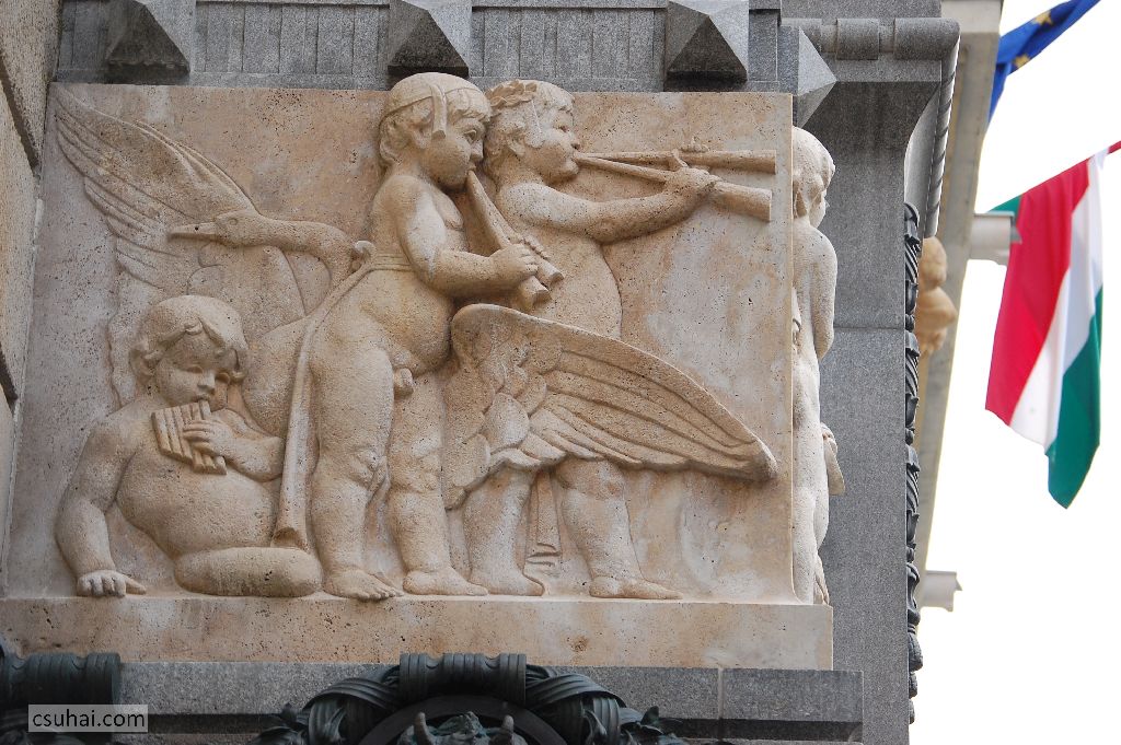 és Donáth Gyula Syrinxével, melyek Feszl tervein ugyancsak ott szerepeltek, de csak majdnem húsz évvel az épület avatása után, az építész életének utolsó hónapjaiban, 1884 nyarára kerültek a helyükre. Az indexikus jelleg (a múzsák és a hangszerek nagyon szabatos felvonultatásával), a funkció és a díszítő karakter itt egyértelmű, akárcsak a Zenekadémiát díszítő,