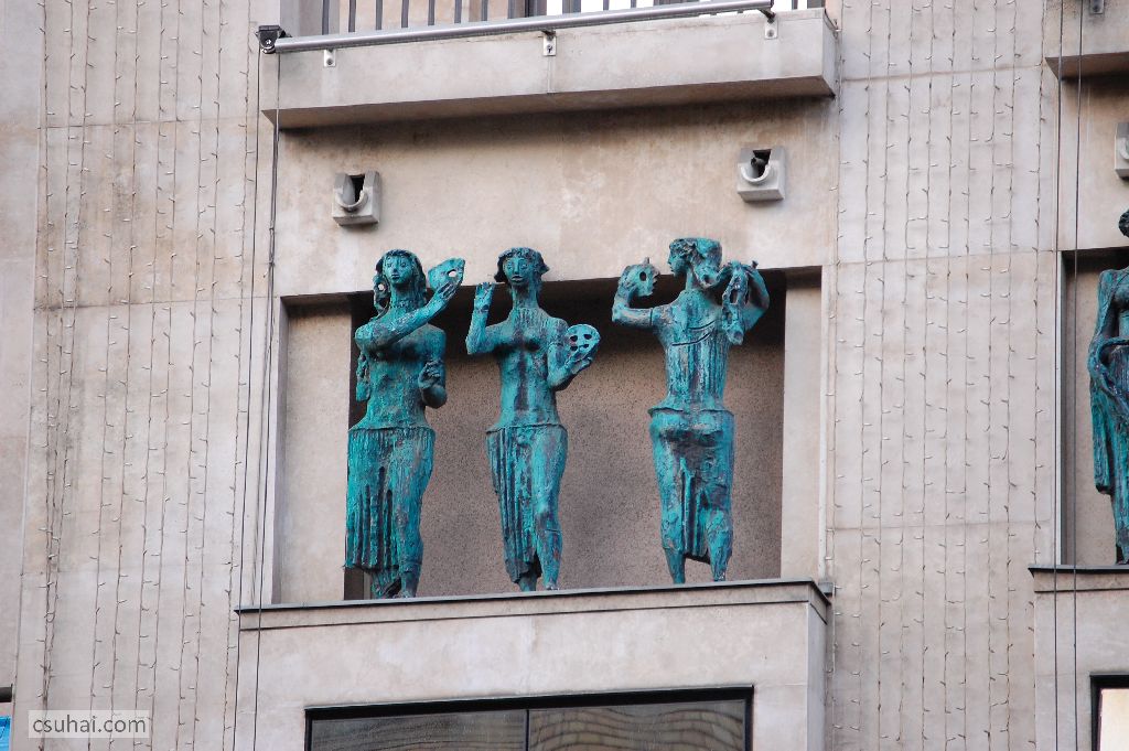 Nehéz az élet. Ha szobrot fényképezünk, nemcsak a nap és az évszakok változására kell figyelemmel lennünk, nemcsak arra tehát, hogy milyen szögből milyen fényt kap egy-egy szobor vagy hogy takarja-e már a dús tavaszi növényzet — néha egyéb, nem a csillagászat vezérelte körülményekre is. A körúti Madách Színház díszítőszobrainál, ennek a posztnak a főszereplőinél például arra, hogy az utóbbi évtizedekben bulvárszínházzá vált épület homlokzatát beborítják-e az újabb lényegéhez kötelezően hozzátartozó hatalmas reklámmolinók. Március elején véletlenül észrevettem, hogy a homlokzat üresen áll,