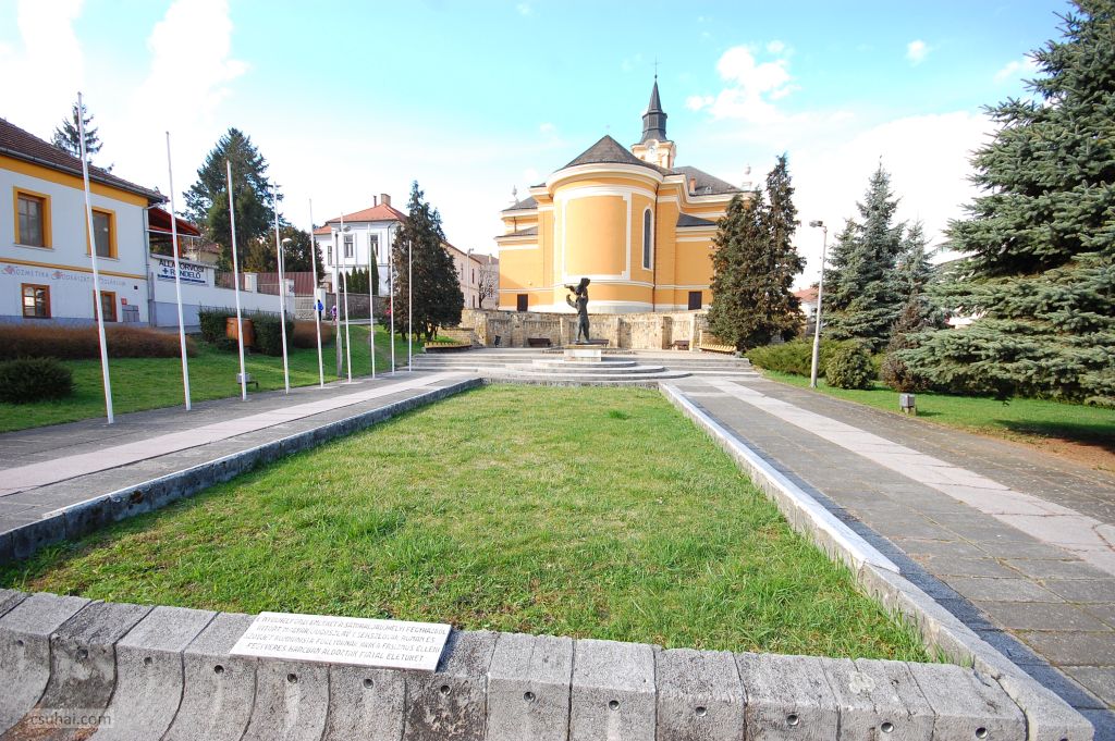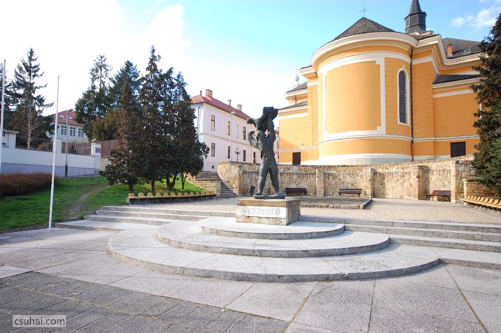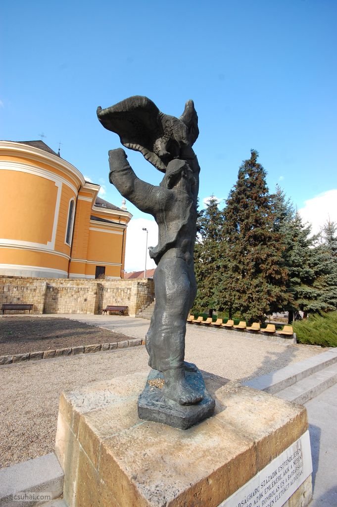 a Mártíremlékmű a templom apszisa mögött kialakított terecske végpontján,