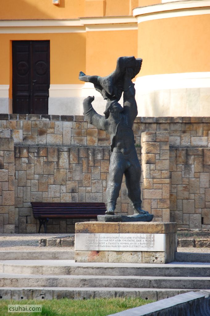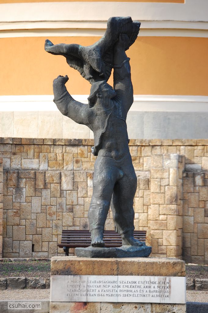 a poszt negyedik főhőse pedig Kerényi legelső, már az új rendszerben felállított reprezentatív munkája, első monumentális, témaválasztásában az új hatalom elvárásaihoz igazodó köztéri alkotása, a ma Sassal viaskodó fiúnak címzett szobor, eredetileg az 1944-es sátoraljaújhelyi börtönlázadásnak emléket állító Partizánemlékmű (mely viszont 1948-as felállítása óta rendületlenül áll eredeti helyén — ebben remélhetőleg szerepe van annak, hogy a szobor a maga korában kifejezetten üdítő, modernista műnek számított). Elegendő csak végigpörgetni a négy fenti képet, hogy világos legyen, a “derékhaddelhadd” pontosabban mire is utal.