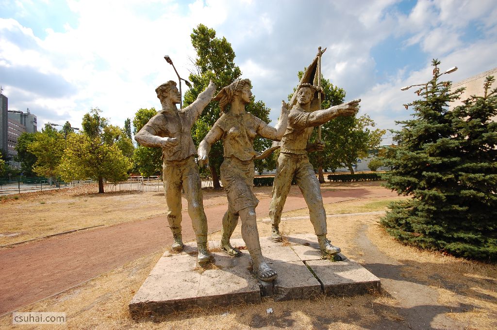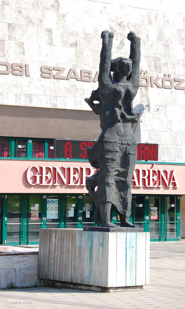 és 2011 óta a szobor nem a munkásmozgalmi hőstetteket, hanem a sportcsarnok előtt egy általánosabb, vagy ha úgy tetszik, sokkal földhözragadtabb győztesség elvét hirdeti,